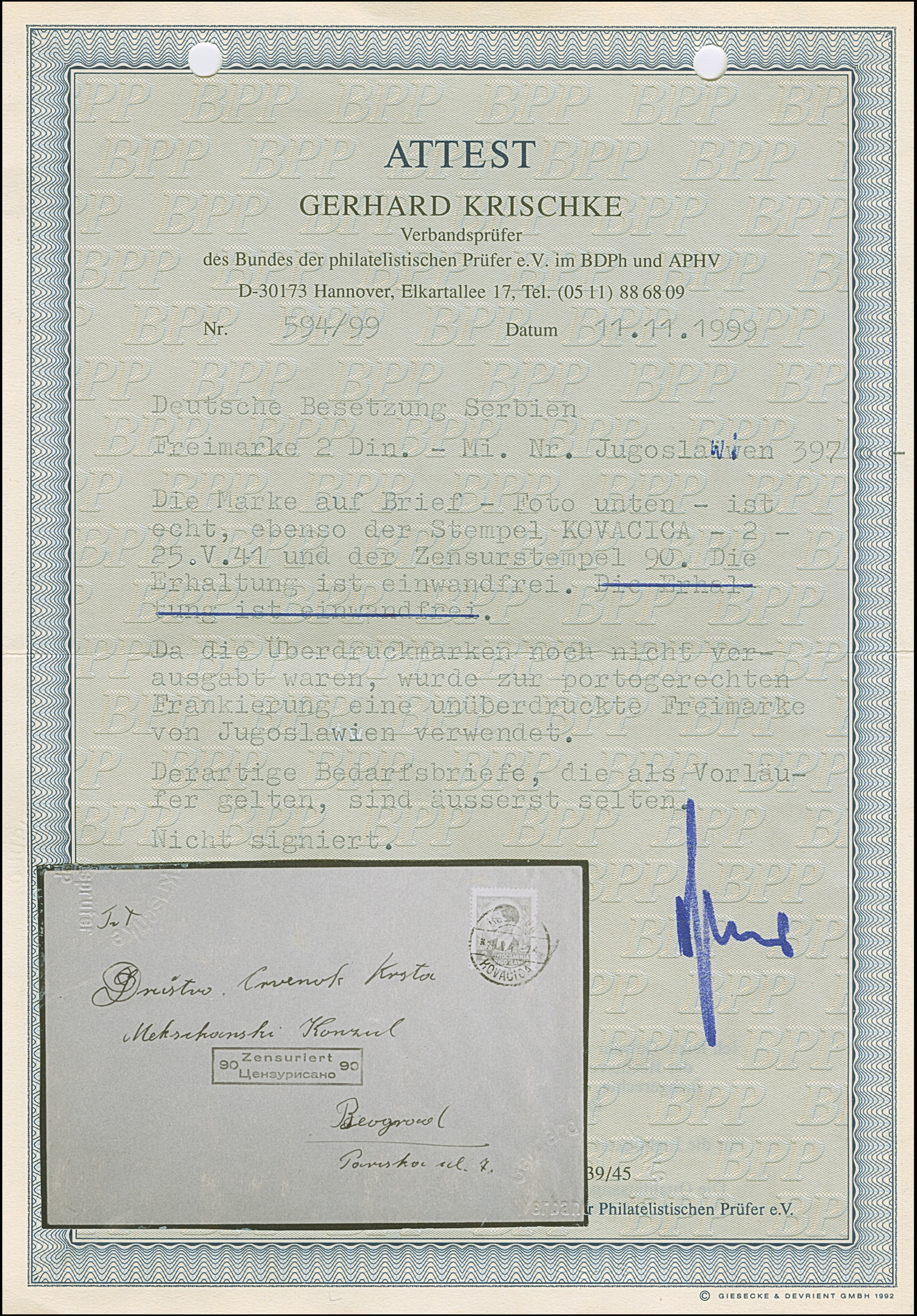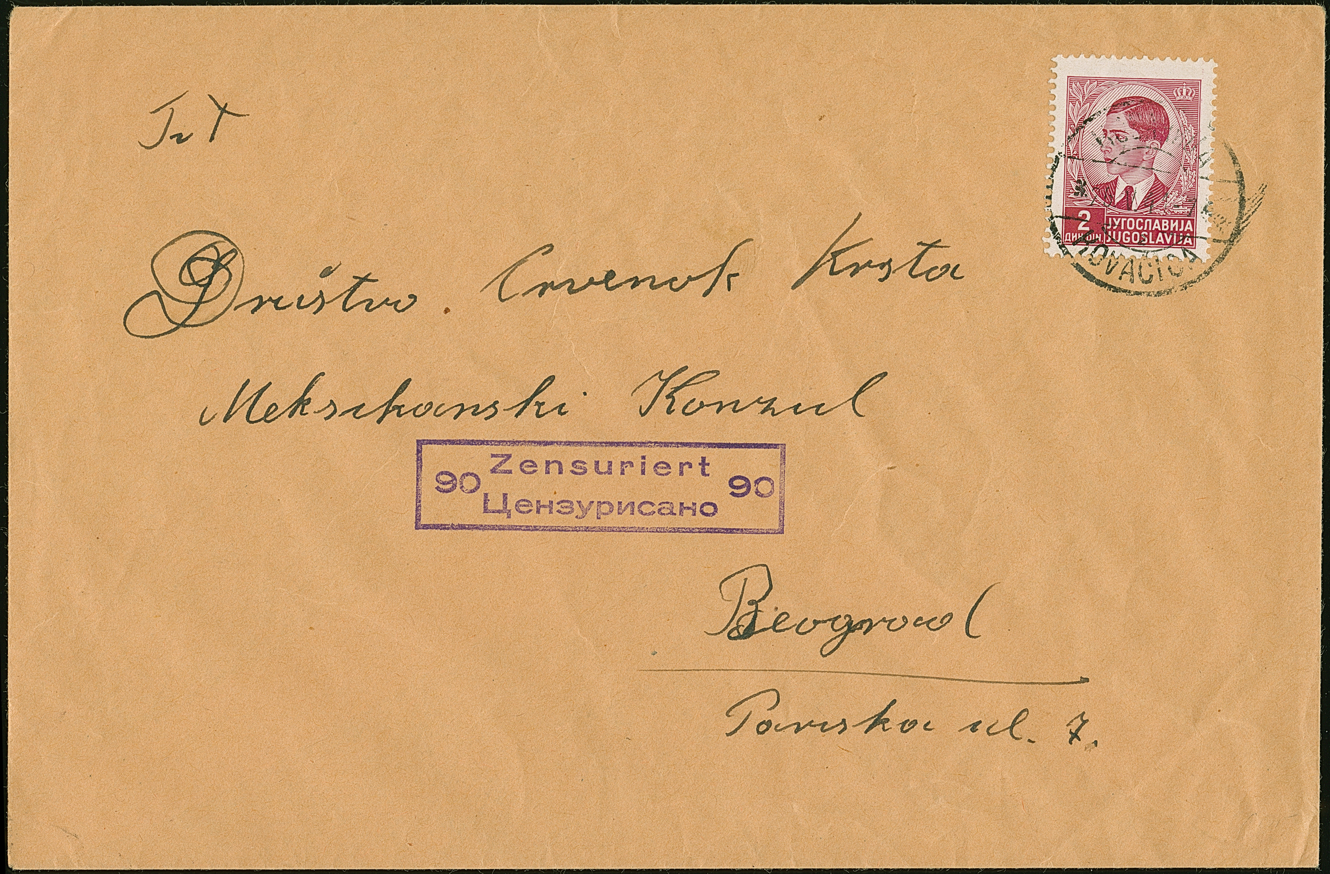 1941, König Peter II. 2 Dinar, sauber mit Stempel “KOVACICA 25.V.41” auf Brief mit nebengesetztem Zensur-Ra2 “Zensuriert 90” nach Belgrad, ein schöner und nicht häufiger Vorläuferbrief, Fotoattest Krischke BPP (1999)