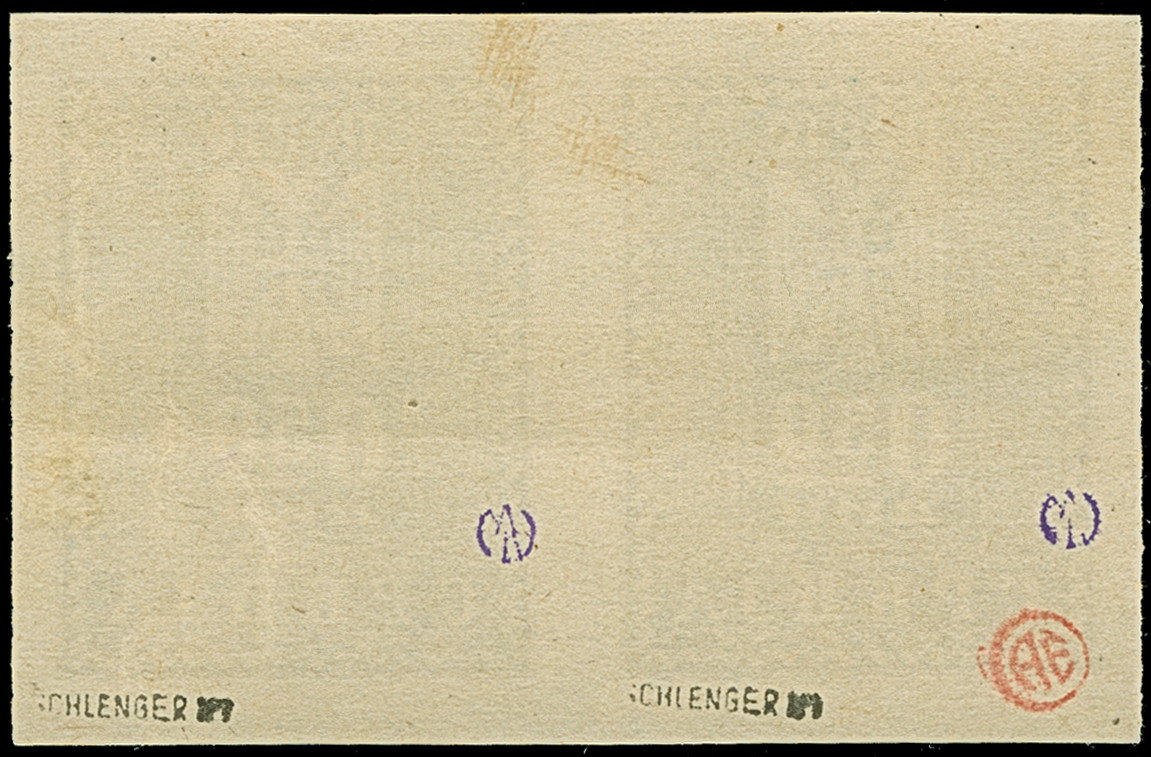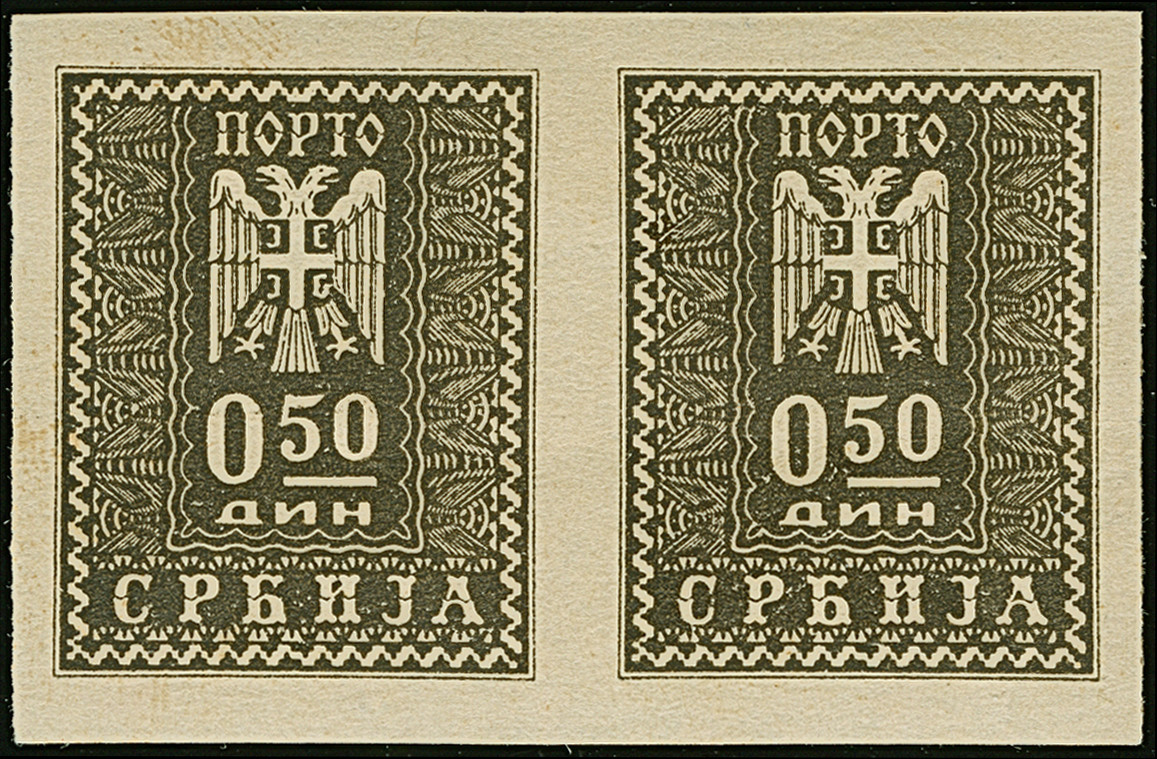 1943, ungezähnter Probedruck, 0,50 Dinar braunschwarz, waagerechtes Paar auf ungummiertem Papier, winzig knittrig, sonst tadellos, u.a. sign. Schlenger BPP sowie Fotoattest Dr. Zydek BPP (1991)
