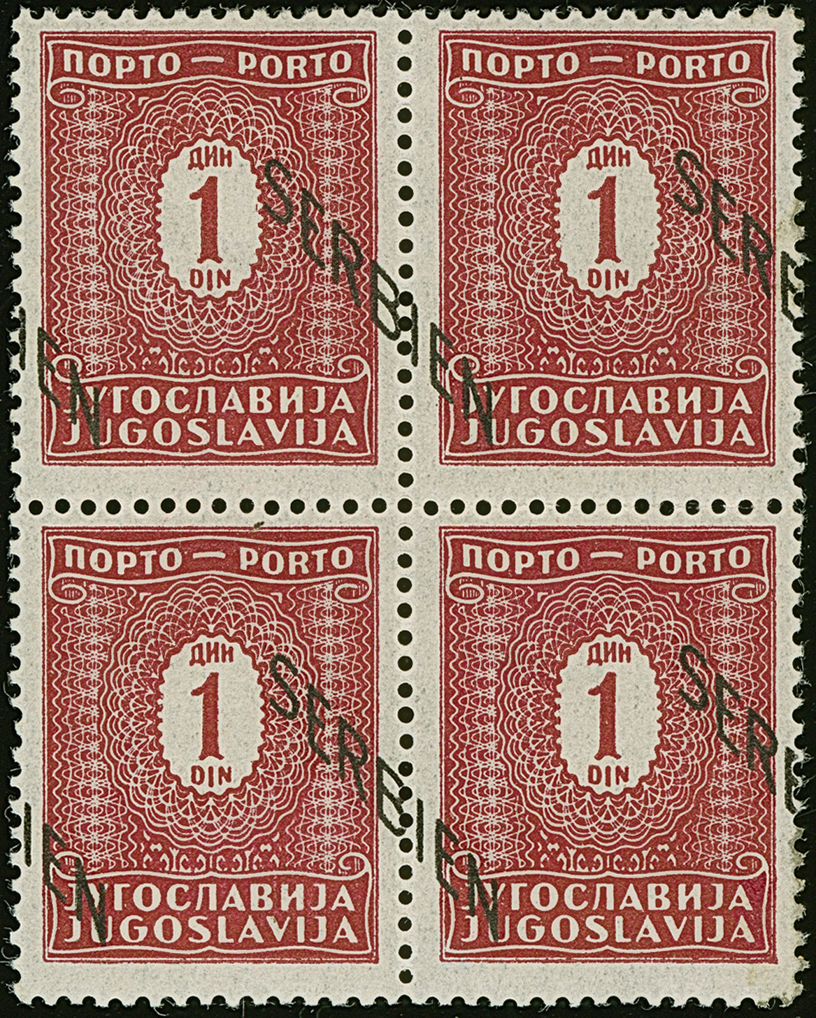 1941, 1 Dinar schwärzlichrötlichkarmin, mit stark nach rechts unten verschobenem Aufdruck, dadurch der Aufdruck auf den Marken geteilt, Viererblock, postfrisch, tadellos, eine seltene Abart, sign. und Fotoattest Brunel BPP (2007)