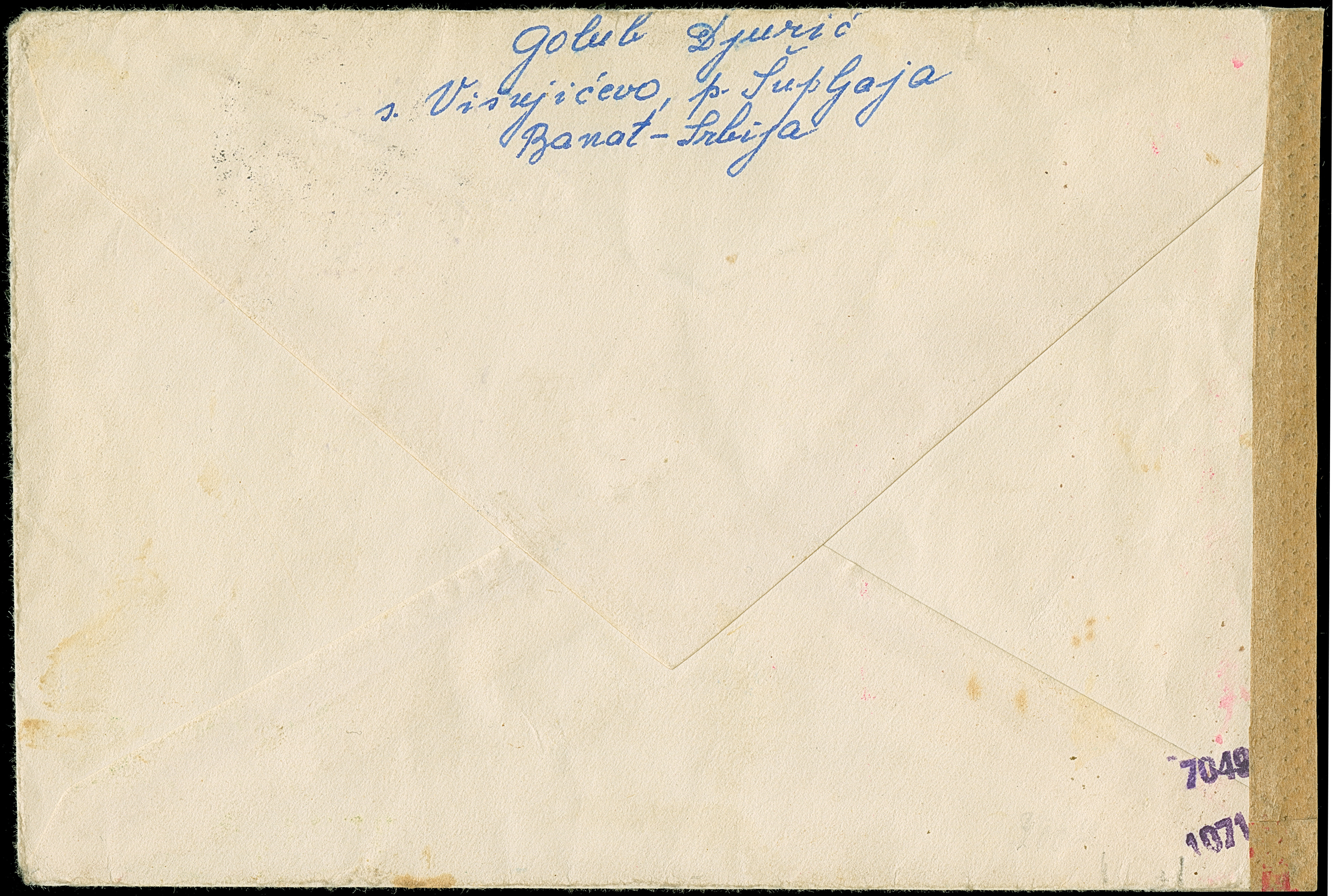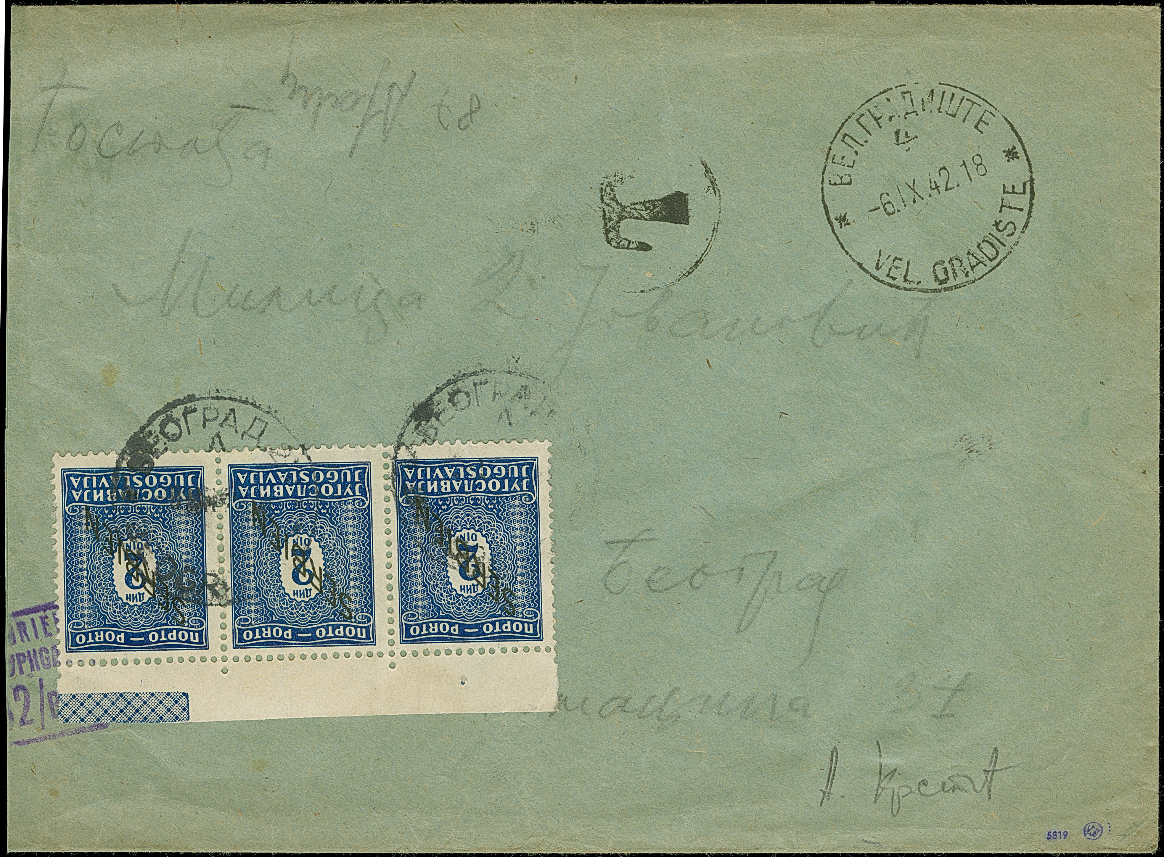 1941, 2 Dinar, waagerechter Oberrand-Dreierstreifen, sauber mit Stempel “BEOGRAD” auf in “VEL. GRADISTE -9.IX.42” unfrankiert aufgegebenem Briefkuvert, nebengesetzte Tax- sowie Zensurstempel, der Umschlag links gering verkürzt, sonst gute Erhaltung, sign.