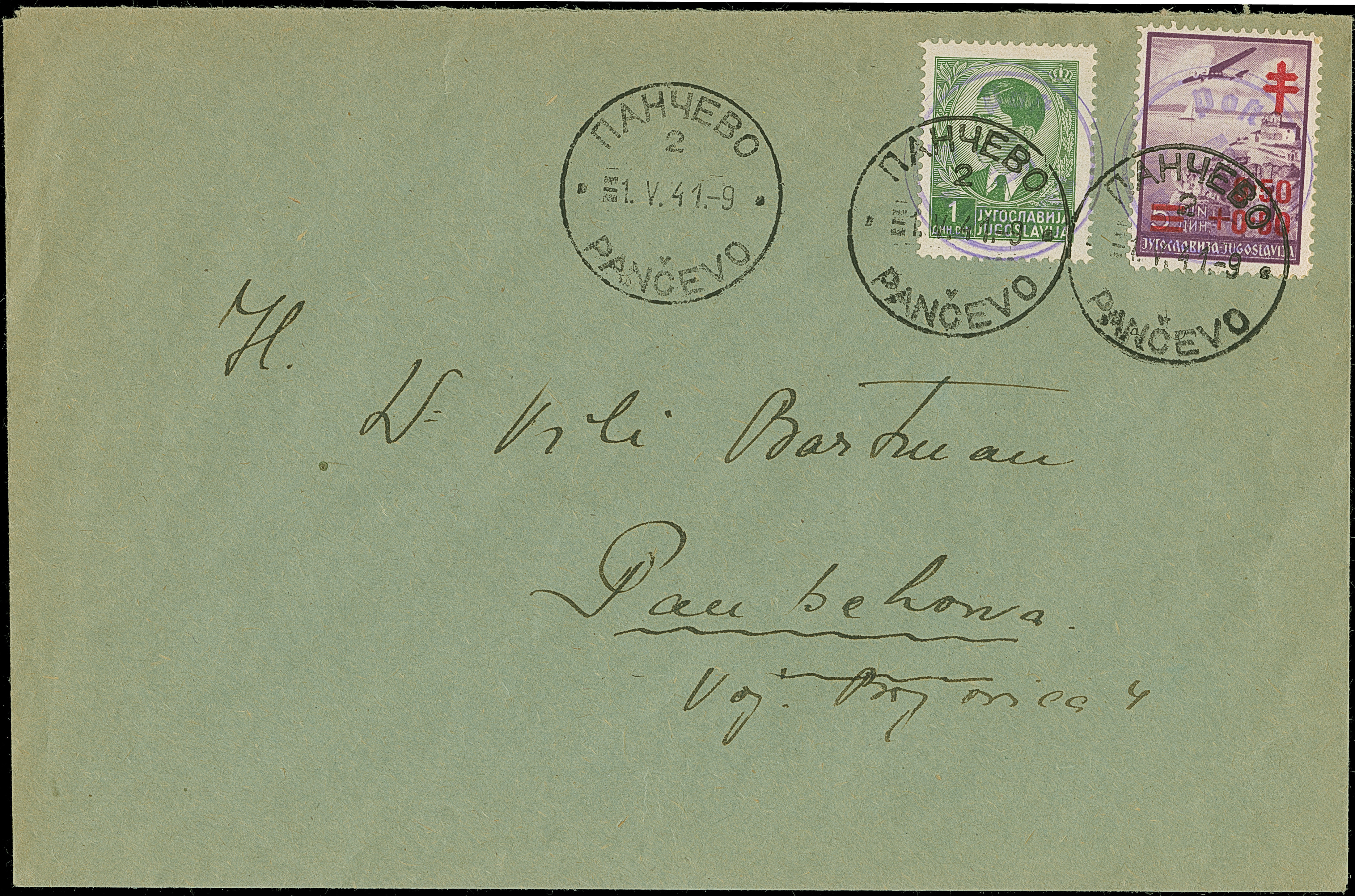 PANTSCHOWA-PROVISORIUM: Handstempelaufdruck “POST PANTSCHOWA” auf Jugoslawien Tuberkulosebekämpfung 0,50 Dinar und König Peter II. 1 Dinar grün, mit Stempel “PANCEVO -1.V.41” auf Ortsbrief, tadellos, Befund Kleymann (2016)
