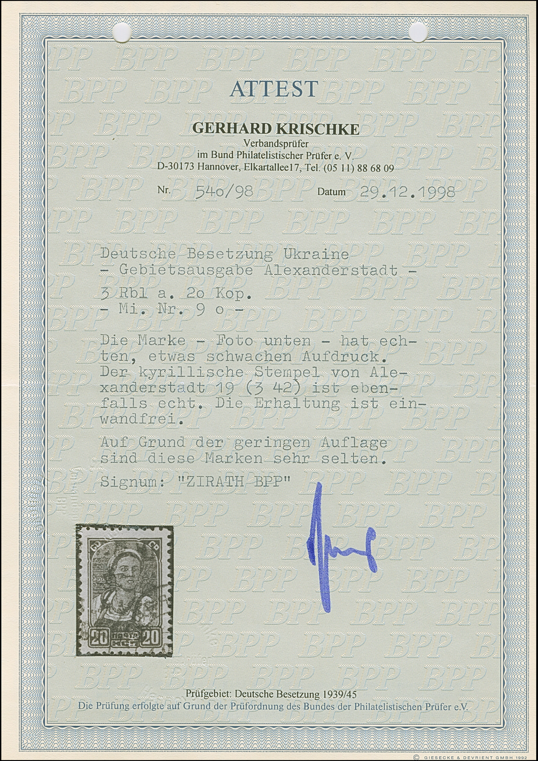 1942, Aufdrucktype III Hakenkreuz 4mm: 3 Rubel auf 20 Kopeken schwarzgelbgrün, farbfrisch und gut gezähnt, sauber Teilabschlag des kyrillischen Stempels von “ALEXANDERSTADT” entwertet, tadellos, eine sehr seltene Marke, sign. Zirath BPP sowie Fotoattest Krischke BPP (1998)
