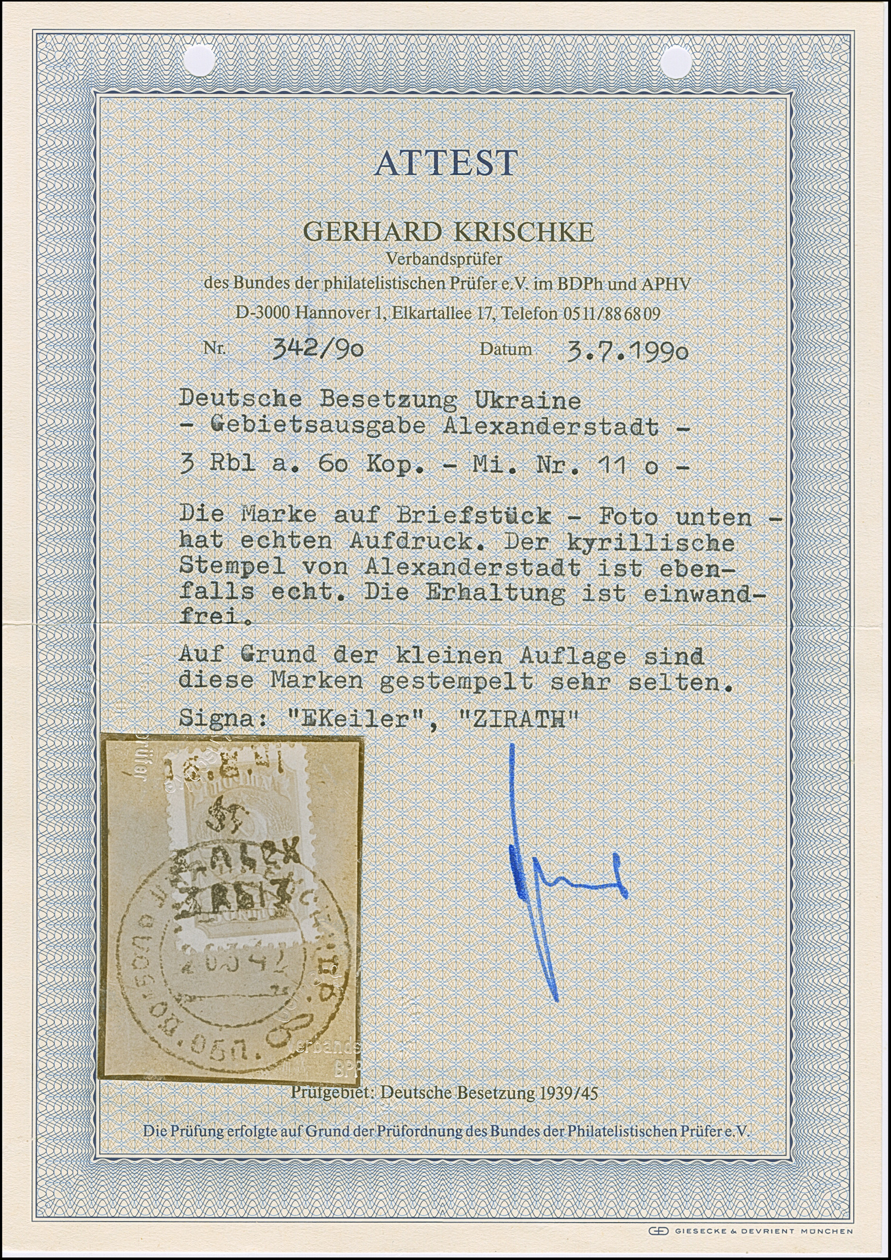 1942, Aufdrucktype II, Hakenkreuz 6mm: 1,50 Rubel auf 15 Kopeken dunkelgraugrün, farbfrisch und gut gezähnt, sauber mit kyrillischem Stempel “ALEXANDERSTADT -9 3 42” auf Briefstück, tadellos. Eine sehr seltene Marke, ProFi hat lediglich 8 gebrauchte Stücke registriert, sign. Zirath BPP sowie EKeiler und Fotoattest Krischke BPP (1984)