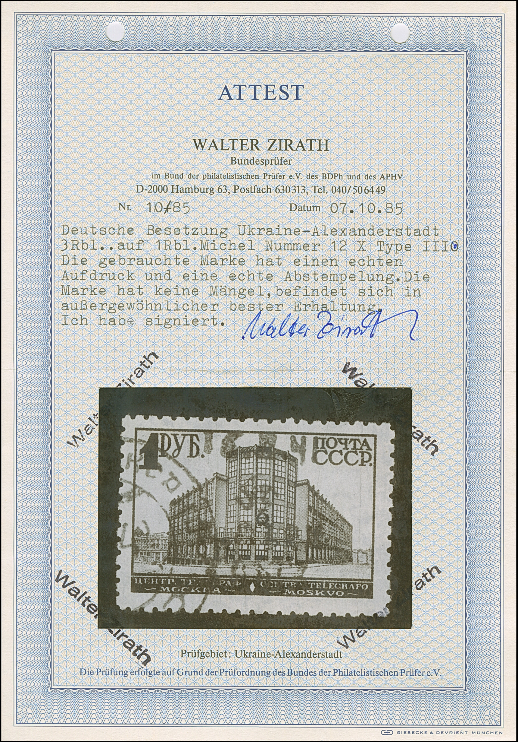 1942, Aufdrucktype III Hakenkreuz 4mm: 3 Rubel auf 1 Rubel schwärzlichblau, Wasserzeichen “Winkelmuster", farbfrisch und gut gezähnt, sauber gestempelt, tadellos, eine sehr seltene Marke, ProFi hat in gebrauchter Erhaltung lediglich 16 Stück registriert, sign. Zirath BPP mit Fotoattest (1985)