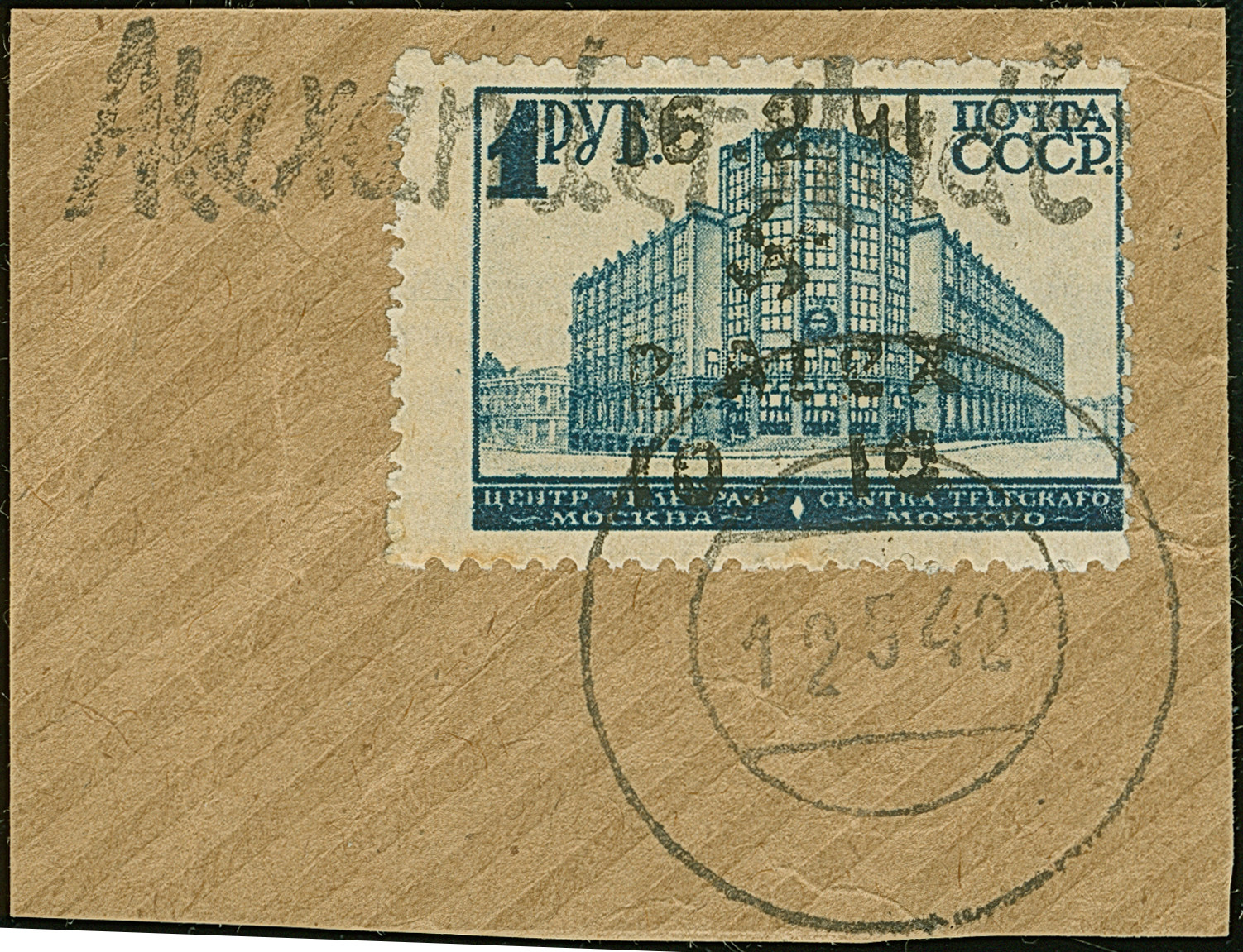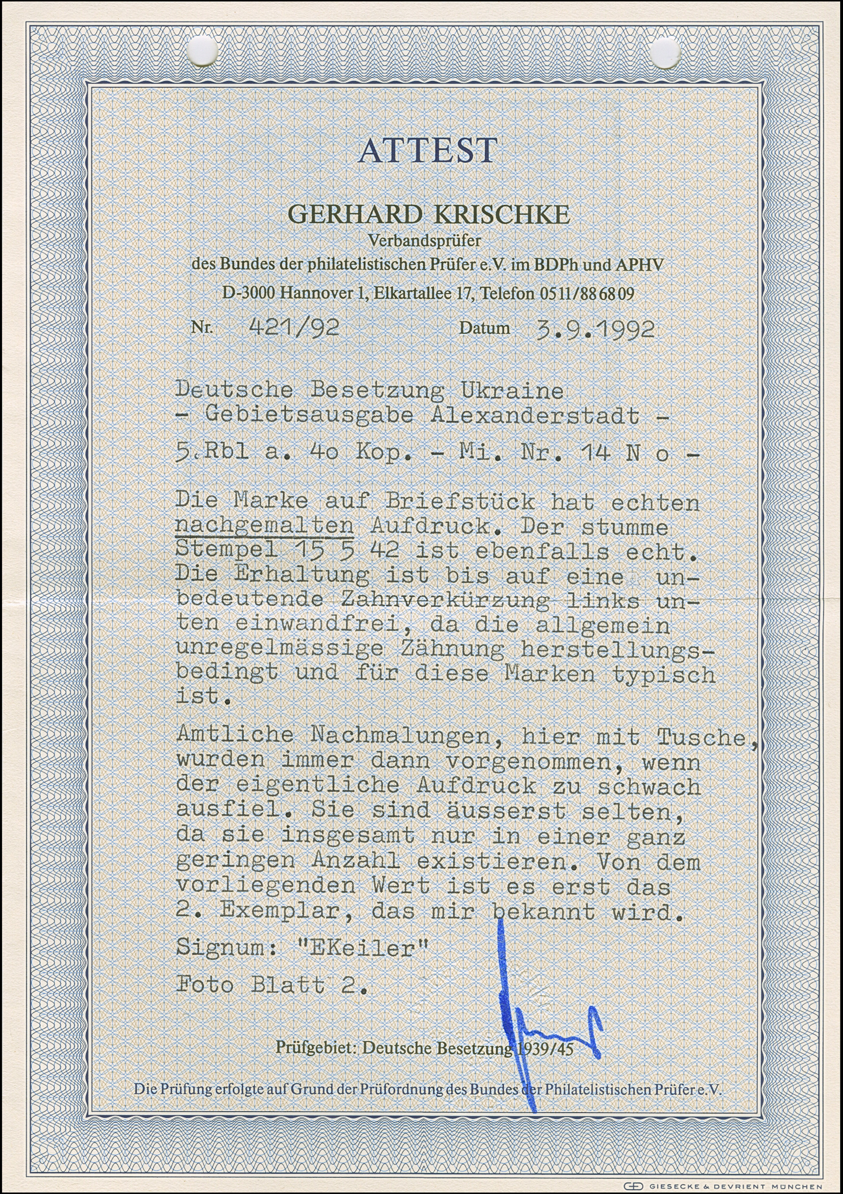 1942, Aufdrucktype III, Hakenkreuz 4mm: 1,50 Rubel auf 5 Kopeken bräunlichrot, farbfrisch und gut gezähnt, sauber mit L1 “Alexanderstadt” und stummem Stempel “14 5 42” auf Briefstück, tadellos. Eine der ganz großen Seltenheiten mit einer Auflage von lediglich 15 Stück, sign. EKeiler sowie Fotoatteste Zirath (1995) und Krischke (2009)