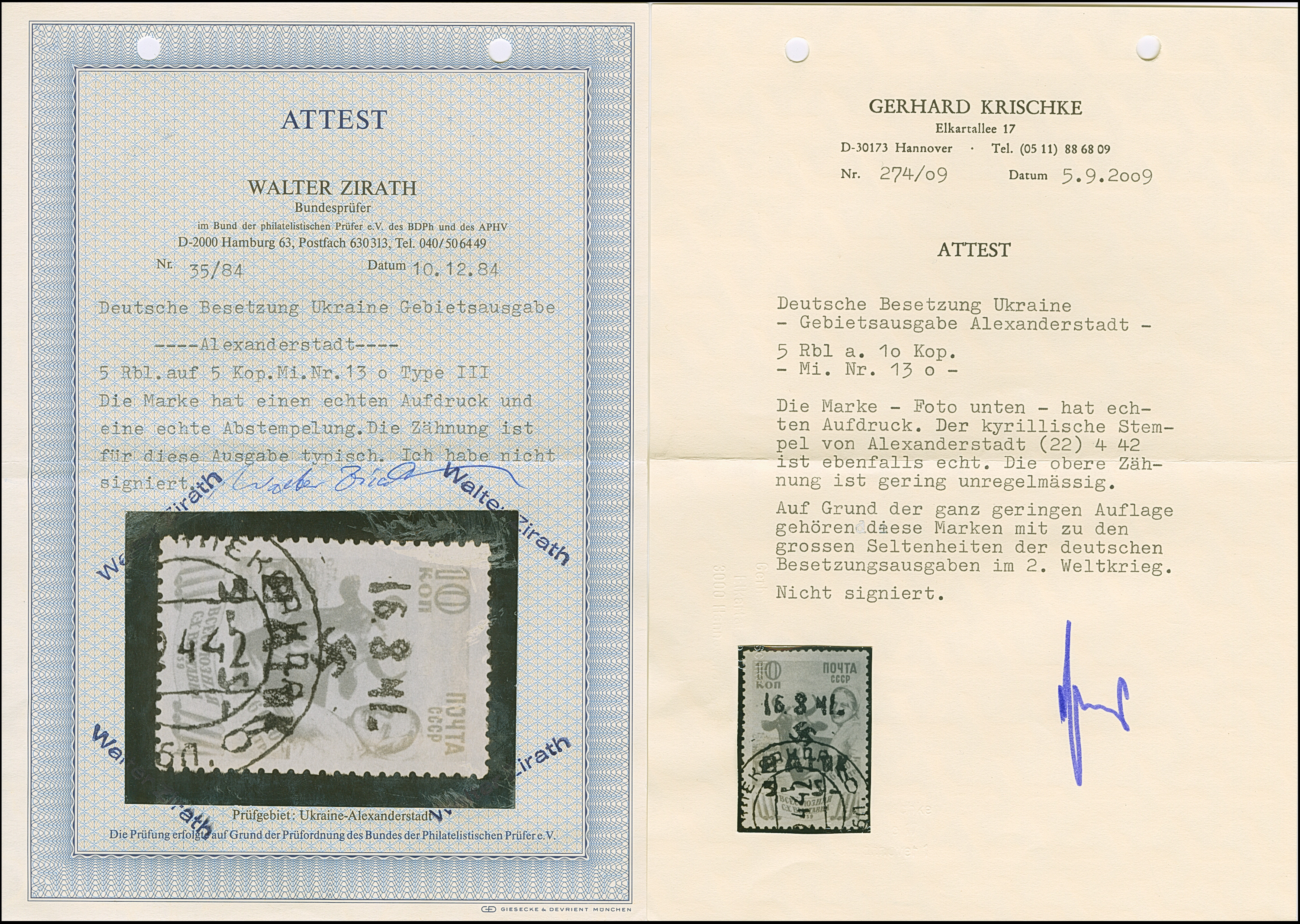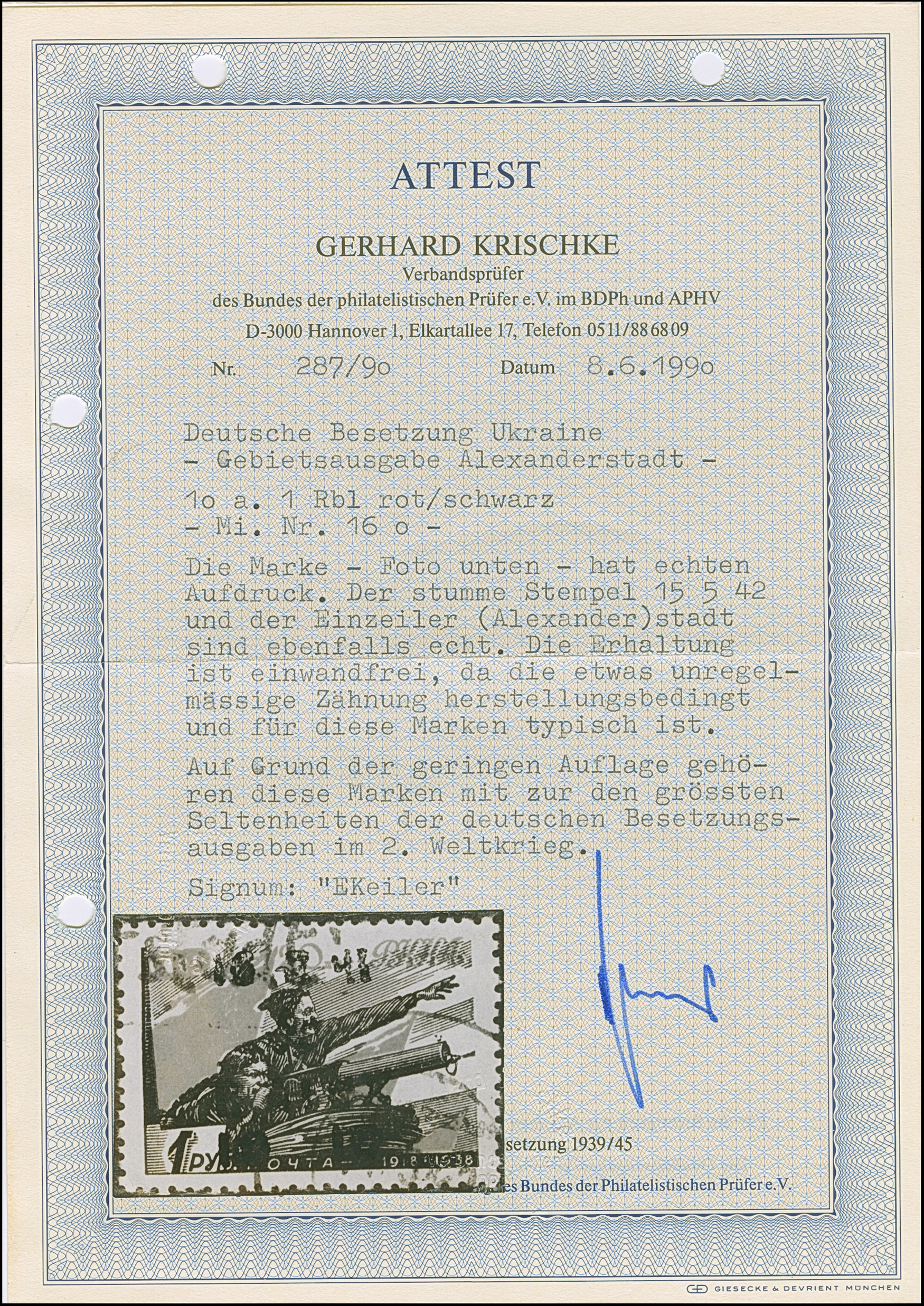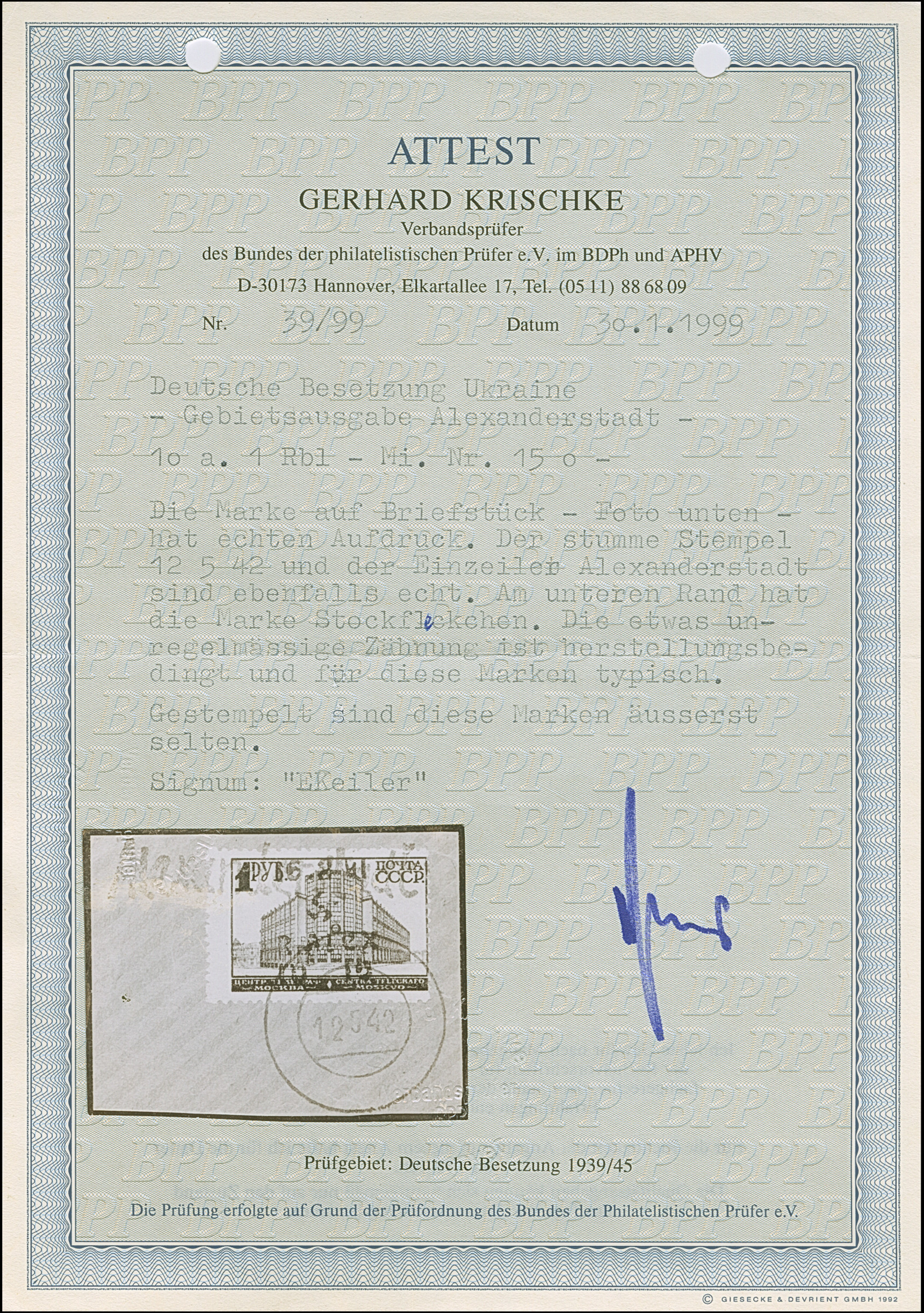 1942, Aufdrucktype III Hakenkreuz 4mm: 10 Rubel auf 1 Rubel schwärzlichblau, farbfrisch und üblich gezähnt, sauber mit L1 “Alexanderstadt” und stummem Stempel “12 5 42” auf Briefstück, wie oft bei dieser Marke, winzig fleckig, sonst tadellos, sign. EKeiler und Fotoattest Krischke BPP (1999)