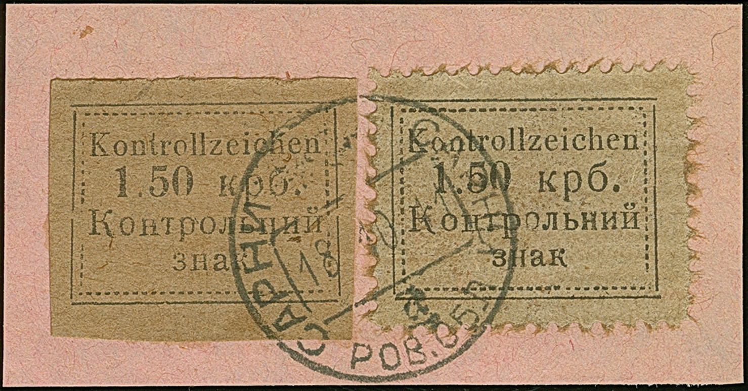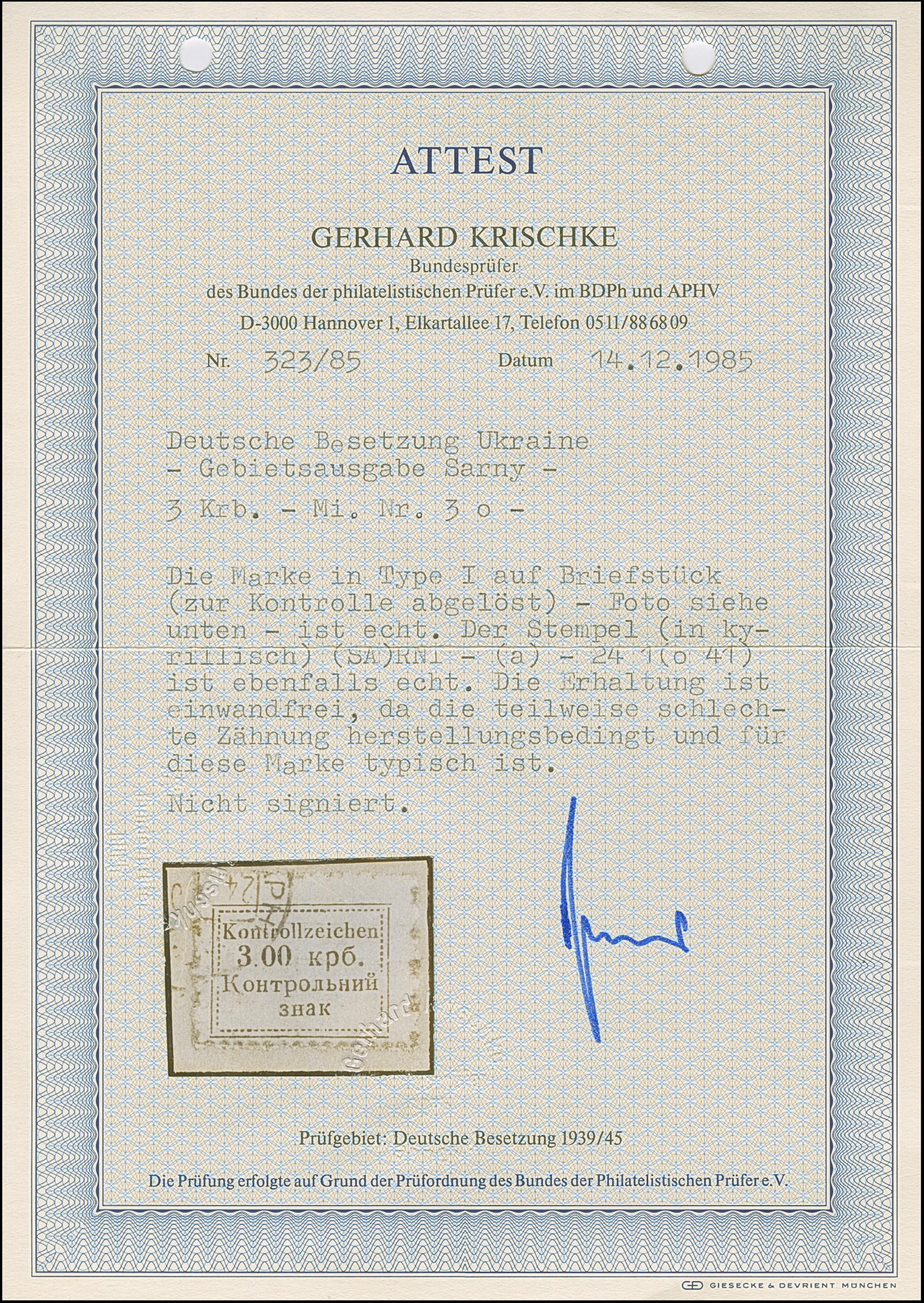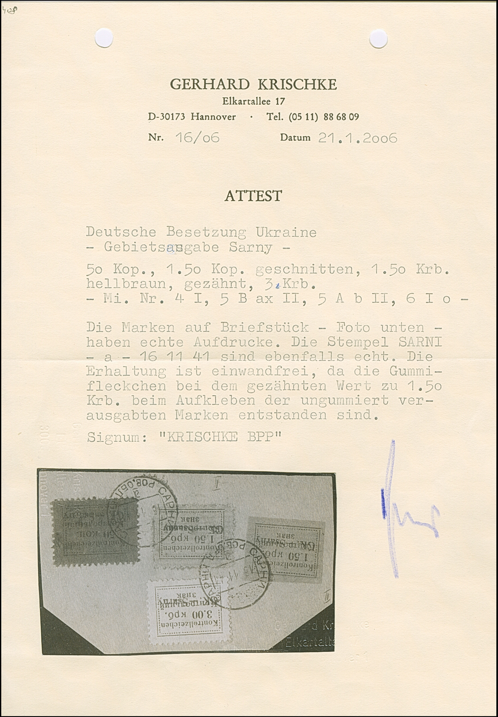 1941, Kontrollzeichen mit Aufdruck 50 K. und 3 Krb. sowie 1,50 Krb. geschnitten sowie gezähnt auf waagerecht gestreiftem Papier, sauber mit Stempel “SARNI 16 11 41” auf Briefstück, tadellos, sign. Krischke BPP sowie Fotoattest Krischke (2006)