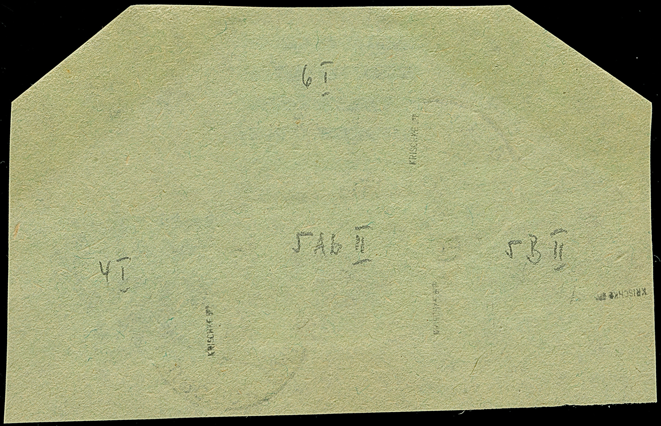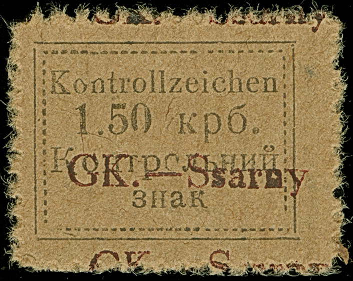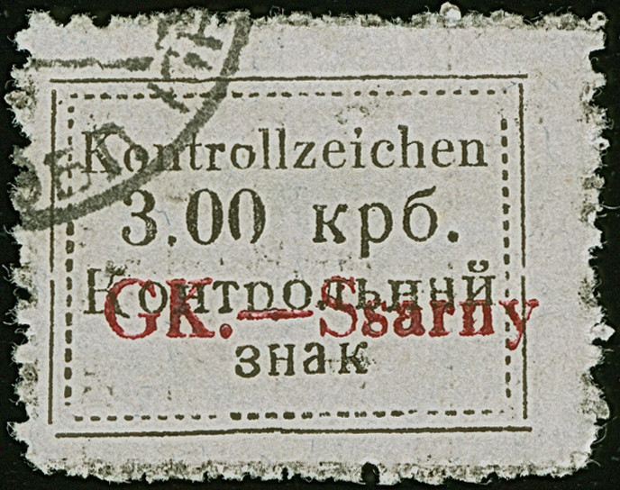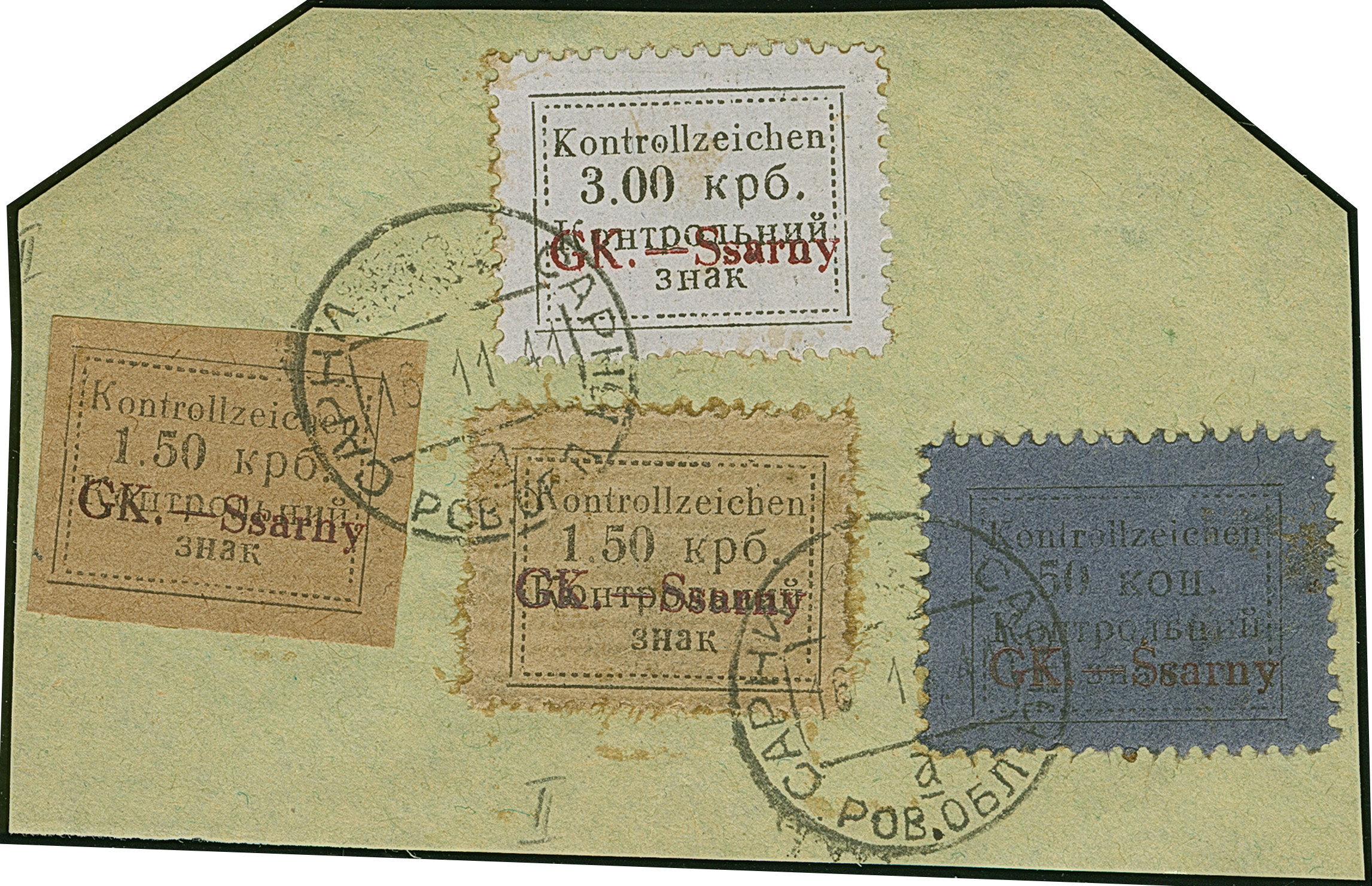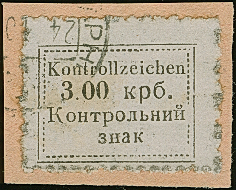 1941, Kontrollzeichen mit Aufdruck 50 K. und 3 Krb. sowie 1,50 Krb. geschnitten sowie gezähnt auf waagerecht gestreiftem Papier, sauber mit Stempel “SARNI 16 11 41” auf Briefstück, tadellos, sign. Krischke BPP sowie Fotoattest Krischke (2006)