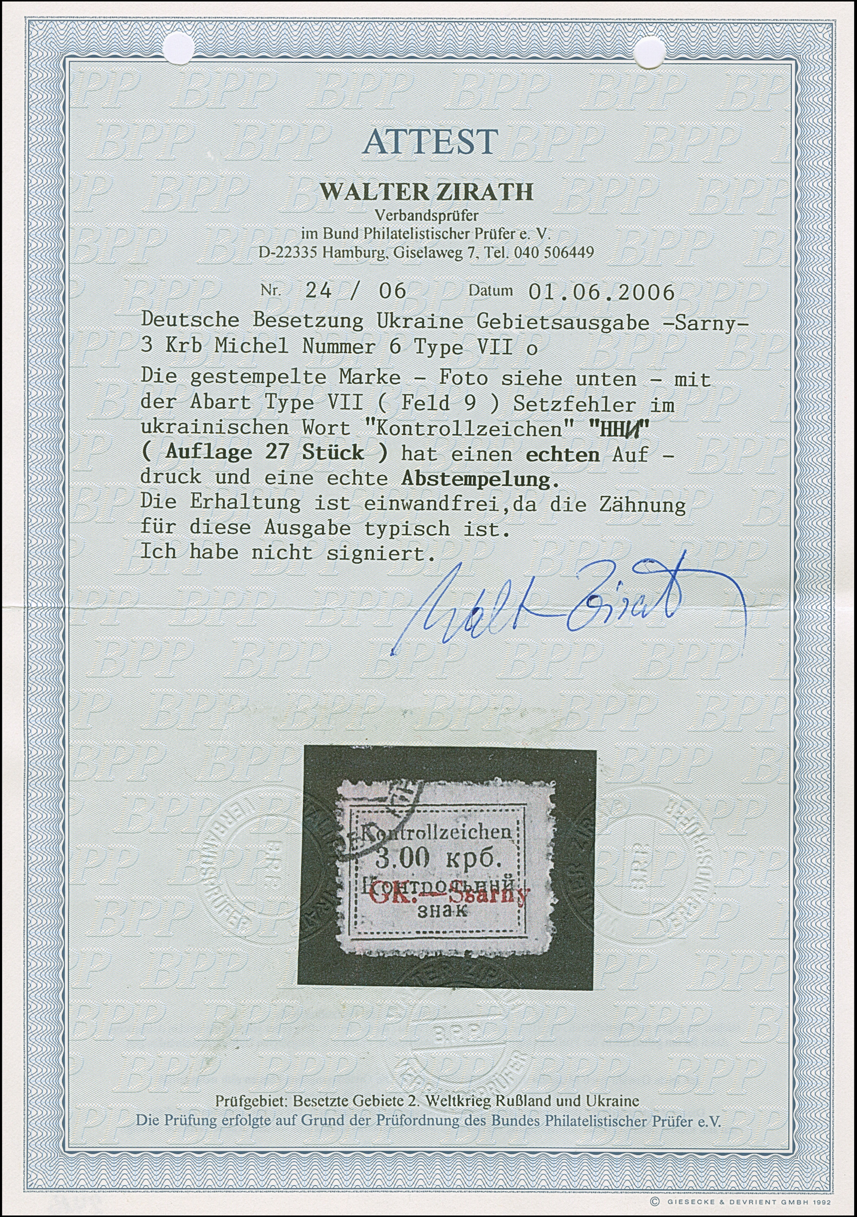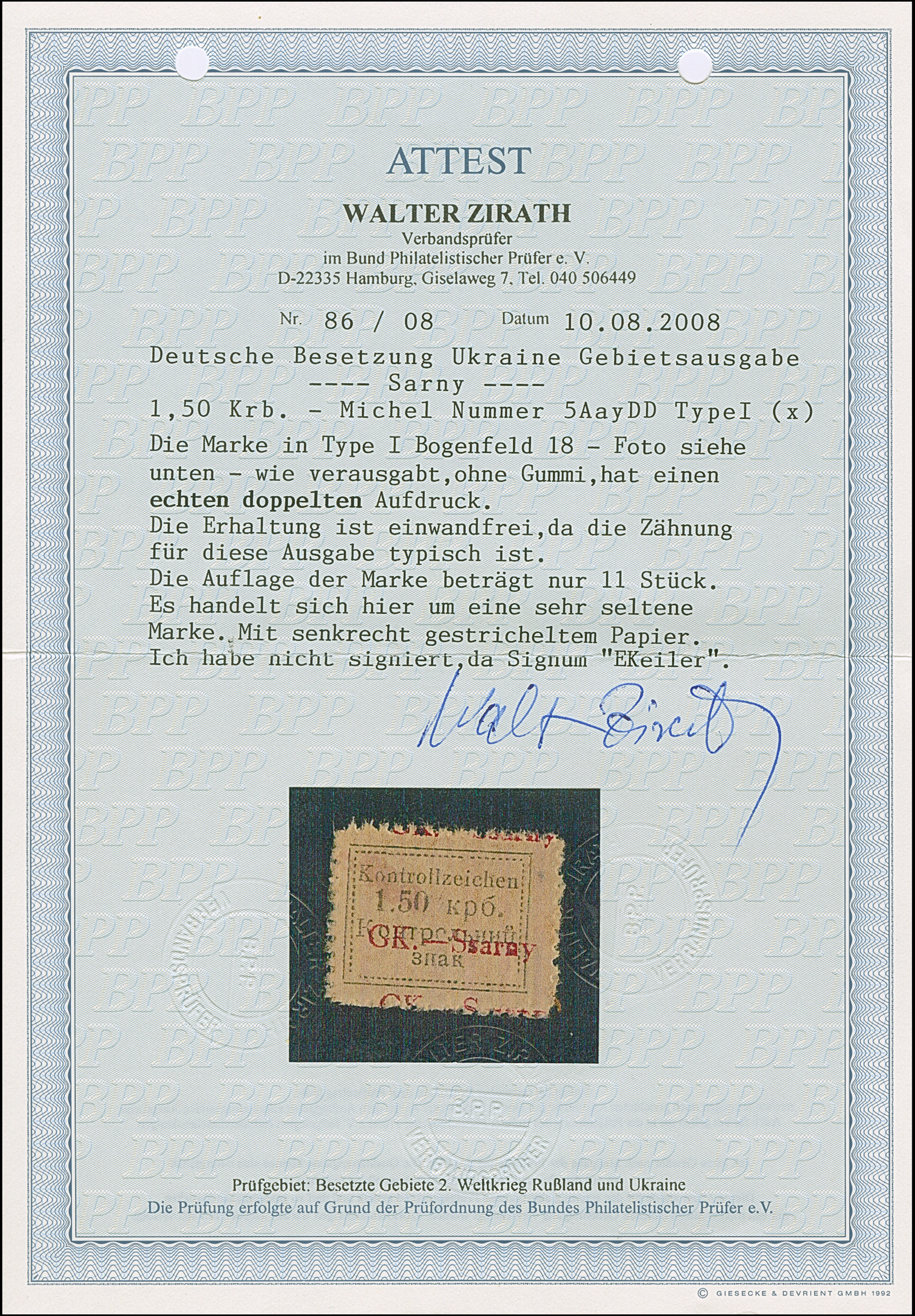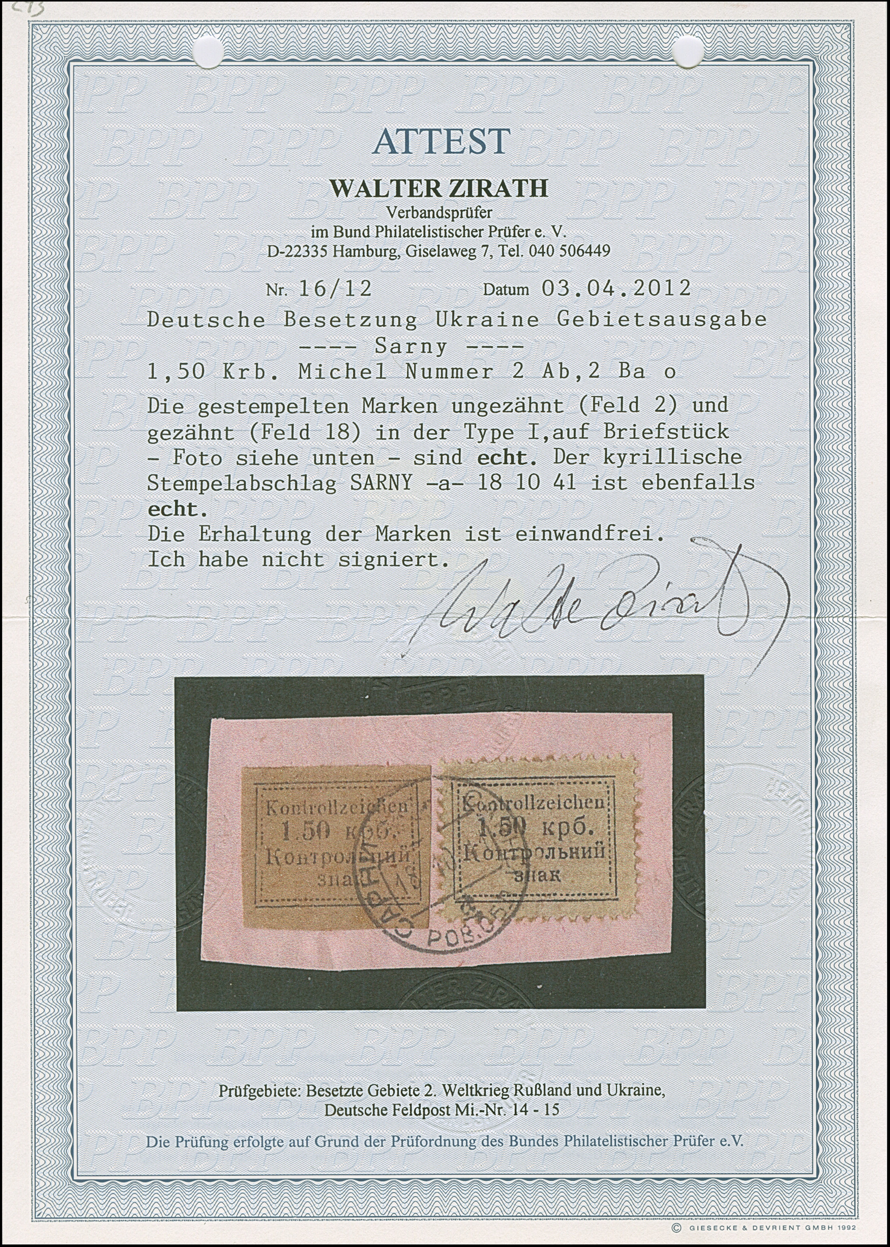 1941, Kontrollzeichen 1,50 Krb., geschnitten und gezähnt, je farbfrisch, von den Feldern 18 bzw 2, sauber mit kyrillischem Stempel “SARNI 18 10 41” auf Briefstück, tadellos, Fotoattest Zirath BPP (2012)