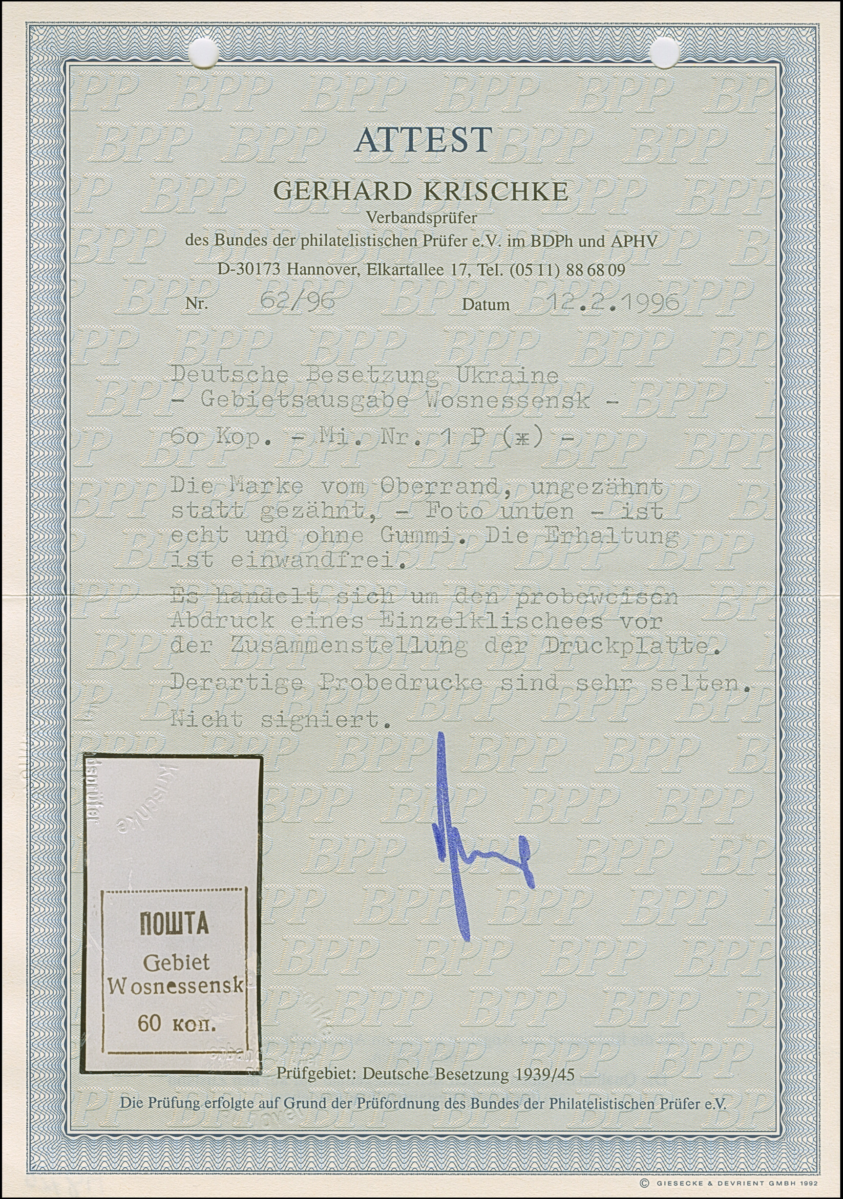 1941, Kontrollzeichen mit Aufdruck 1,50 Krb. mittelockerbraun auf senkrecht gestreiftem Papier, mit doppeltem Aufdruck, farbfrisch und gut gezähnt, ohne Gummi wie verausgabt, tadellos. Eine sehr seltene Marke, wenngleich die Auflage 11 Stück betragen soll, hat ProFi lediglich ein weiteres Stück registriert, sign. UPV und EKeiler sowie Fotoattest Zirath BPP (2008)