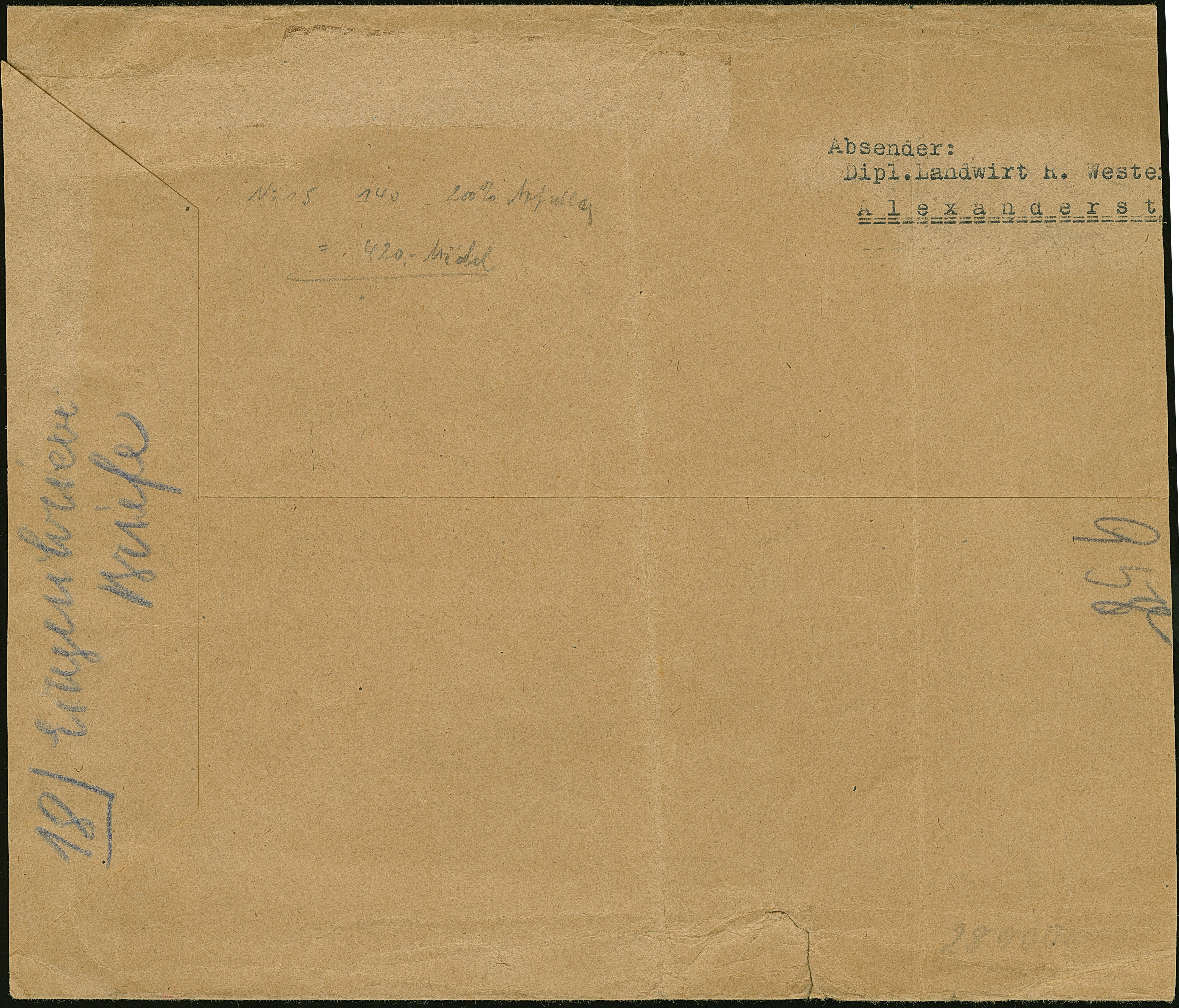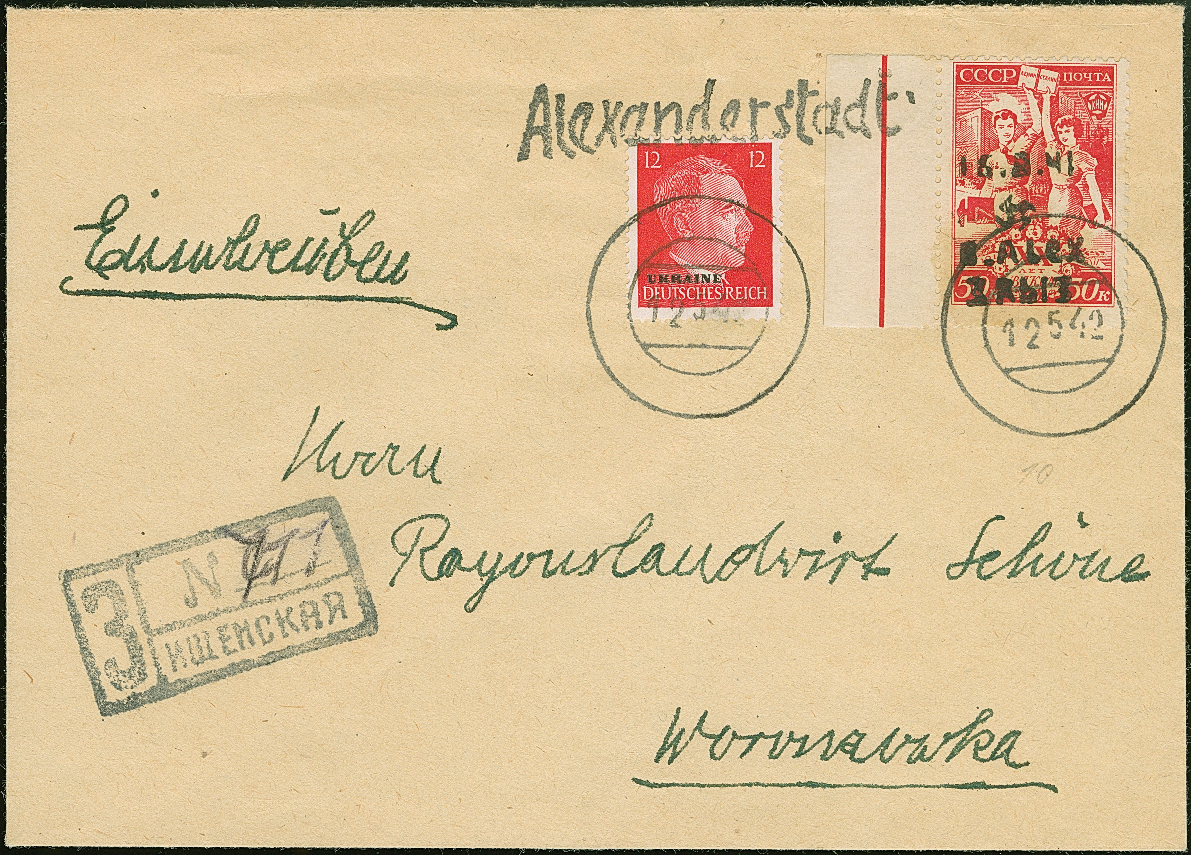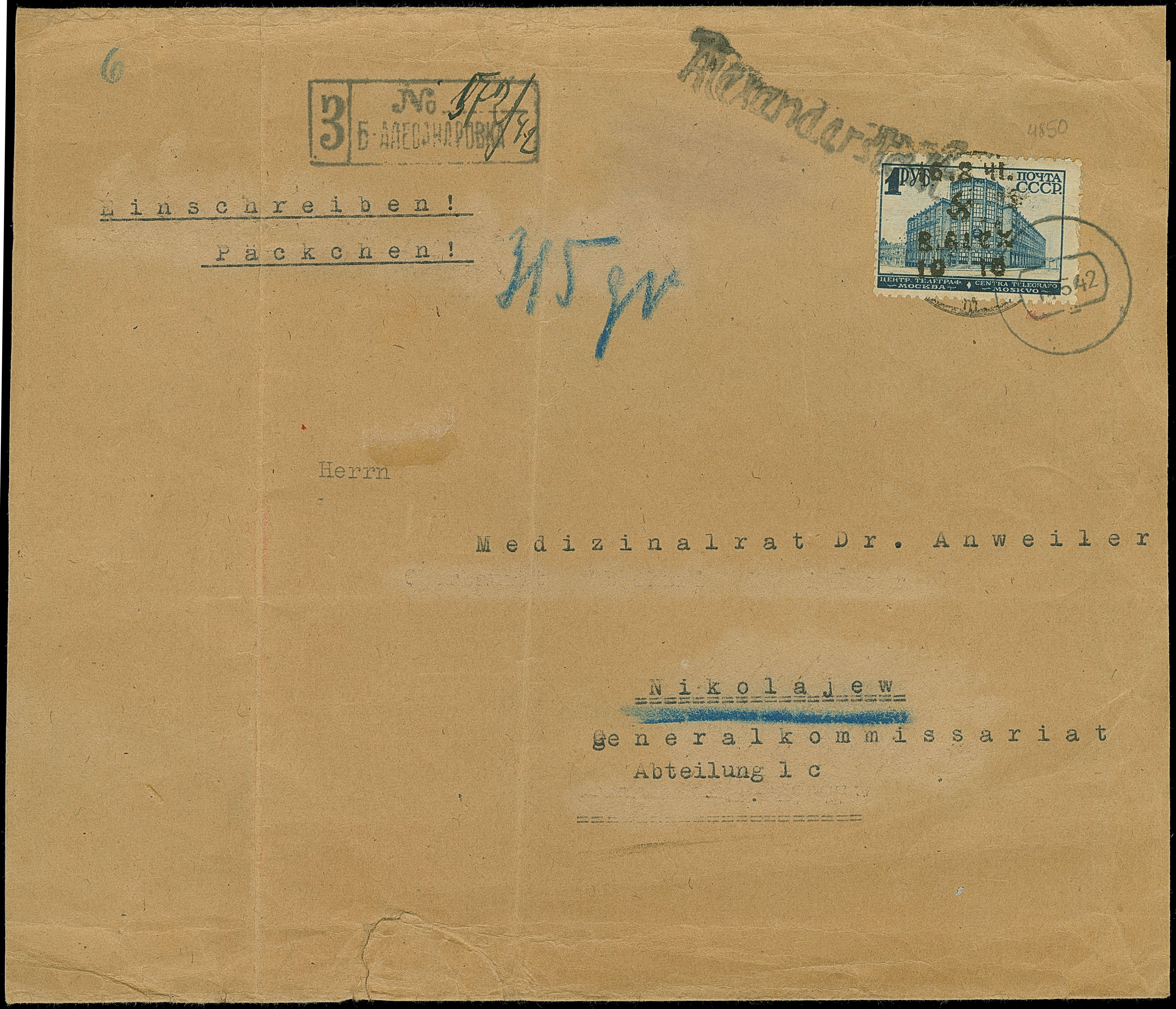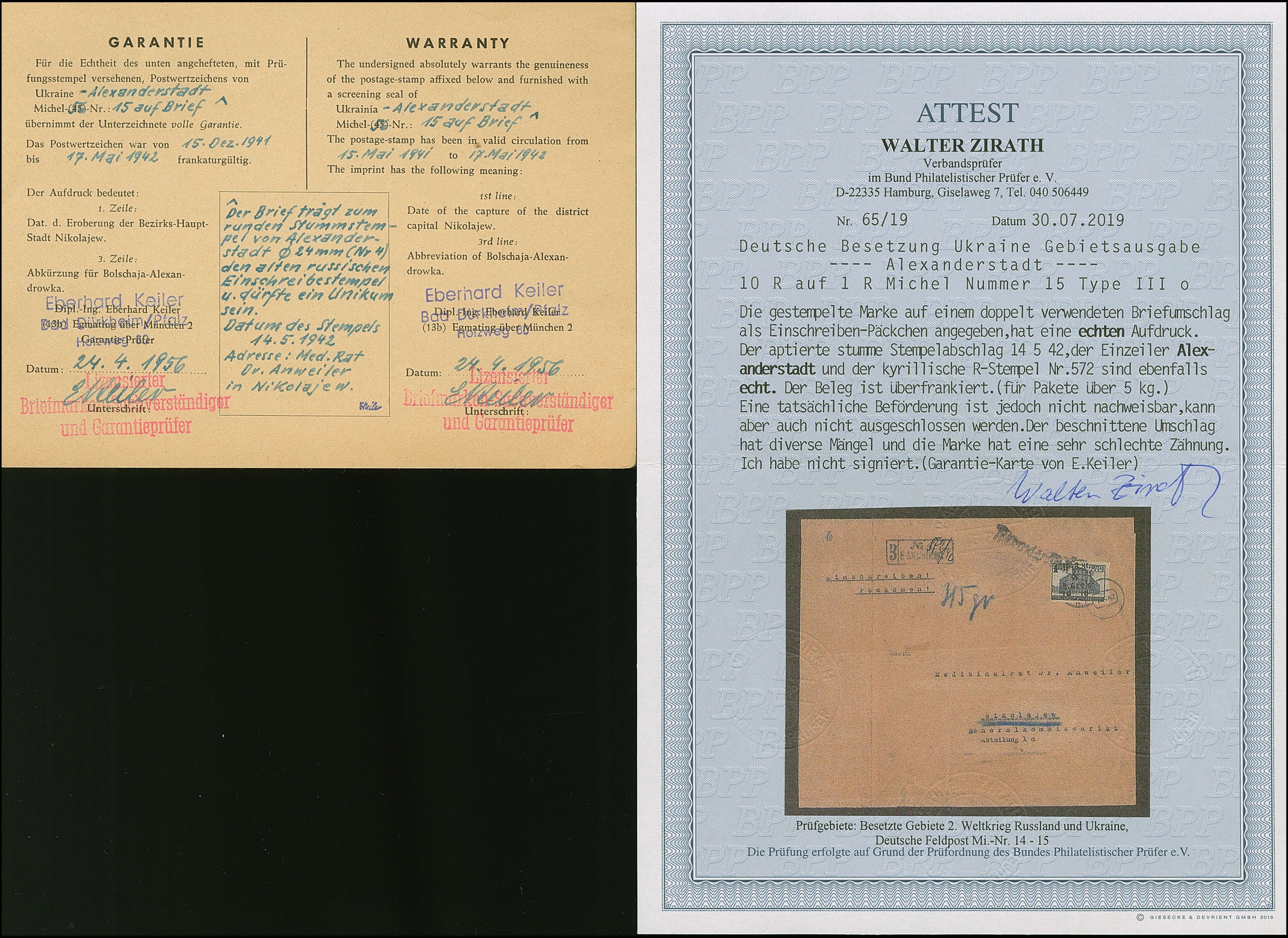 1942, Hakenkreuz 4mm: 10 Rubel auf 1 Rubel, mit stummem Stempel "14 5 42" und L1 "Alexanderstadt" auf etwas beschnittenem, doppelt verwendeter und eingeschriebener Päckchen-Hülle an den Medizinalrat Dr. Anweiler in Nikoloajew, vorderseitig mit "315 gr" Gewicht ausgewiesen und rückseitig mit Vermerk "18 eingeschriebene Briefe", der Brief mit diversen Mängeln, die Marke gering geknittert, eine große Seltenheit, sign. Keiler mit Garantiekarte sowie Fotoattest Zirath BPP (2019)