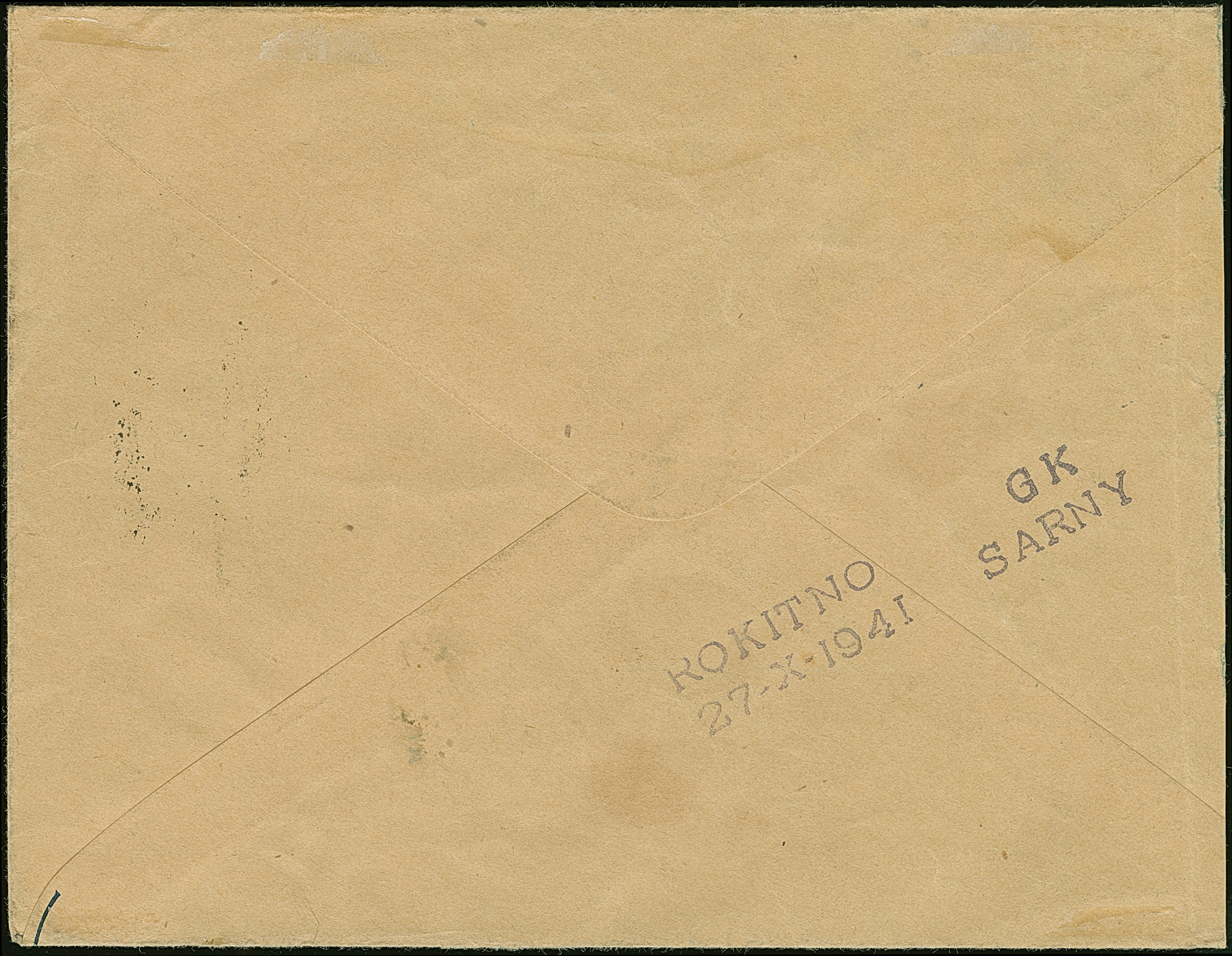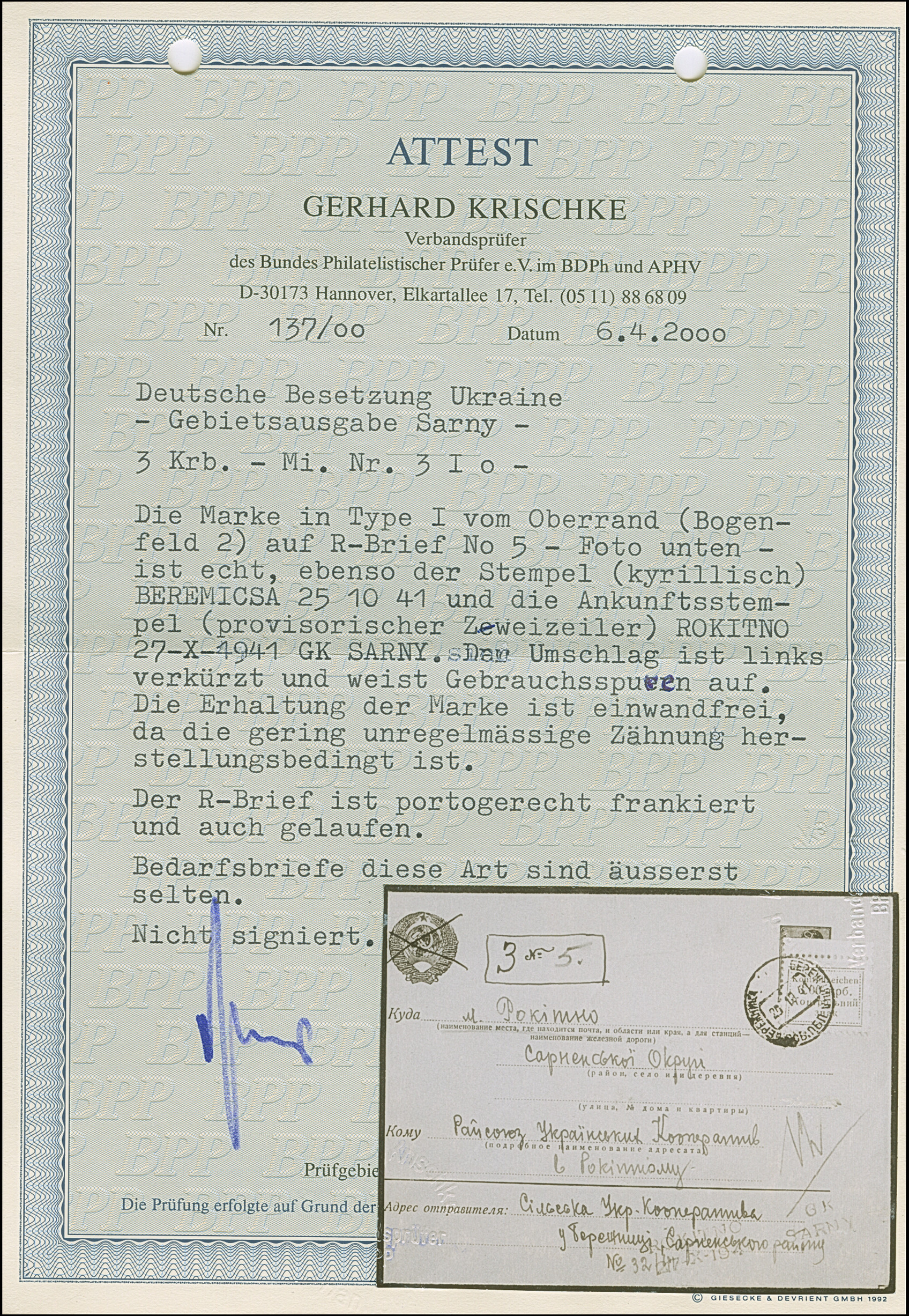1941, Kontrollzeichen 3,00 Krb., Oberrandstück, farbfrisch und gut gezähnt, sauber mit Stempel "BEREMISCA 25.10.41" auf etwas verkürztem, als R-Brief verwendetem sowjetischen Ganzsachenumschlag nach Rokinto mit L2-Ankunftsstempel “ROKITNO GK 27-IX-1941 SARNY”, leichte Beförderungsspuren, sonst tadellos, eine sehr seltene Franktur, ProFi hat lediglich 7 Einzelfrankaturen registriert, Fotoattest Krischke BPP (2000)