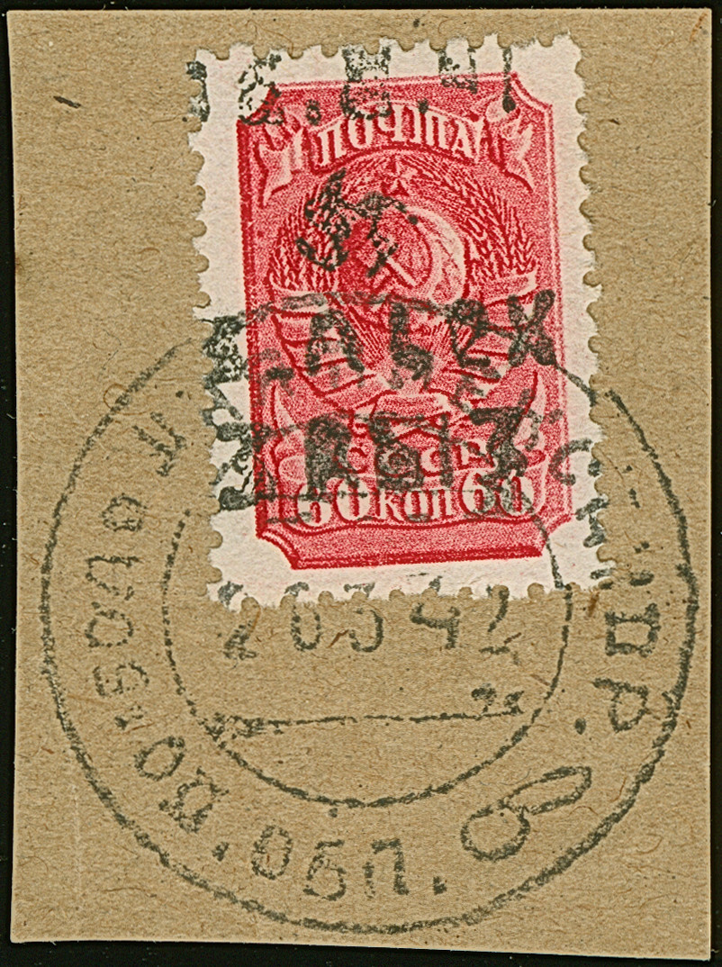 1942, Aufdrucktype III Hakenkreuz 4mm: 3 Rubel auf 60 Kopeken lilarot, farbfrisch und gut gezähnt, sauber mit kyrillischem Stempel “ALEXANDERSTADT 26 3 42” auf Briefstück, tadellos. Eine in gebrauchter Erhaltung seltene Marke, sign. EKeiler und Zirath sowie Fotoattest Krischke BPP (1990)