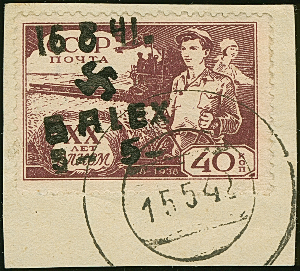 1942, Aufdrucktype II, Hakenkreuz 6mm: 1,50 Rubel auf 20 Kopeken schwarzgelbgrün, farbfrisch und gut gezähnt, sauber mit kyrillischem Stempel “ALEXANDERSTADT 19 3 42” auf Briefstück, tadellos. Eine sehr seltene Marke, sign. Keiler sowie Fotoattest Zirath BPP (2008)