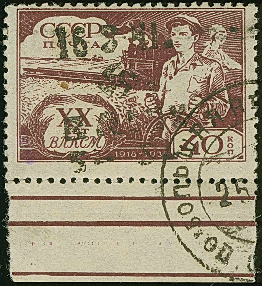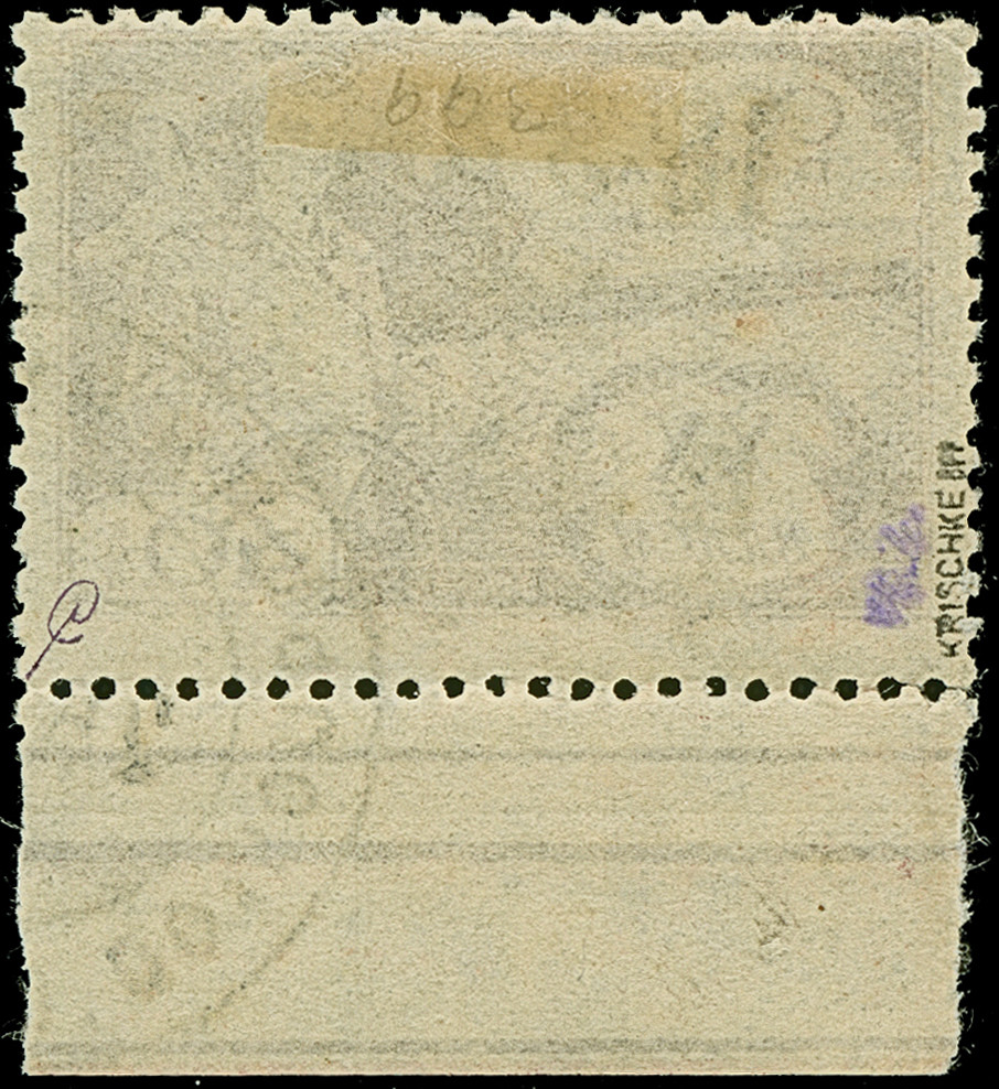 1942, Aufdrucktype III Hakenkreuz 4mm: 5 Rubel auf 40 Kopeken dunkelbraunlila, Unterrandstück, farbfrisch und gut gezähnt, sauber mit kyrillischem Stempel von Alexanderstadt entwertet, tadellos. Eine seltene Marke, ProFi hat keine zwei Dutzend Stücke in gebrauchter Erhaltung registriert, sign. EKeiler sowie Krischke BPP mit Fotoattest (2009)