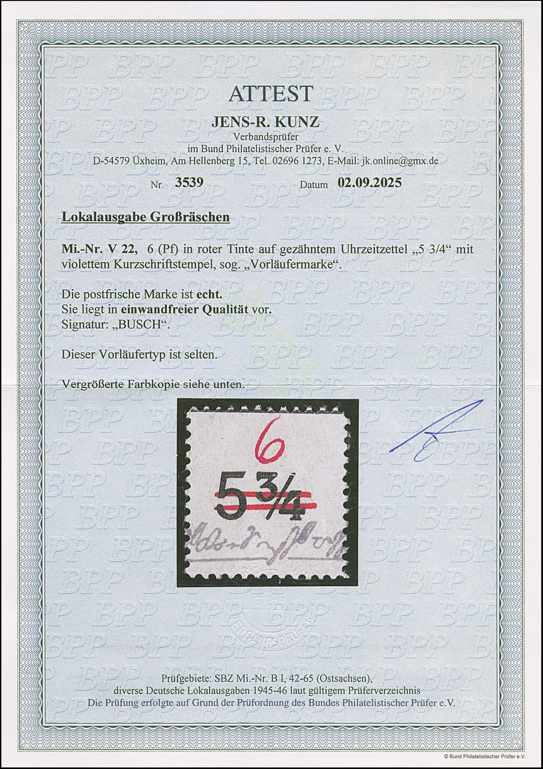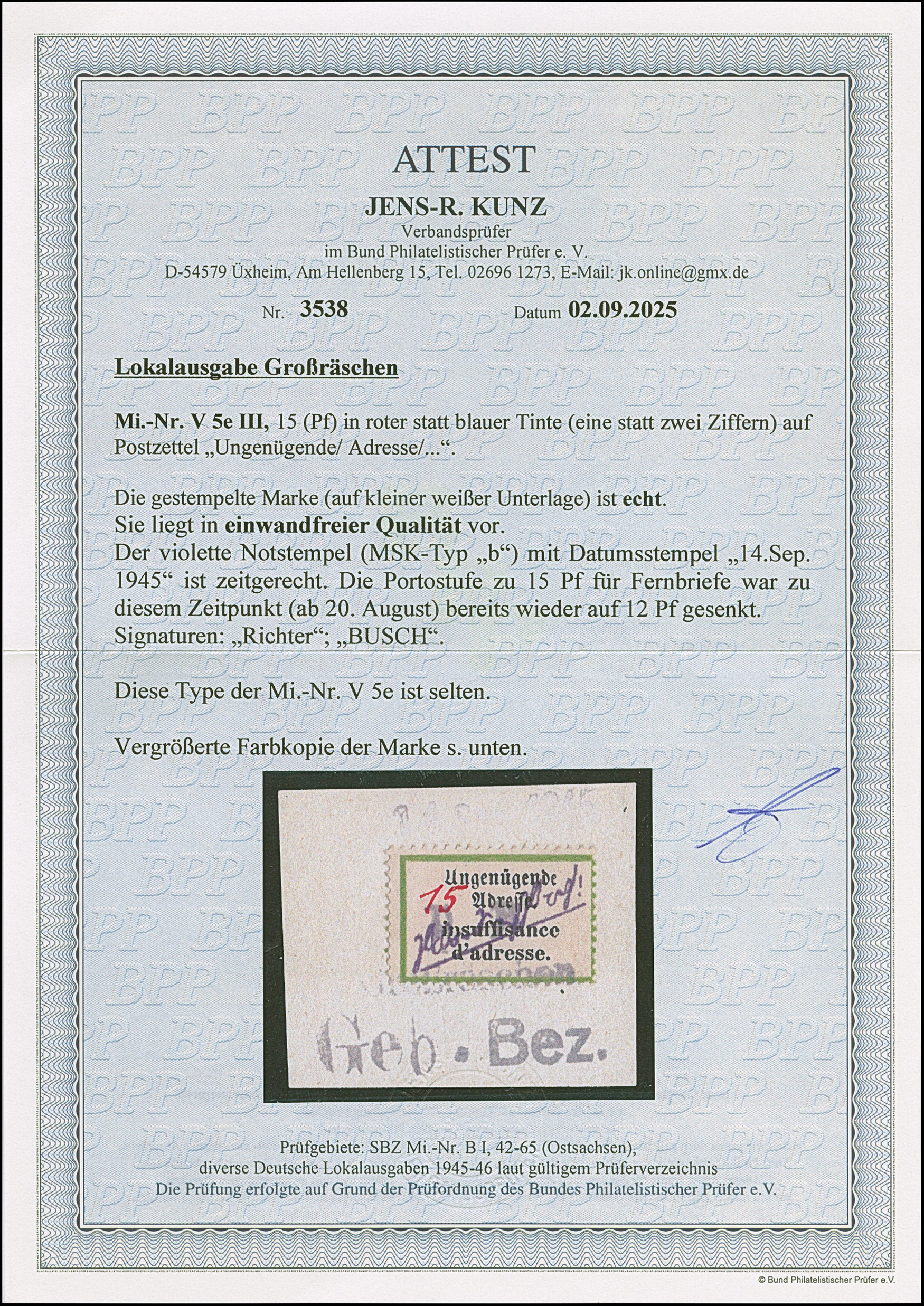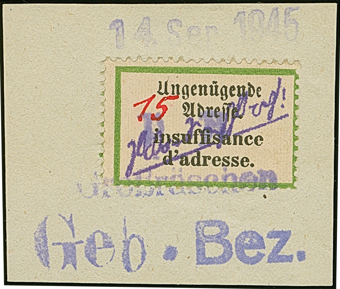 1945, Postzettel “Ungenügende Adresse - insuffisance d'adresse” 15 Pfg. mit Wertangabe in roter statt blauer Tinte, auf Briefstück mit übergehendem Notstempeltype “b” und Datums L1 “14.Sep.1945”, tadellos; eine seltene Variante. Sign. Busch sowie Fotoattest Kunz BPP (2025)
