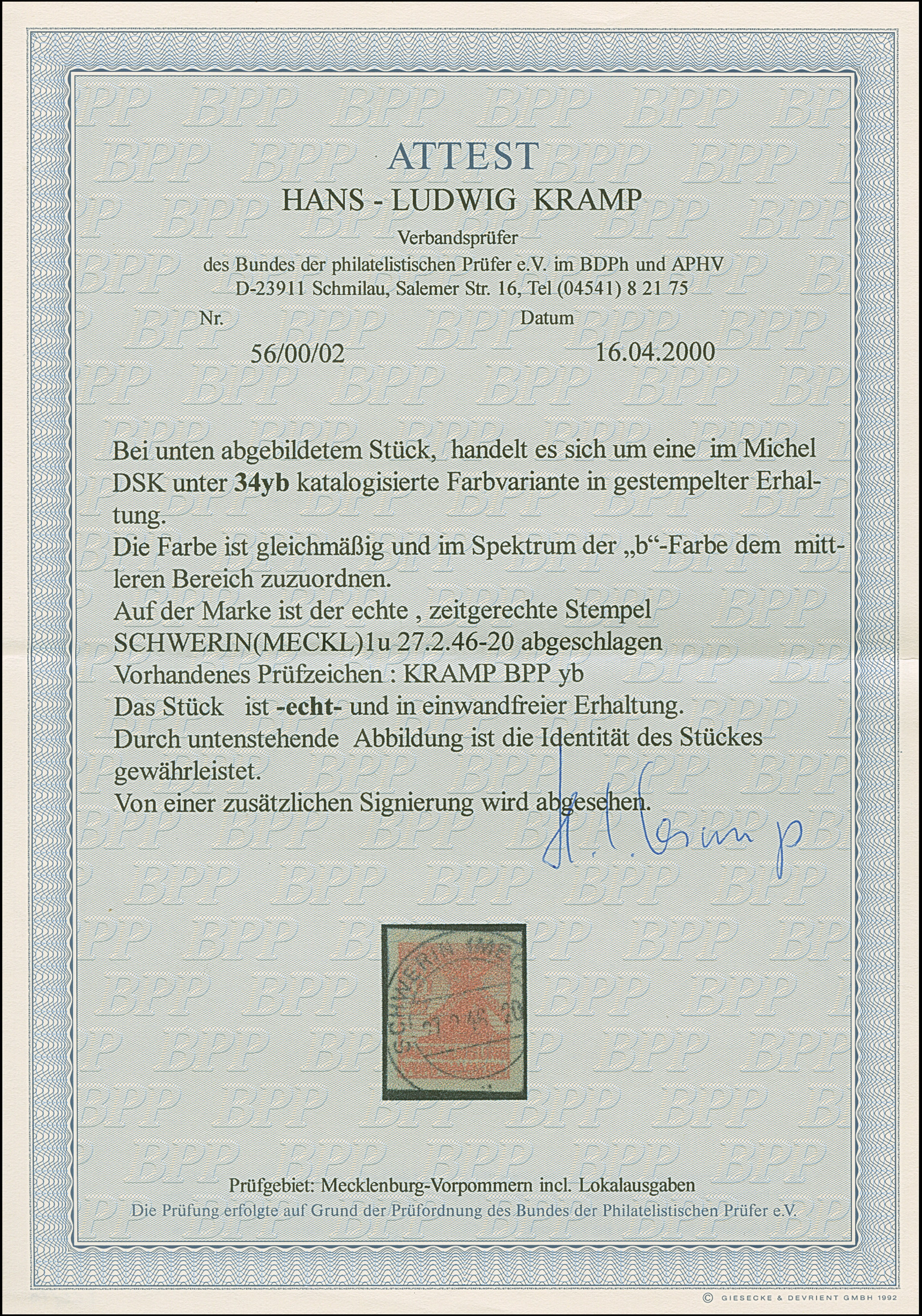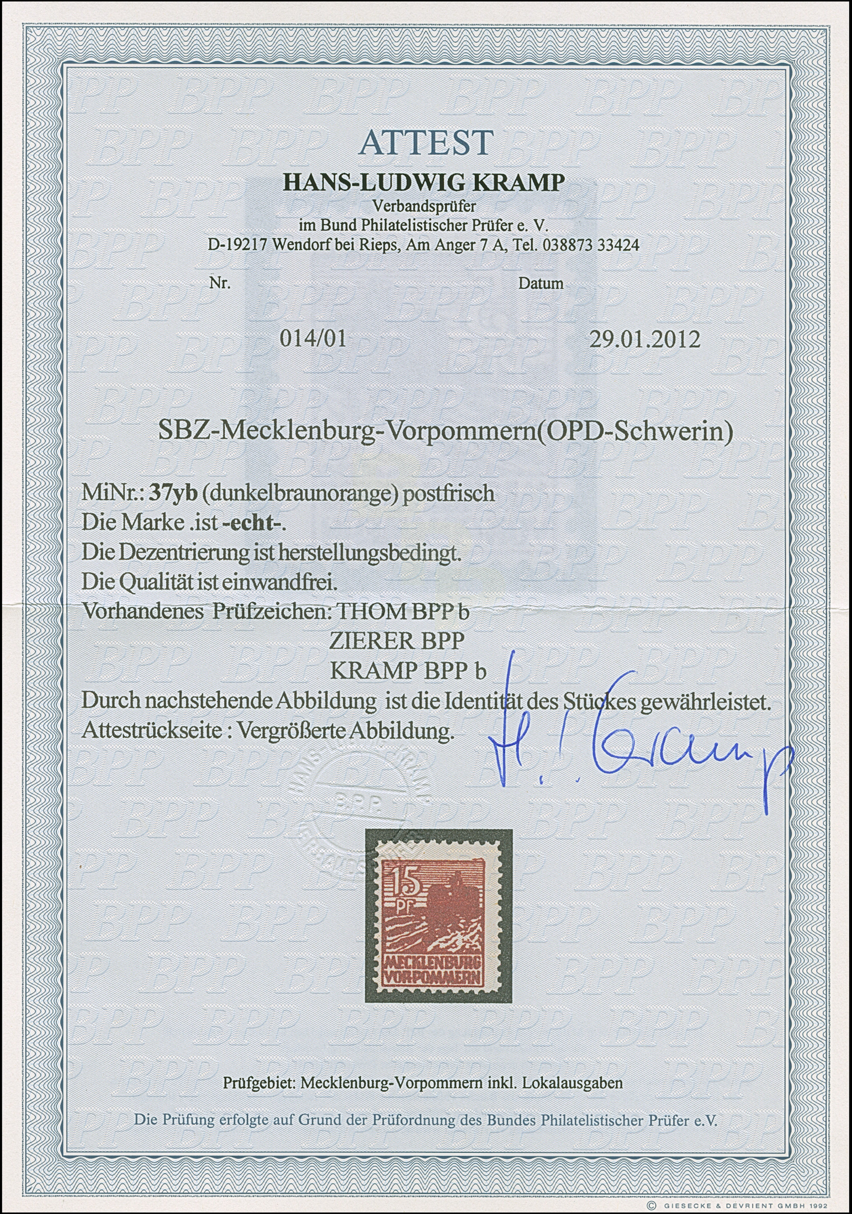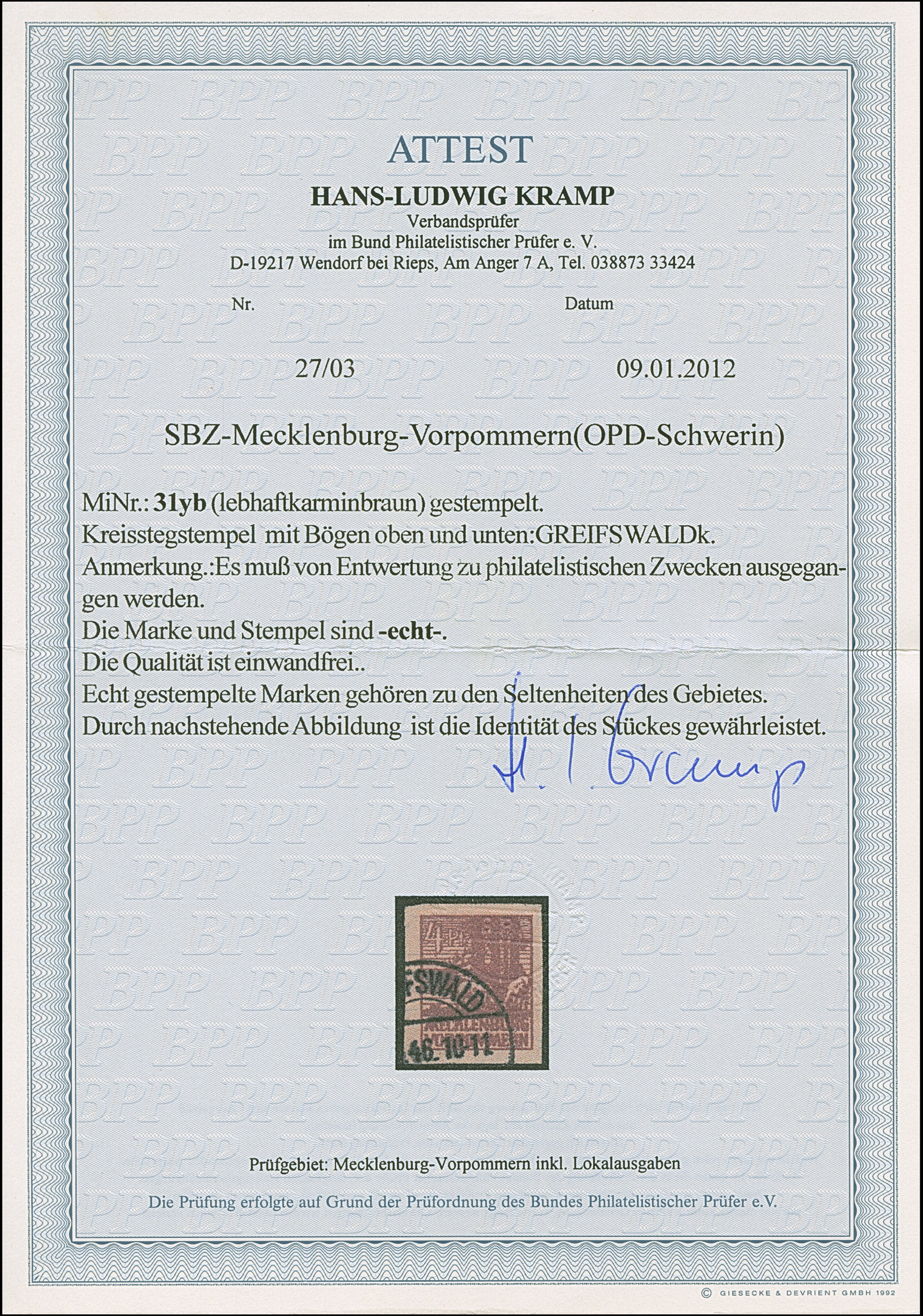 1945, Postzettel “Ungenügende Adresse - insuffisance d'adresse” 15 Pfg. mit Wertangabe in roter statt blauer Tinte, auf Briefstück mit übergehendem Notstempeltype “b” und Datums L1 “14.Sep.1945”, tadellos; eine seltene Variante. Sign. Busch sowie Fotoattest Kunz BPP (2025)