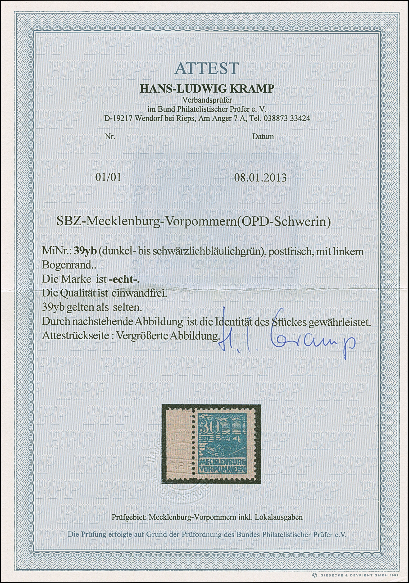 30 Pfg. schwärzlichbläulichgrün auf y-Papier, Randstück, postfrisch, in tadelloser Erhaltung, unsigniert mit Fotoattest Kramp BPP (2013)