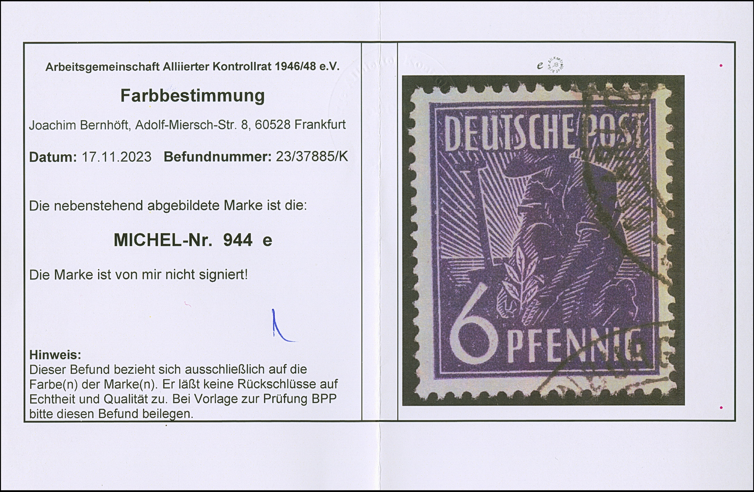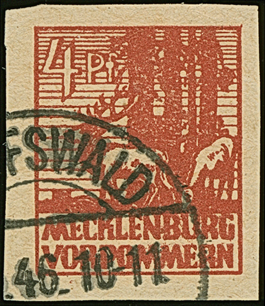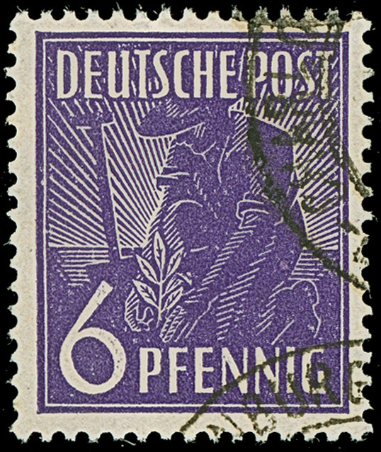 1946, Arbeiter 6 Pfg. schwärzlichblauviolett, gestempelt “BERLIN - CHARLOTTENBURG 2 z”, tadellos, eine gestempelt sehr seltene Farbe; keine handvoll weiterer Exemplare bekannt und im Michel völlig unterbewertet, Farbbestimmung Arge (2023) sowie Fotobefund Wehner BPP (2026)