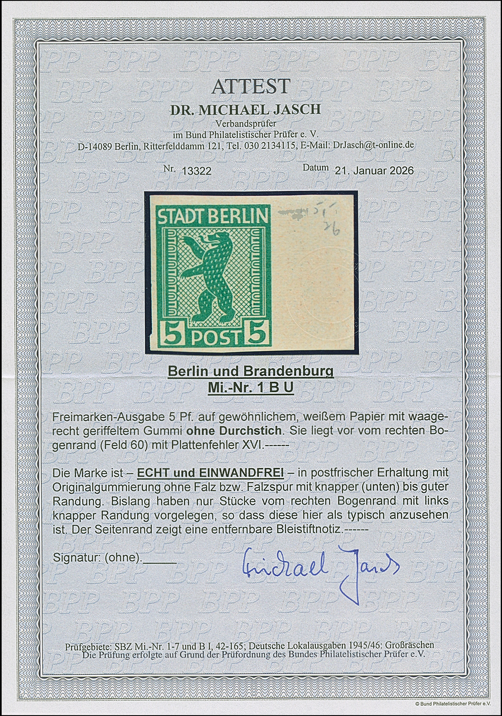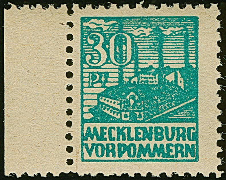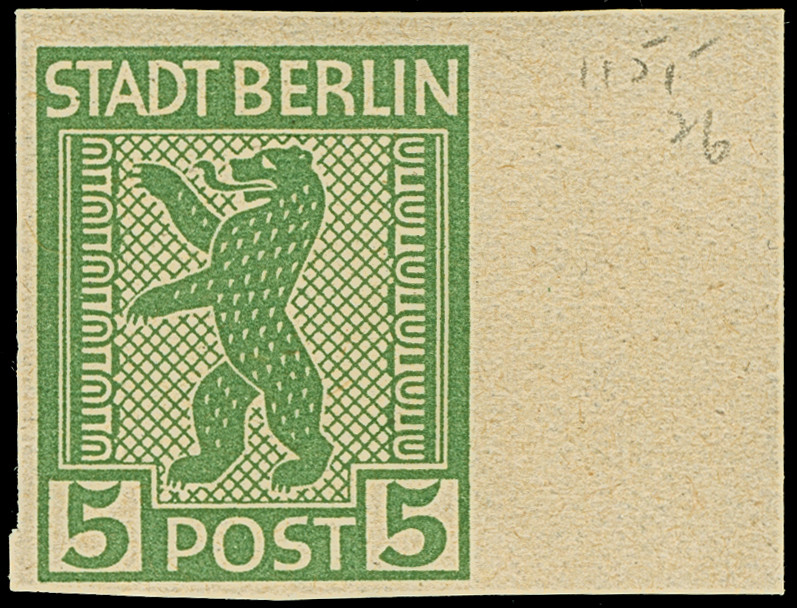 5 Pfg. mit waagerechter Gummiriffellung, voll-bis breitrandig ungezähnt, rechts mit breitem Bogenrand (hierauf entfernbare Bleistiftnotiz) postfrisch, unsigniert und tadellos. Eine der großen Seltenheiten der SBZ; ProFi hat nur ein weiteres Stück registriert. Fotoattest Dr. Jasch PPP (2026)