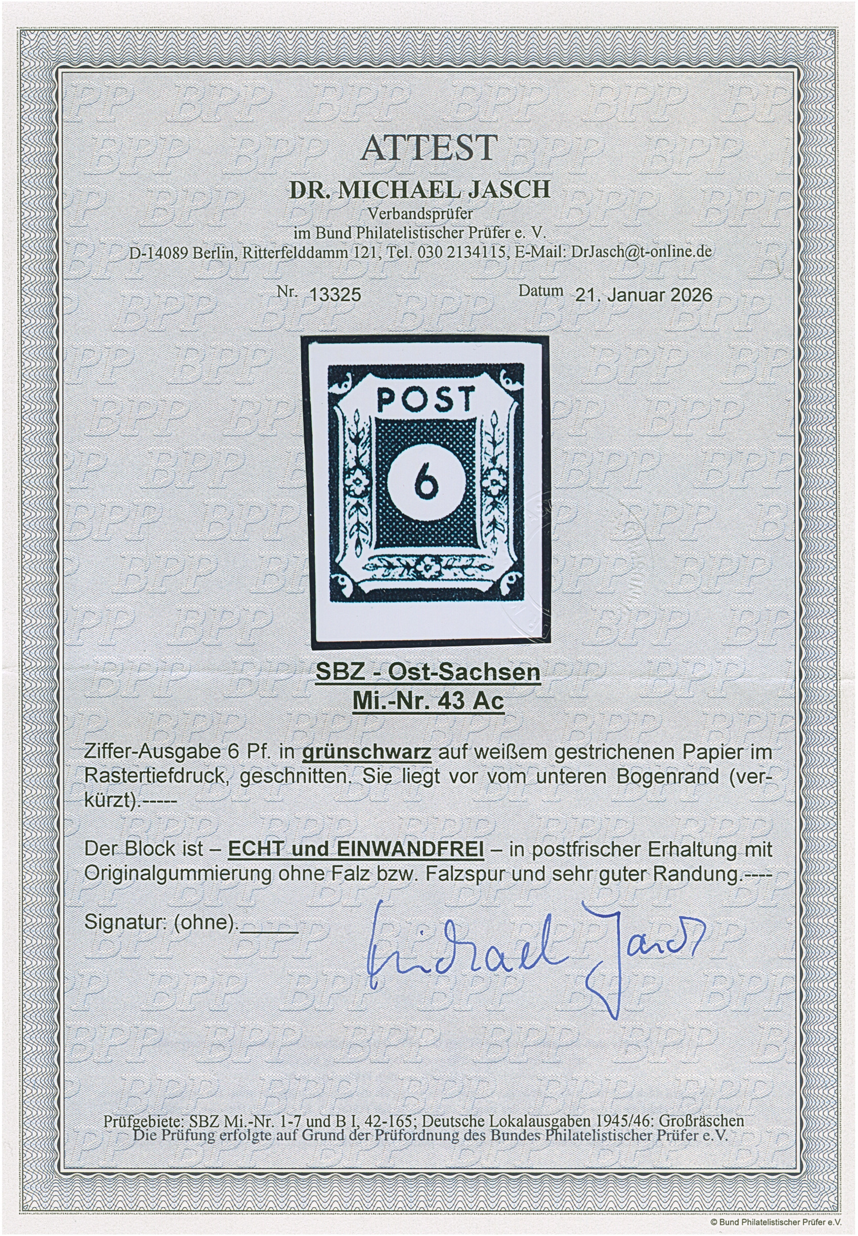 1945, Ziffer 6 Pfg. grünlichschwarz, postfrisch, tadellos, Unsigniert, Fotoattest Dr. Jasch BPP (2026)