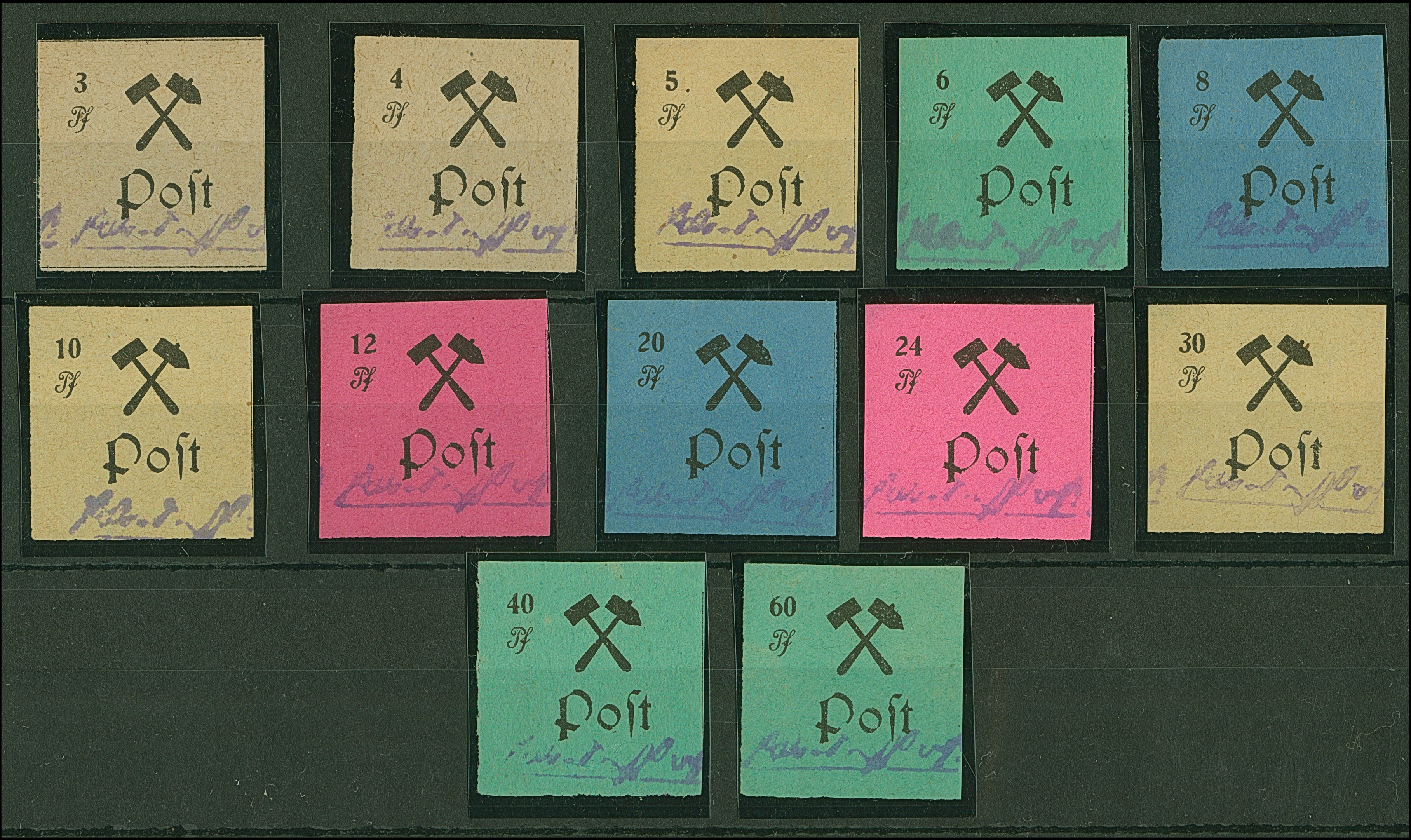 1945, Wertziffern handschriftlich, 10 Pfg. und beide 30 Pfg., die rosafarbene leicht Anhaftungen, sonst einwandfrei postfrisch, private Signatur