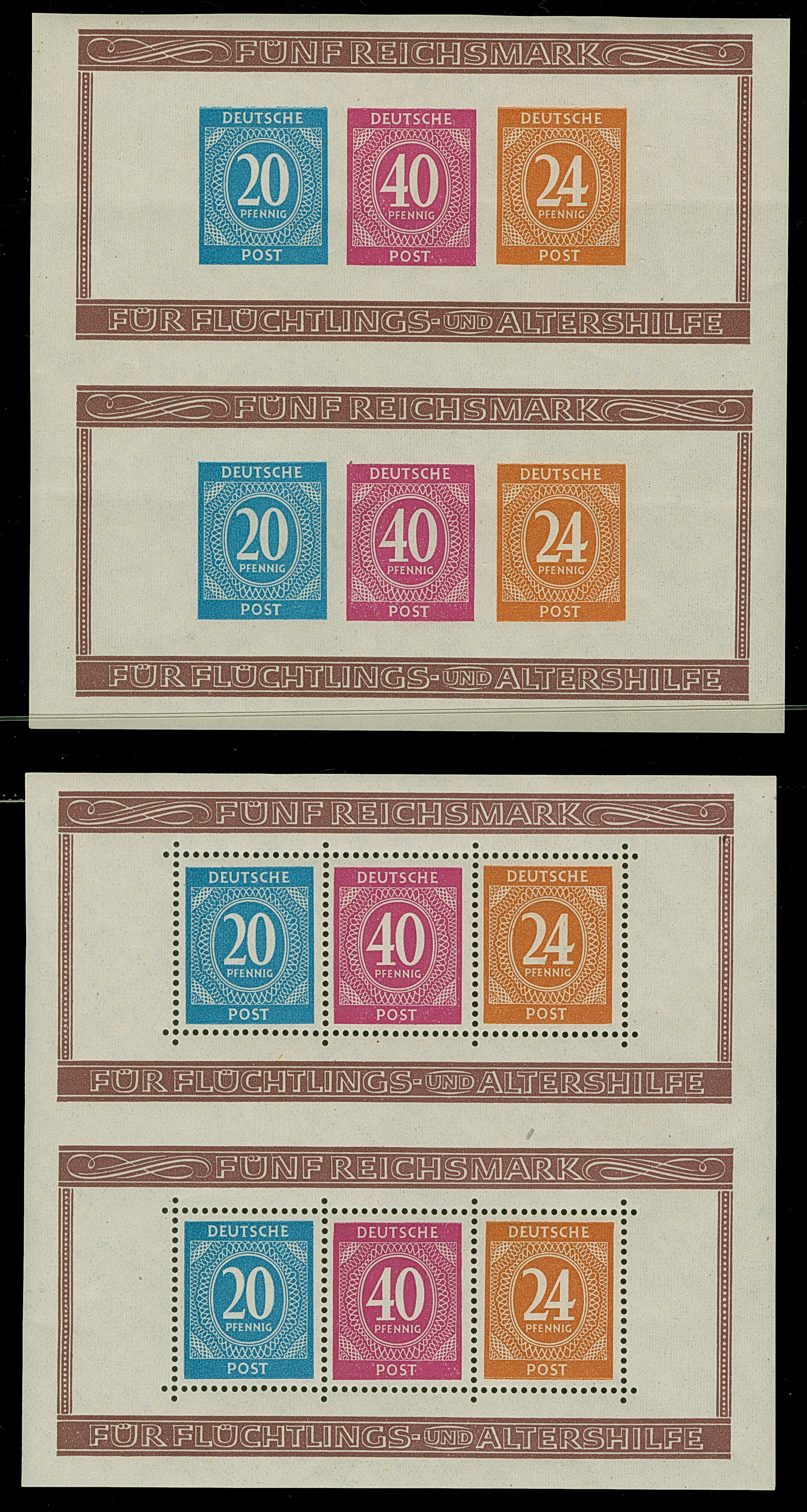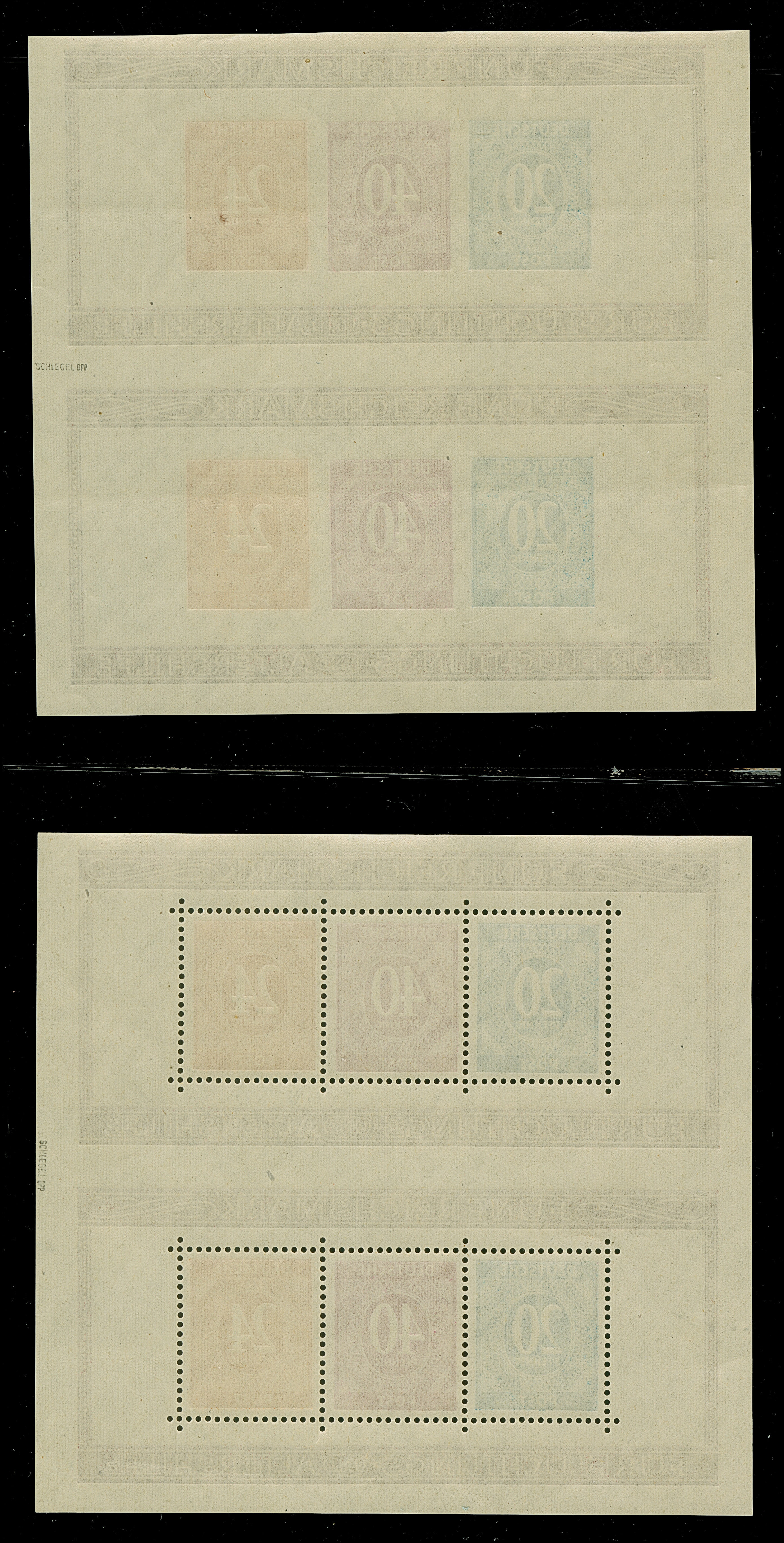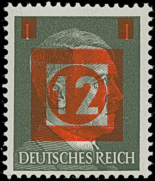 1945, Hitler 3 Pfg., Unterrandstück mit Probeaufdruck “12 waagerechte Strich und 1945”, postfrisch, rückseitig komplett mit Druckerschwärze, tadellos, selten, Befund Kunz BPP (2007)