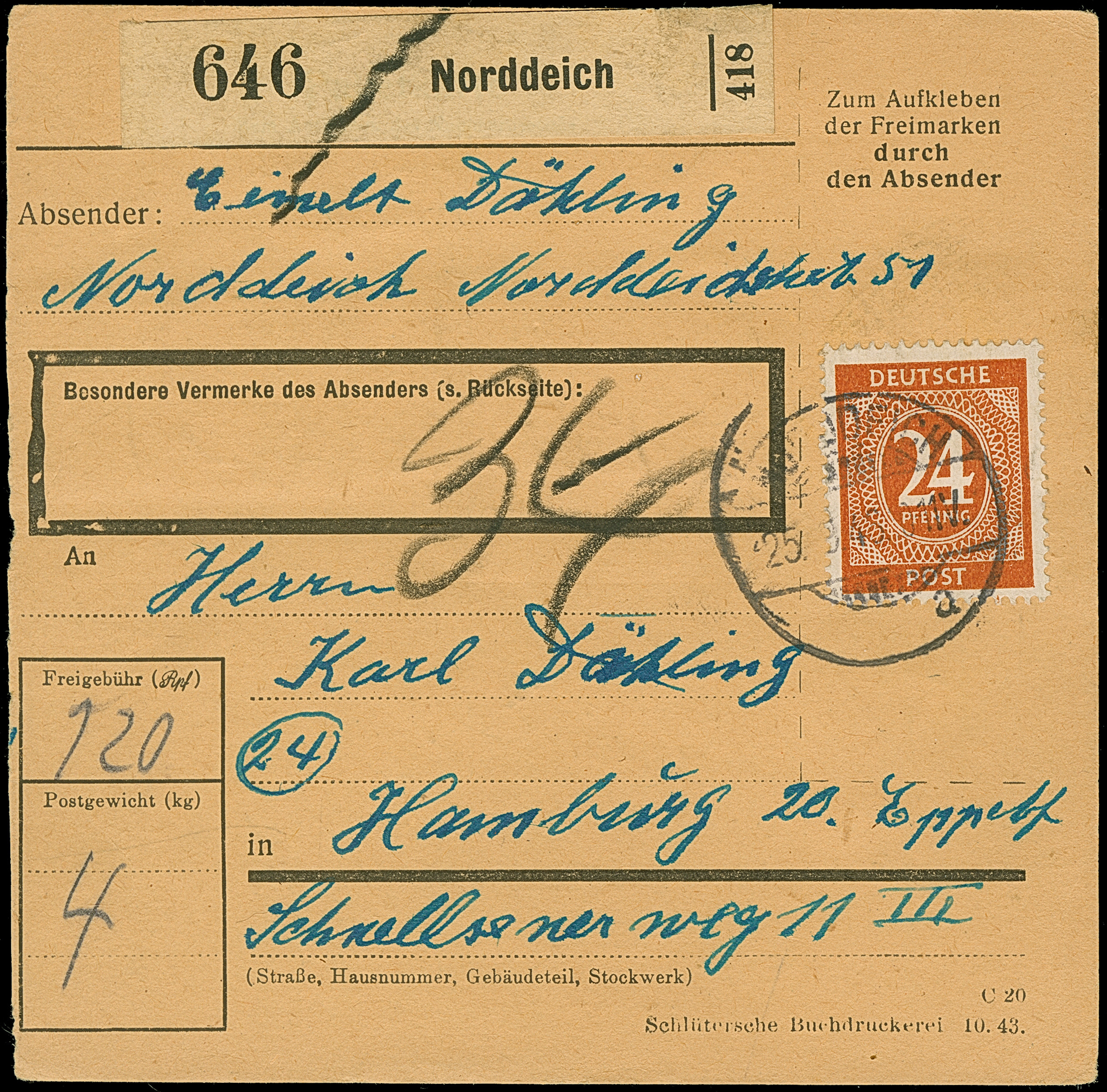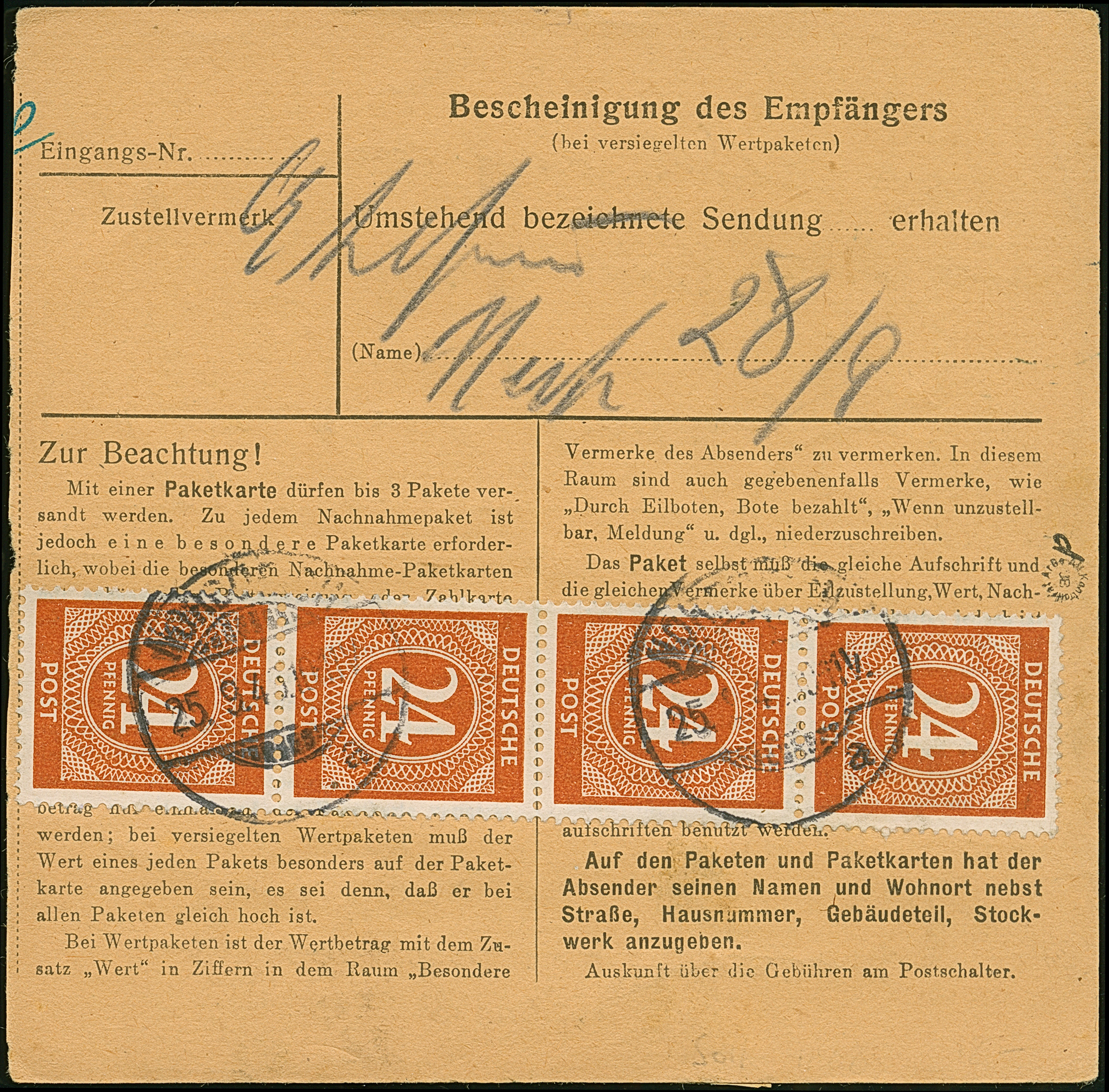 Ziffer 24 Pfg. schwärzlichrötlichorange im senkrechten 4er-Streifen und Einzelwert je mit Stempel “NORDDEICH 25.9.46” vorder- und rückseitig auf Paketkarte nach Hamburg in guter Erhaltung, sign. Bernhöft/ARGE
