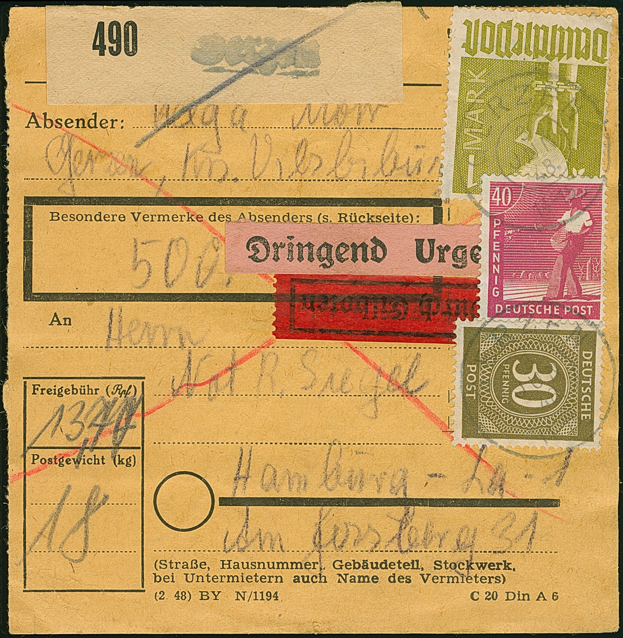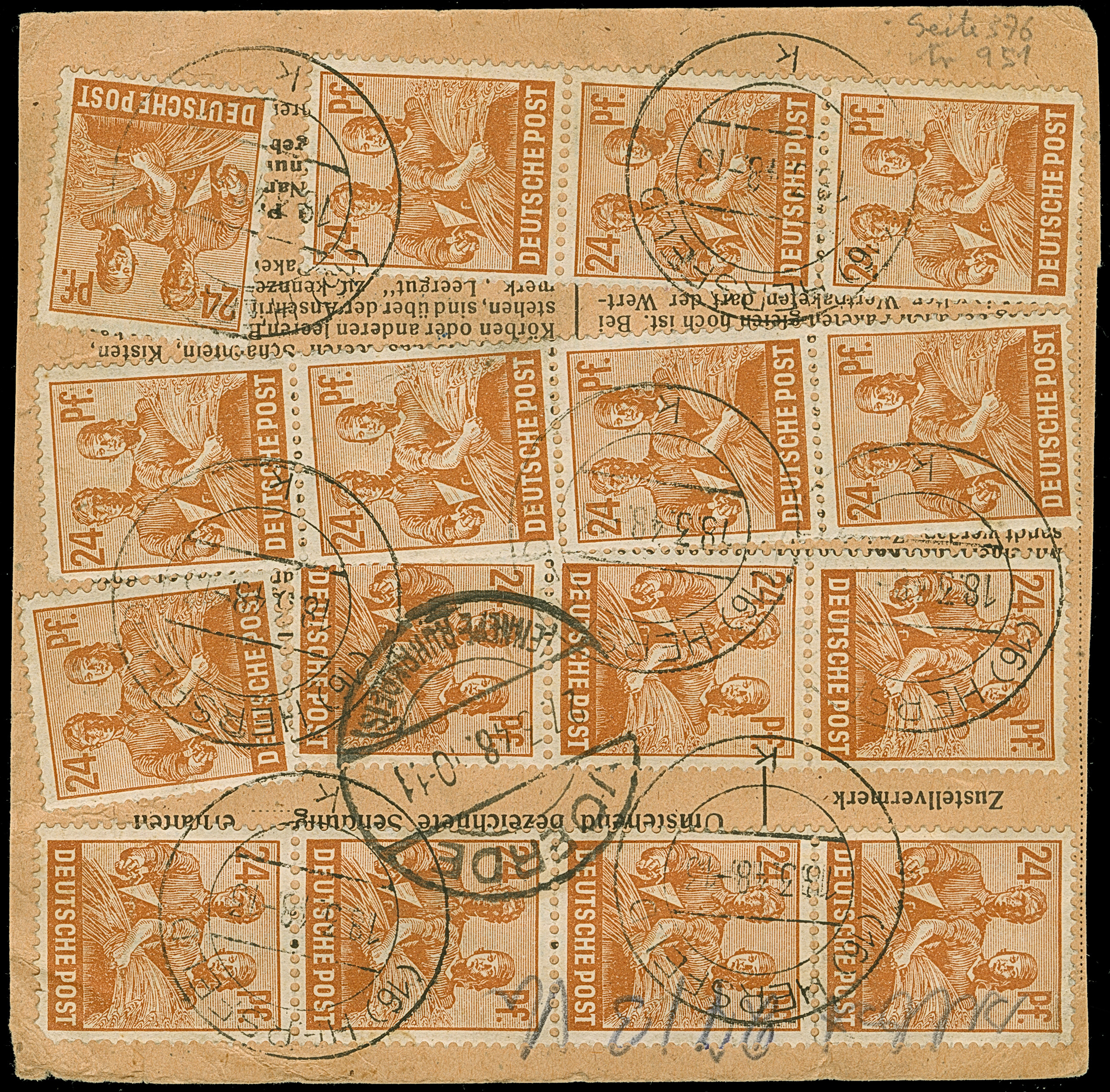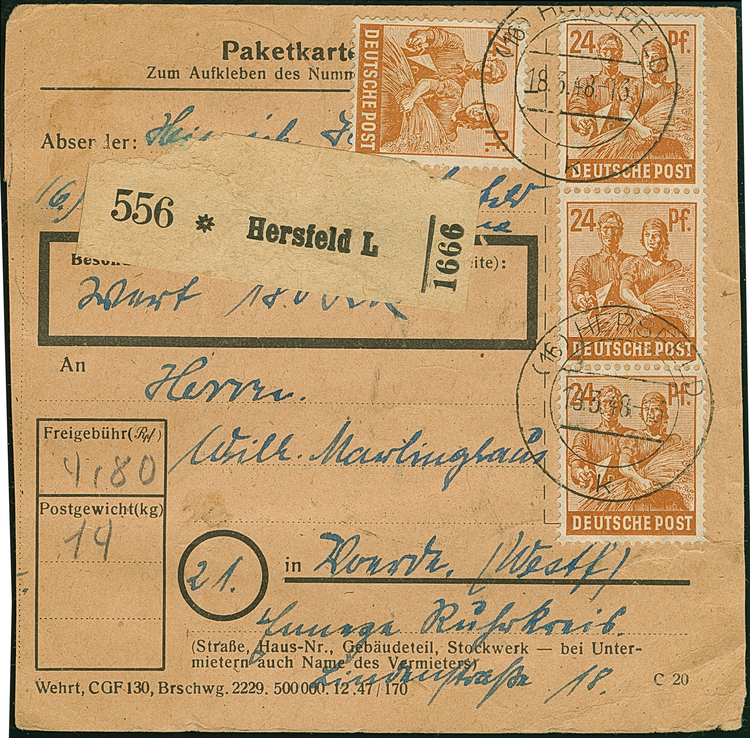 Arbeiter 24 Pfg., 20 Werte mit Stempel “HERSFELD 18.3.48” vorder- und rückseitig auf Paketkarte nach Voerde mit Ankunftsstempel. Wenige Marken mit Eckzahnfehlern bzw. Bügen, ansonsten in guter Erhaltung. Eine nicht häufige Mehrfachfrankatur