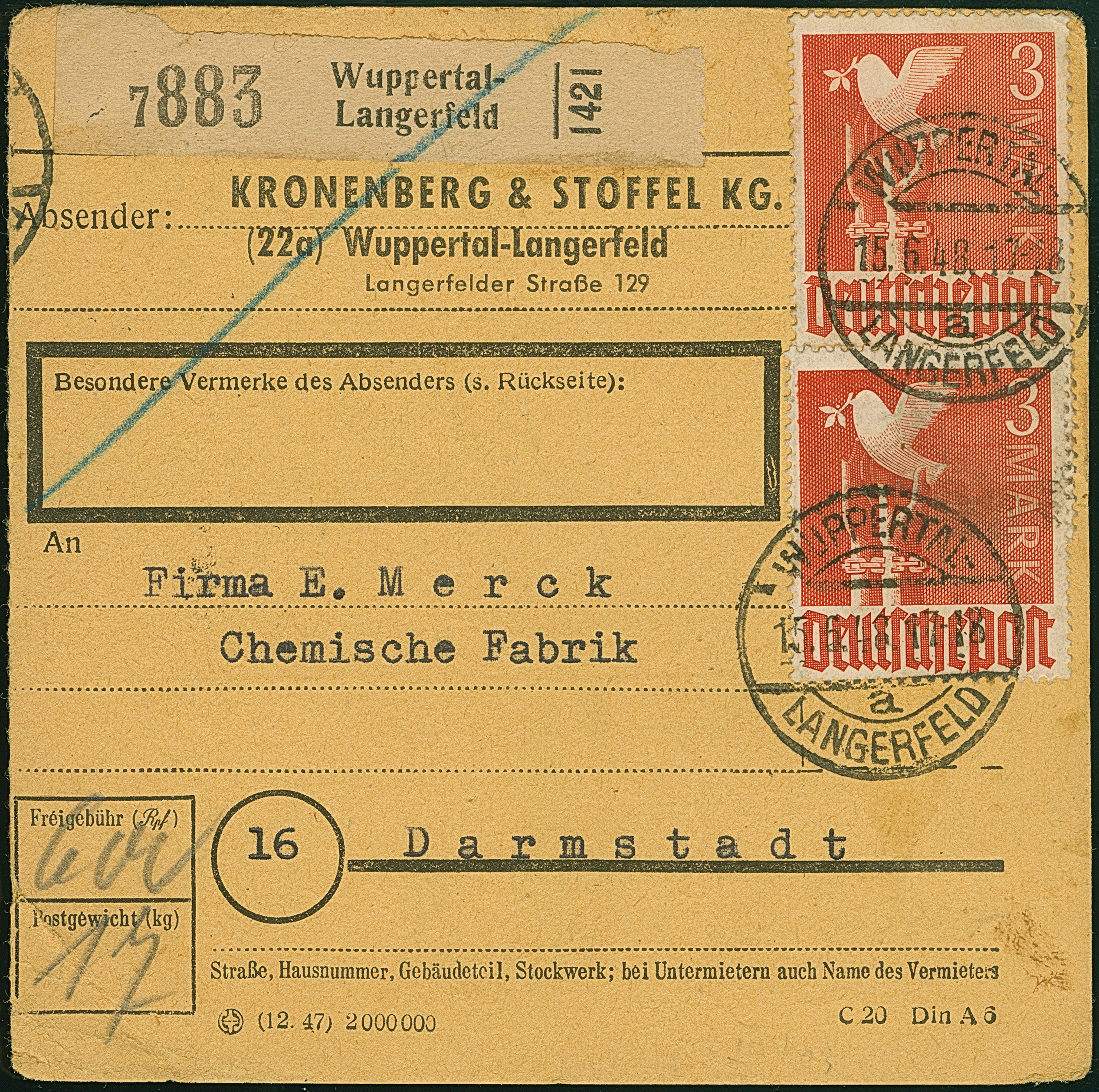 Taube 3 M., zwei Einzelmarken mit Stempel “WUPPERTAL-LANGERFELD 15.6.48” als Mehrfachfrankatur auf Paketkarte nach Darmstadt. Die obere Marke mit kleinem Eckbug, ansonsten in guter Erhaltung, eine nicht häufige Mehrfachfrankatur