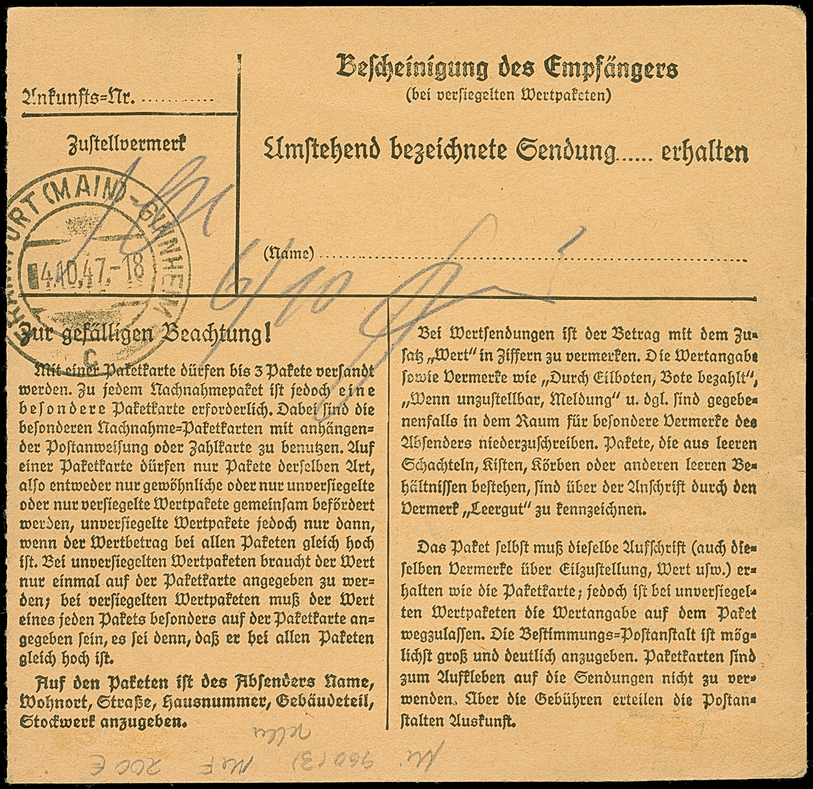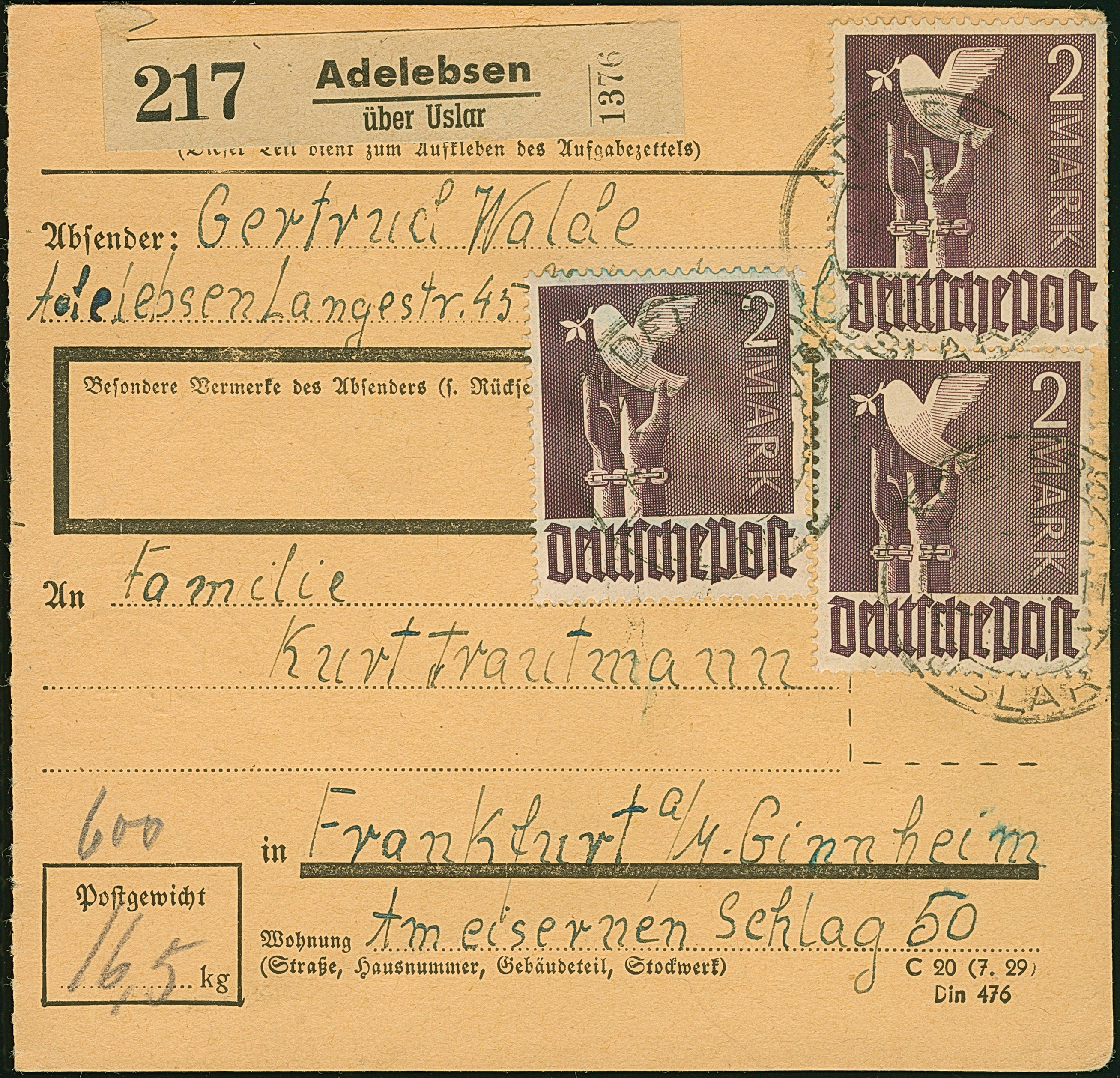 Taube 2 M., drei Einzelmarken mit Stempel “ADELEBSEN über USLAR 2.10.47” als Mehrfachfrankatur auf Paketkarte nach Frankfurt mit Ankunftsstempel, in einwandfreier Erhaltung