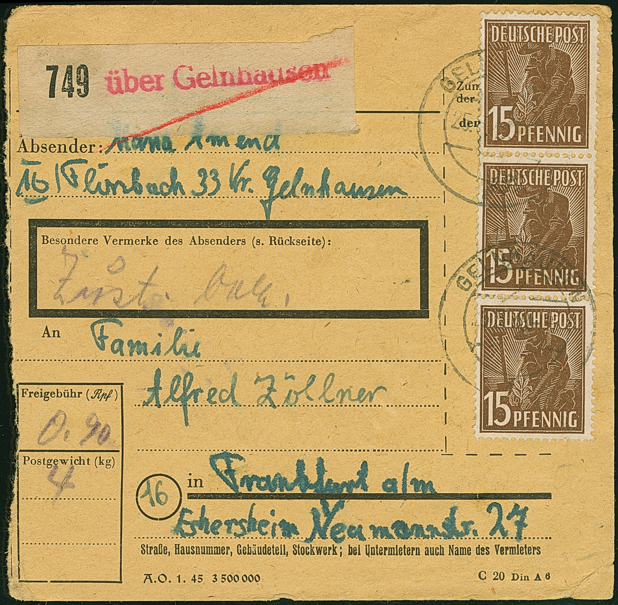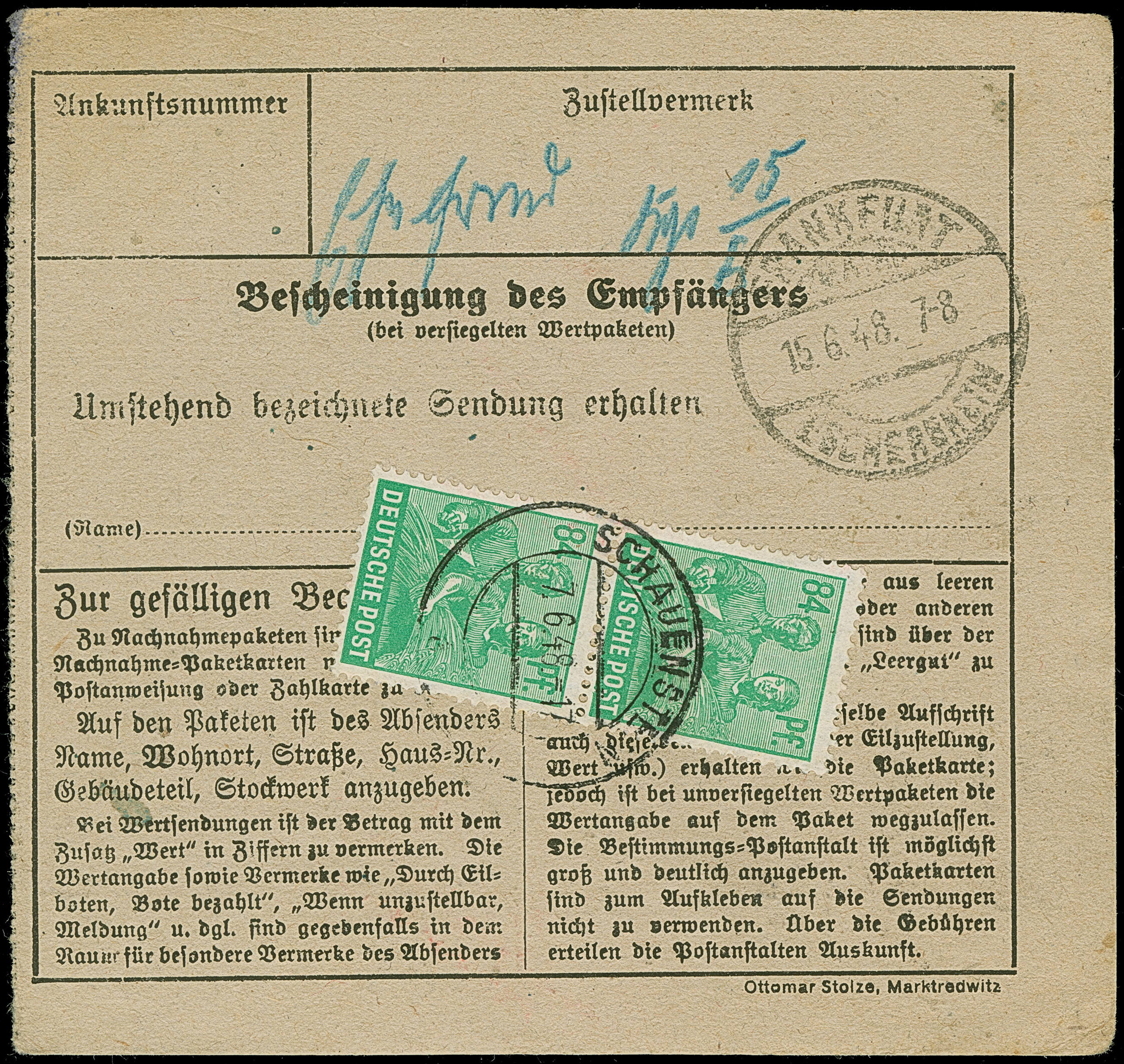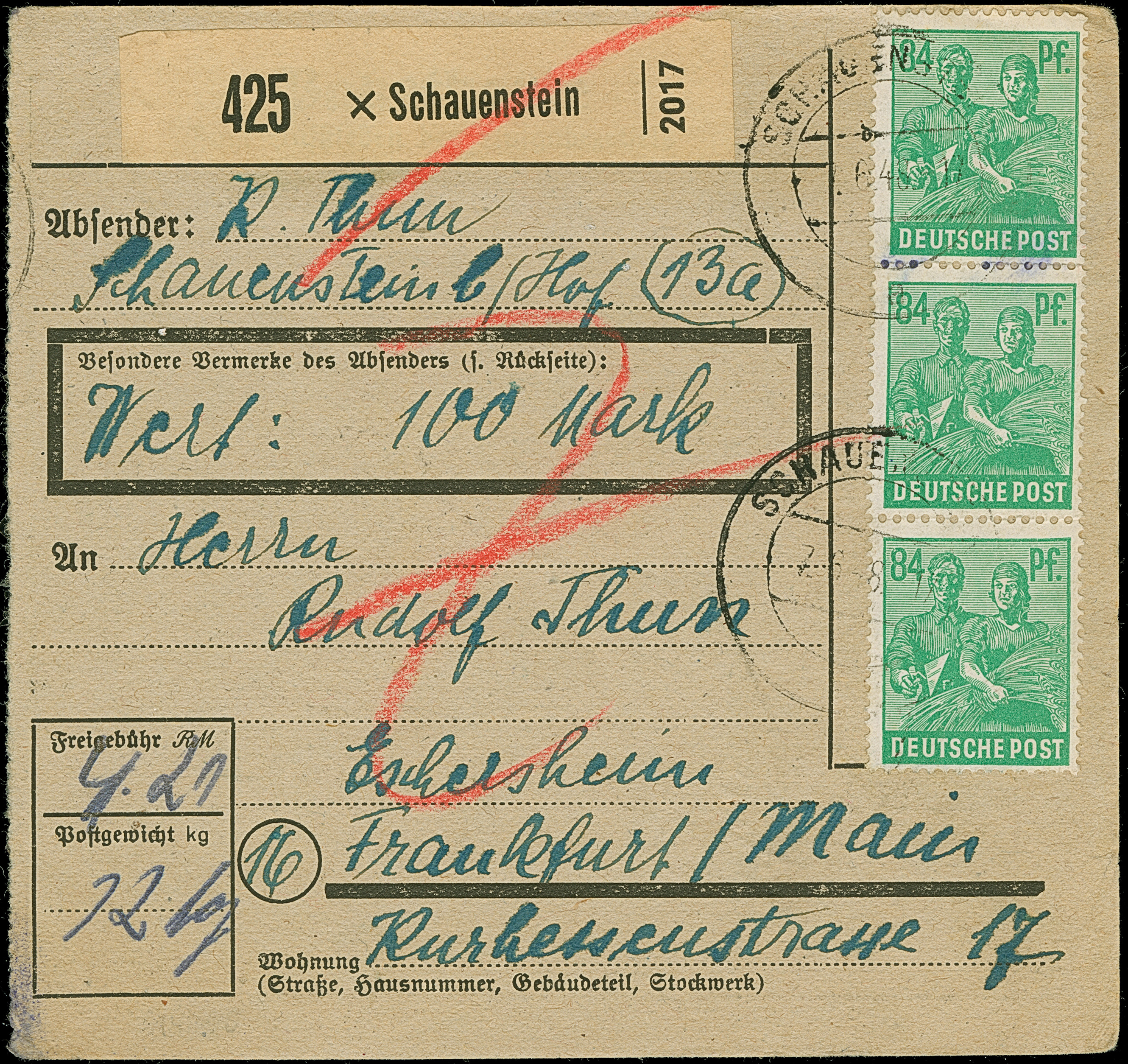 Arbeiter 84 Pfg. im senkrechten Paar und Dreierstreifen je mit Stempel “SCHAUENSTEIN 7.6.48” vorder- und rückseitig auf Paketkarte nach Frankfurt mit Ankunftsstempel, in einwandfreier Erhaltung. Eine nicht häufige Mehrfachfrankatur