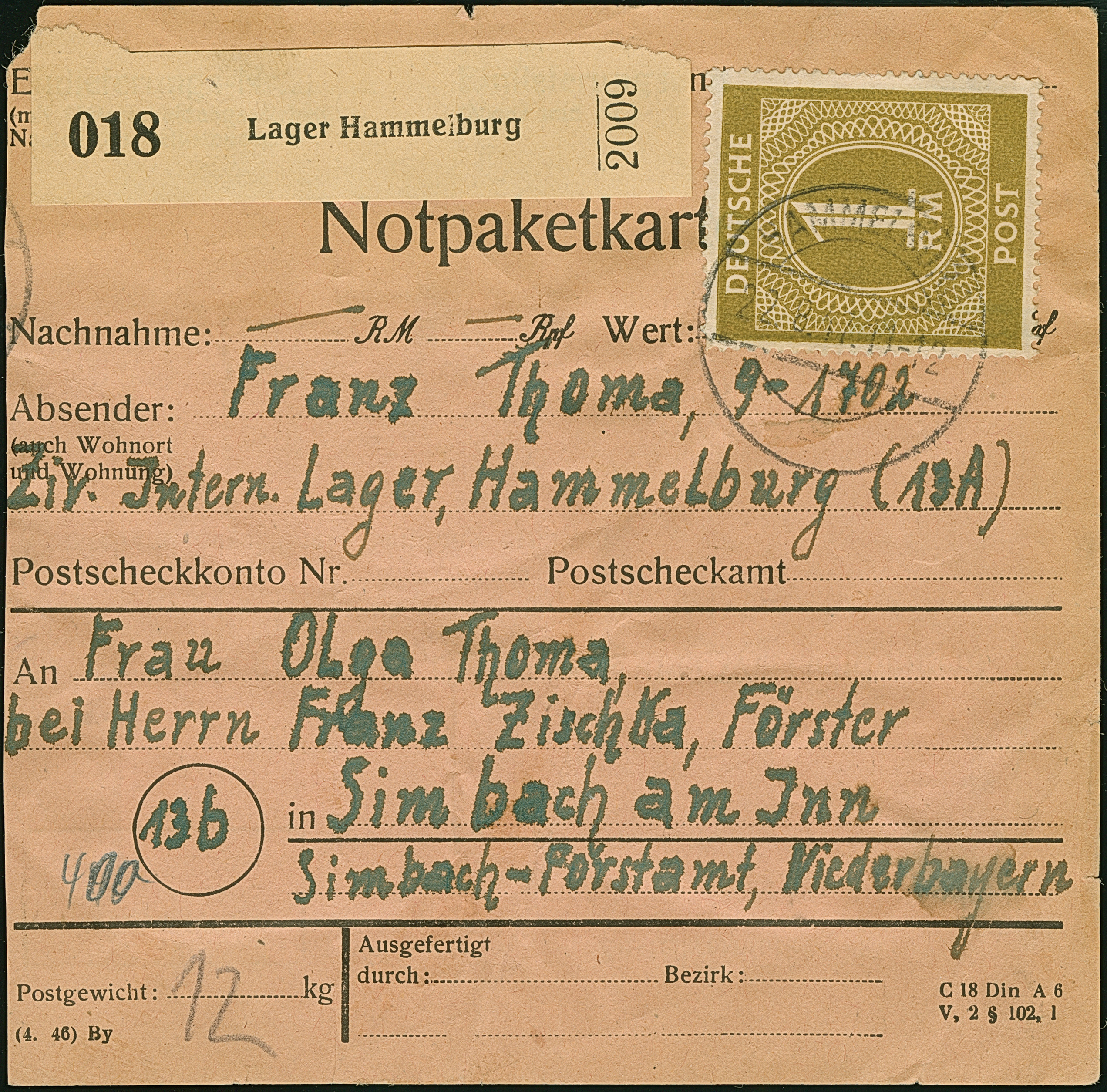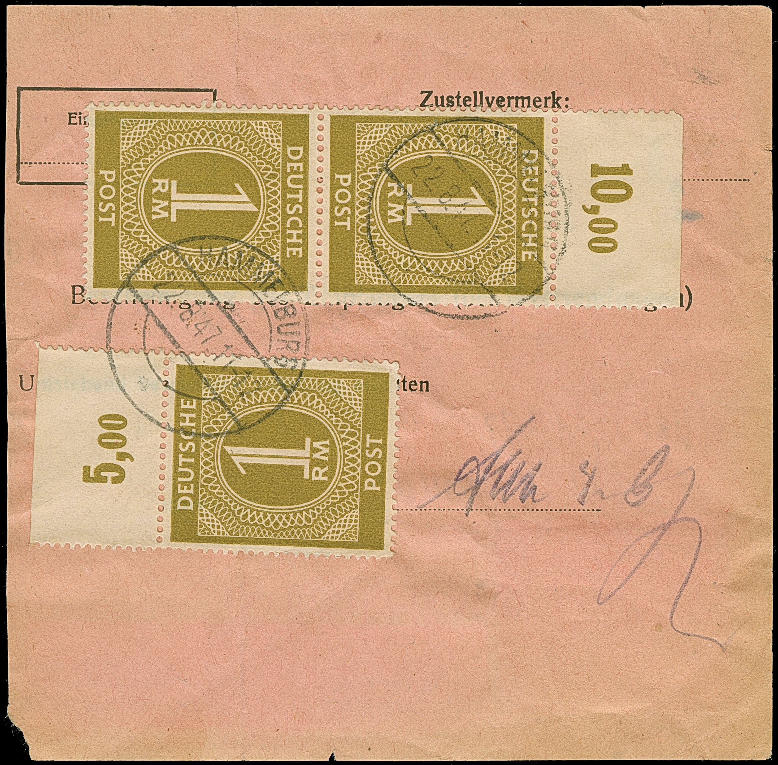 Ziffer 1 M. im senkrechten Oberrandpaar und zwei Einzelmarken (einmal mit durchgezähntem Oberrand) je mit Stempel “HAMMELBURG 22.8.47” als Mehrfachfrankatur vorder- und rückseitig auf Notpaketkarte aus Zivil-Interniertenlager nach Simbach. Die Paketkarte mit Beförderungsspuren, ansonsten in guter Erhaltung