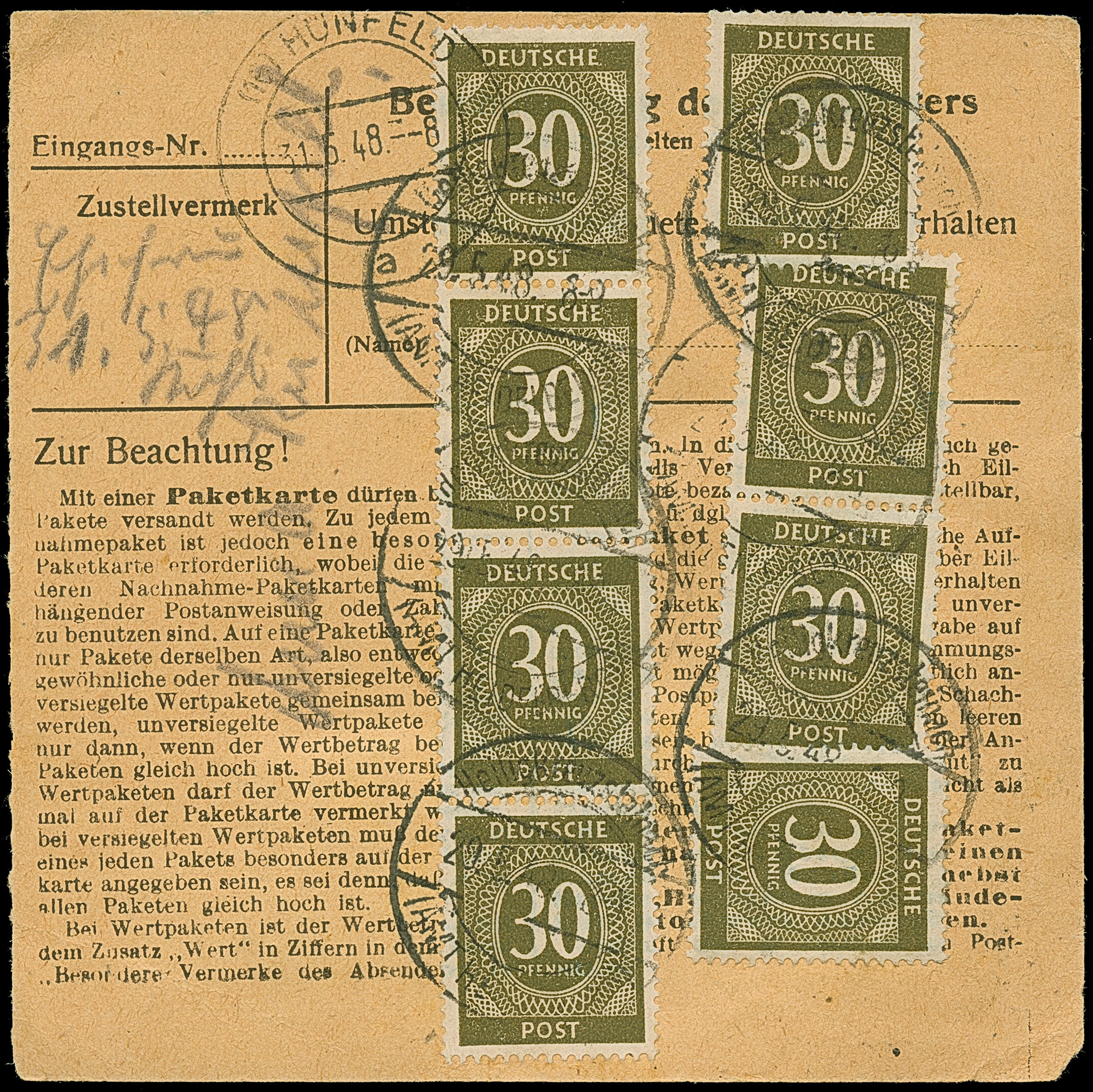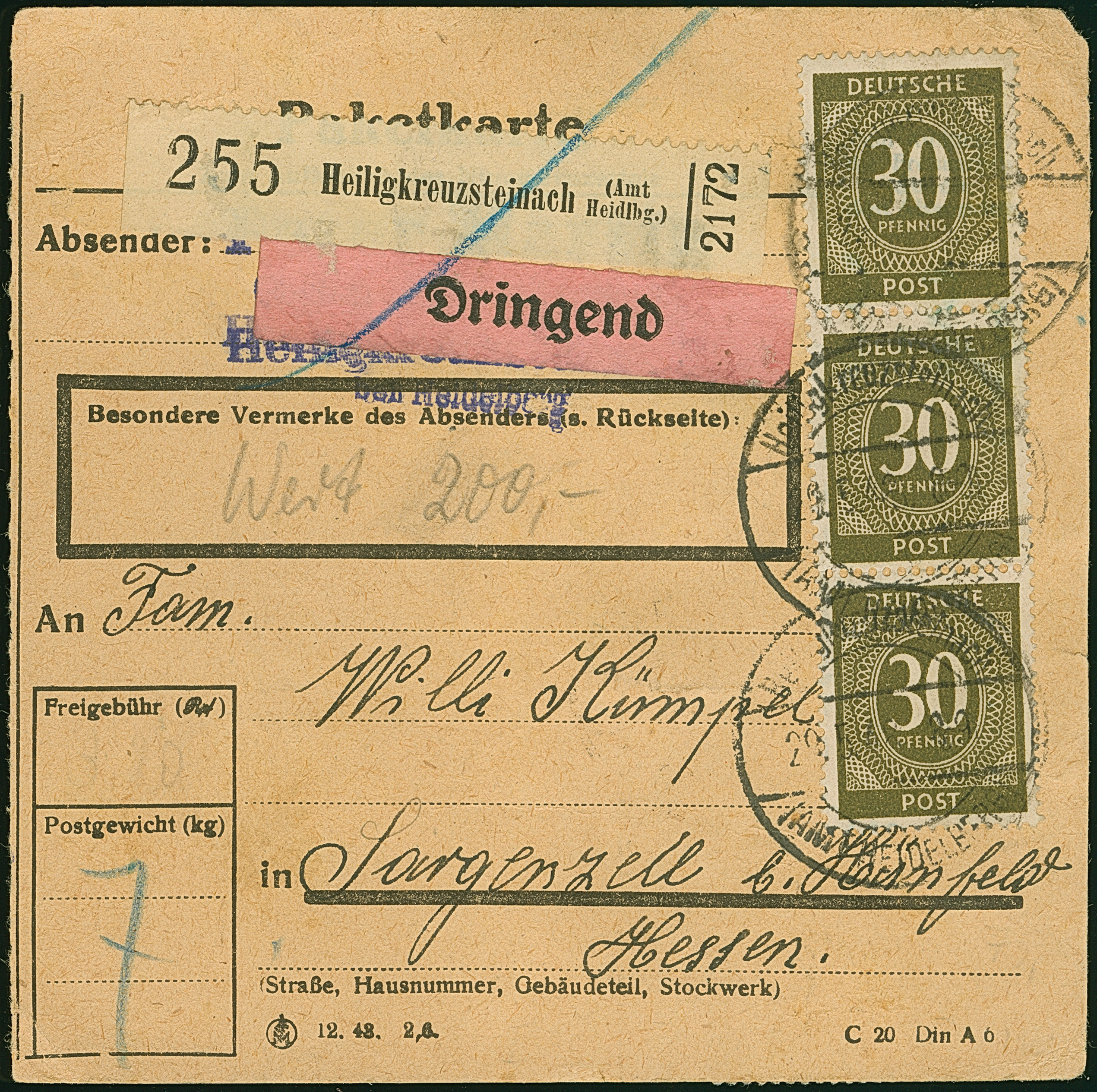 Ziffer 30 Pfg. im senkrechten Vierer- und Dreierstreifen, Paar und zwei Einzelmarken je mit Stempel “Heiligkreuzsteinach 29.5.48” vorder- und rückseitig auf Dringend-Wert-Paketkarte nach Sargenzell bei Hünfeld mit Ankunftsstempel, in guter Erhaltung. Eine nicht häufige Mehrfachfrankatur mit 11 Werten