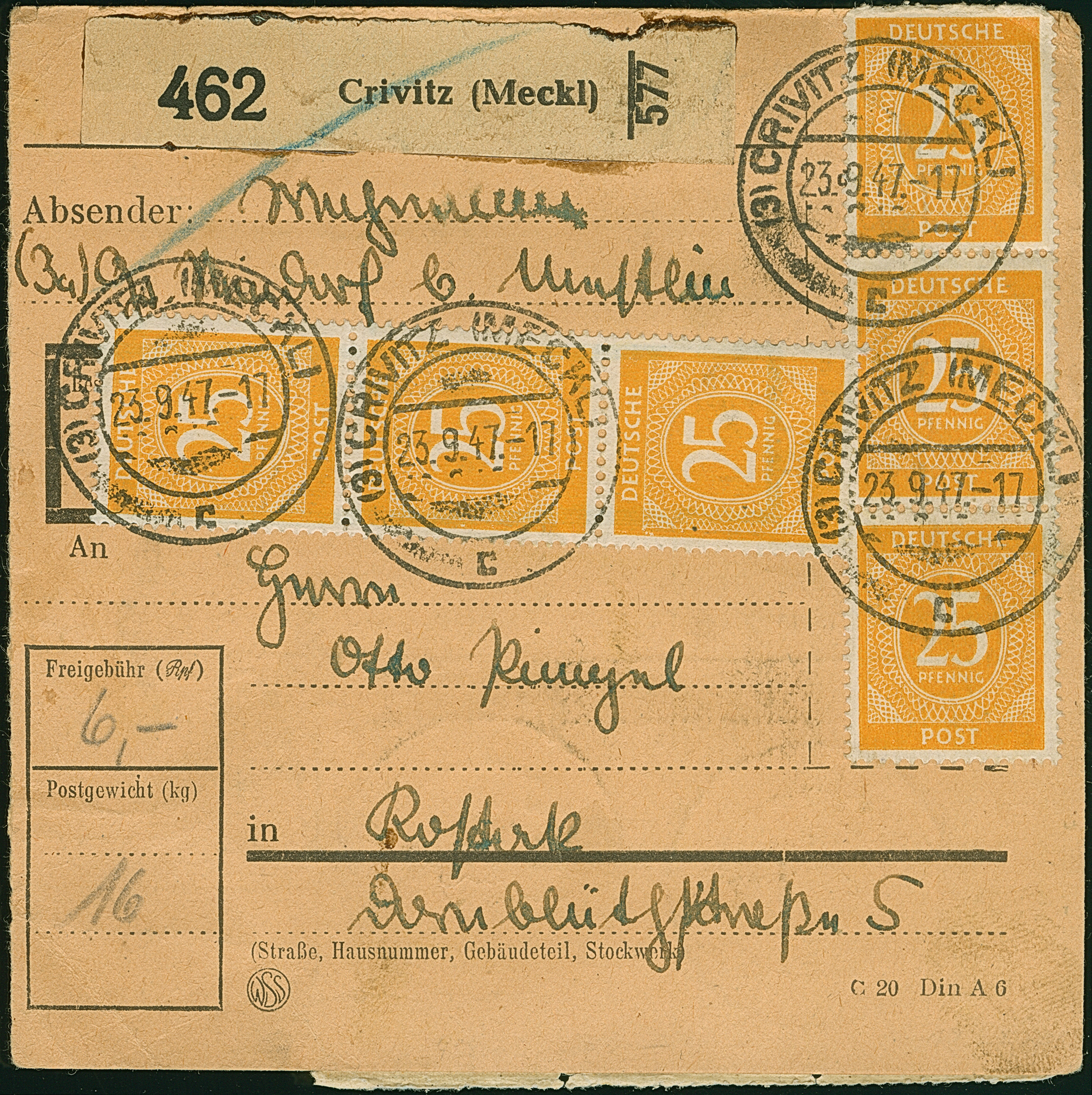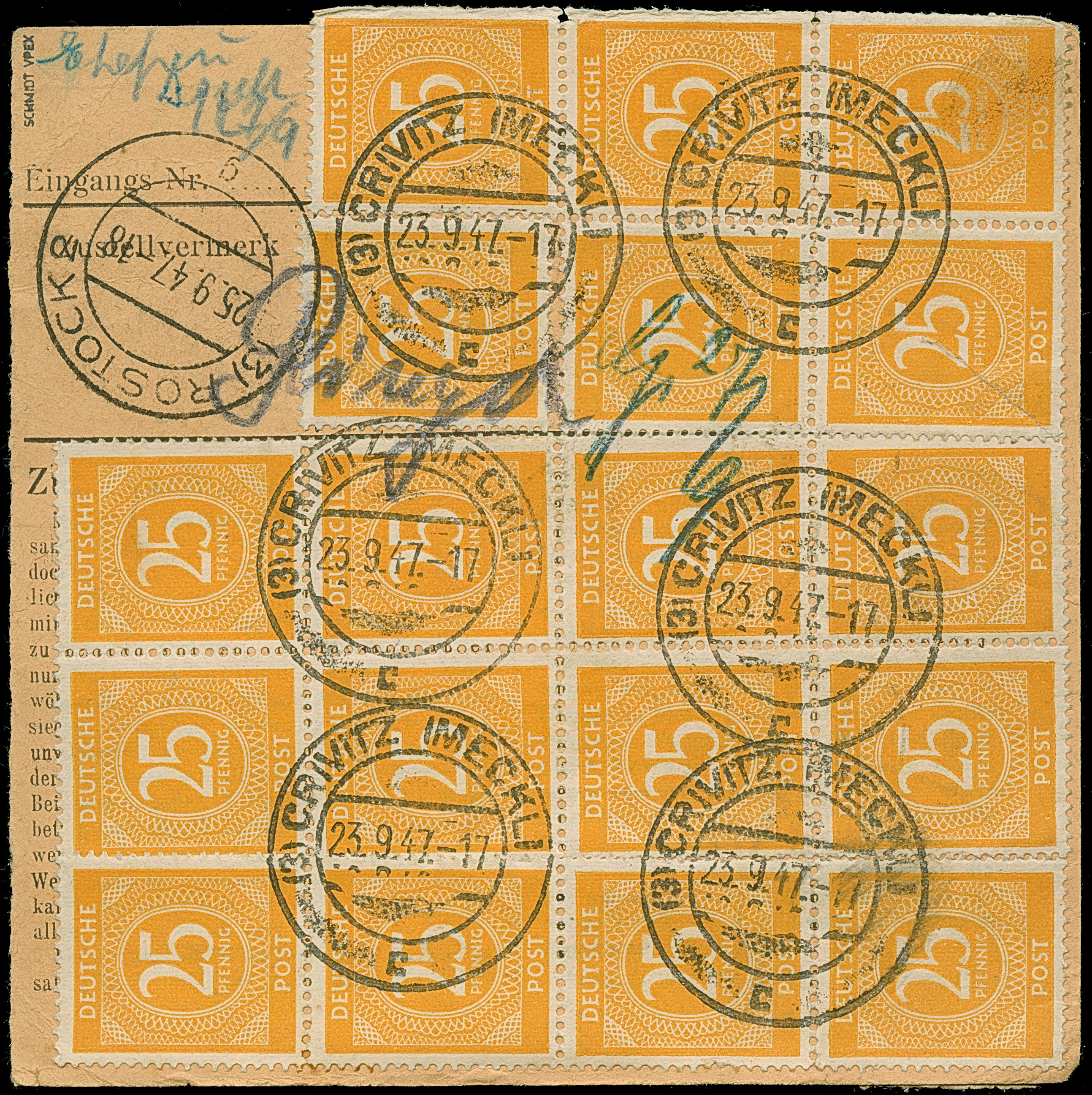 Ziffer 25 Pfg. gelb, 24 Werte mit Stempel “CRIVITZ 23.9.47” vorder- und rückseitig auf Paketkarte nach Rostock mit Ankunftsstempel. Die Marken zum Teil mit kleinen Fehlern durch Randklebung, ansonsten in guter Erhaltung. Eine nicht häufige Mehrfachfrankatur