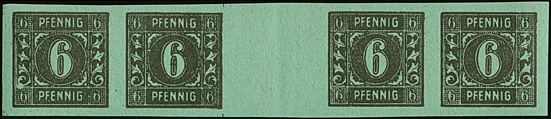 6 Pfg. auf hellblaugrün, ungezähnter Zwischensteg-Viererstreifen, postfrisch, tadellos, unsigniert