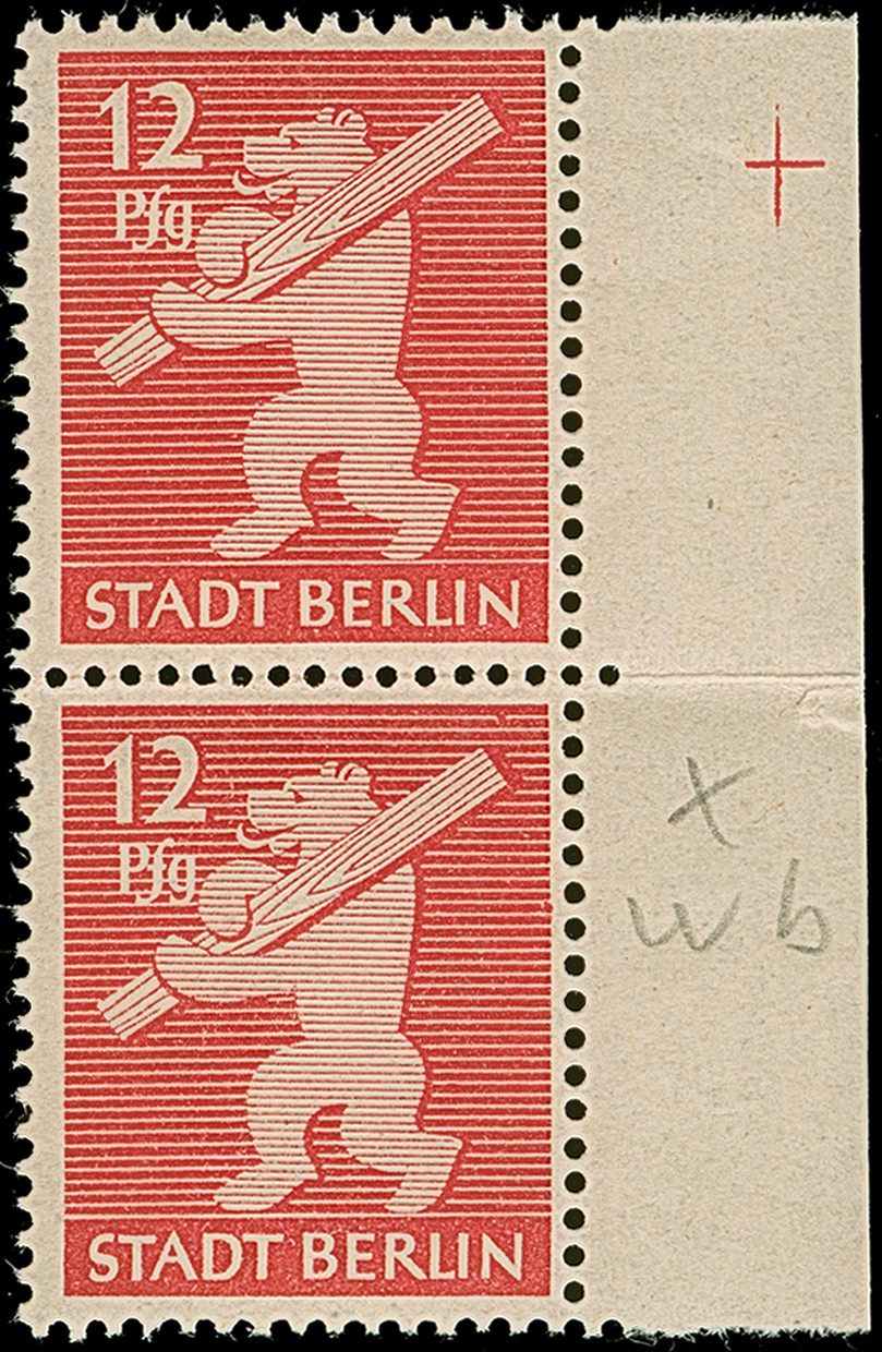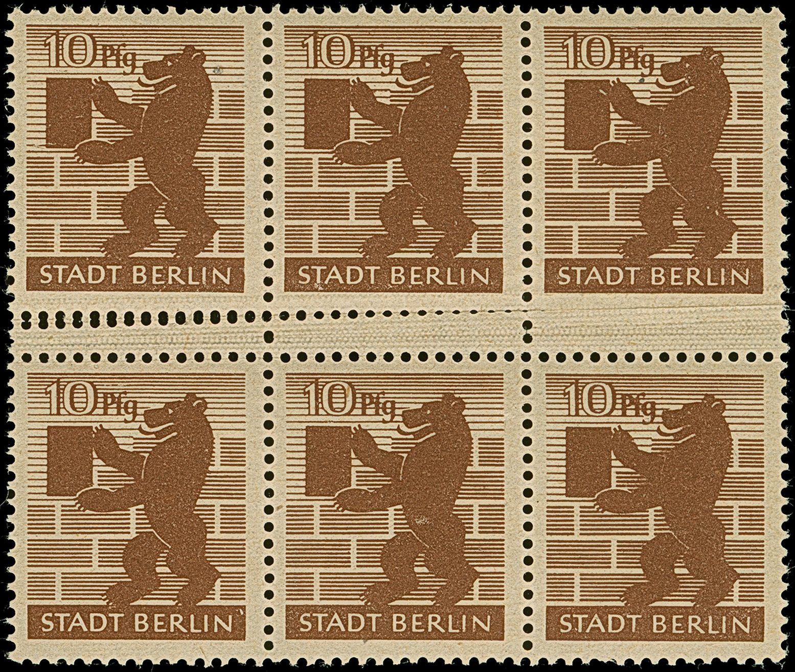 Berliner Bär 10 Pfg. im waagerechten 6er-Block, durch Druckfalte links mit 2 senkrechten Zwischensteg-Paaren, postfrisch. Ein interessante Abart.