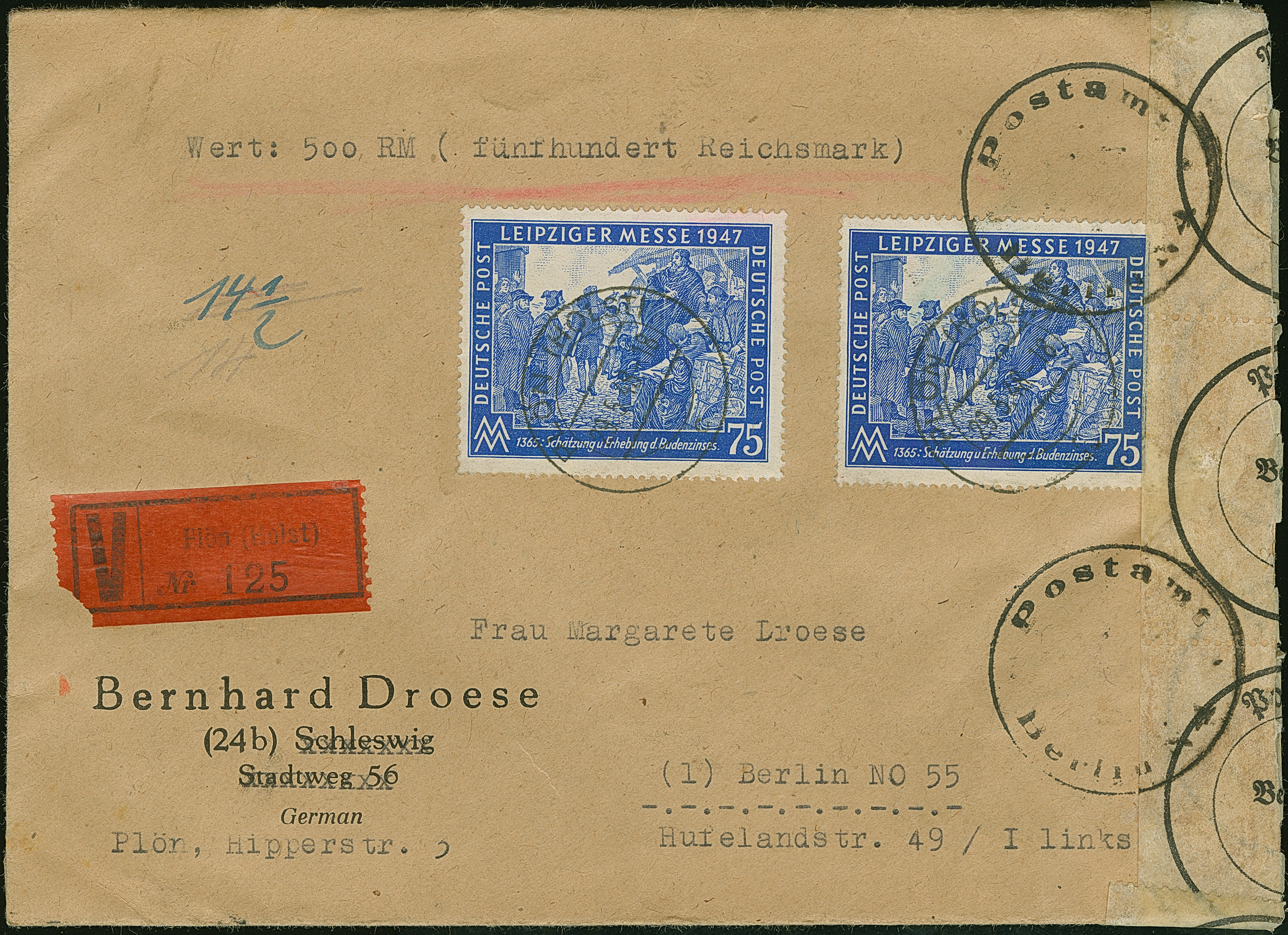 1947, Leipziger Frühjahrsmesse 75 Pfg., zwei Einzelmarken mit Stempel “PLÖN 29.5.48” auf Wertbrief über 500 M. nach Berlin NO55 mit Verschluss-Zettel vom Postamt N4 mit Dienstsiegeln und rückseitigem L4 “Beim PA Berlin N4 amtlich verschlossen…” und aufgeklebtem orangem Karton mit Text: “Postamt 4 II.4 Wertstelle/Als Inhalt wurde festgestellt…”. Der Umschlag rechts mit Öffnungssfehlern, ansonsten in guter Erhaltung. In dieser Kombination eine seltene Zensur