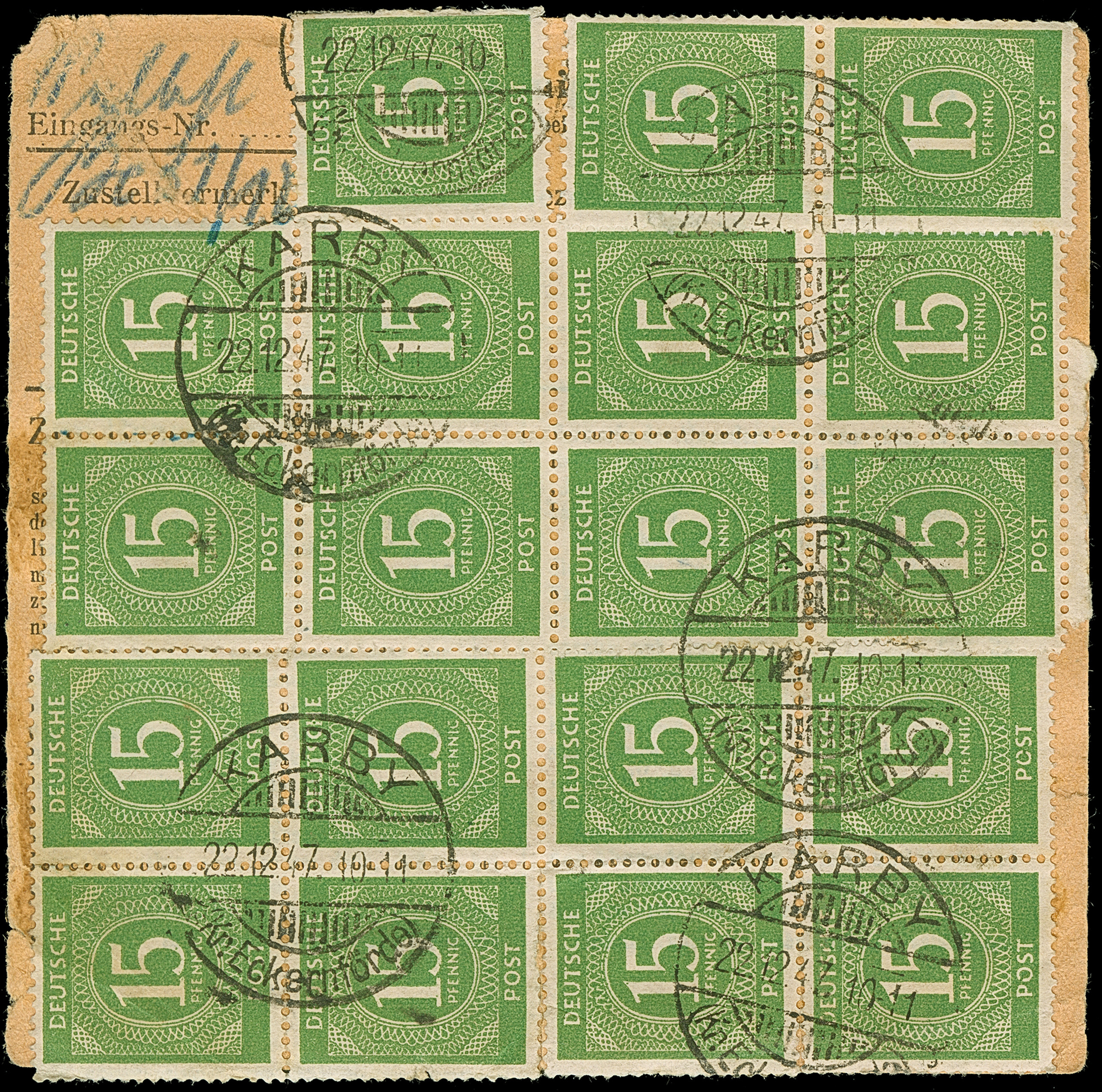 Ziffer 15 Pfg. grün, 22 Werte mit Stempel “KARBY 22.12.47” vorder- und rückseitig auf Paketkarte nach Itzehohe. Die Marken zum Teil Zahnfehler durch Randklebung und Paketkarte oben mit Einriss, ansonsten in guter Erhaltung