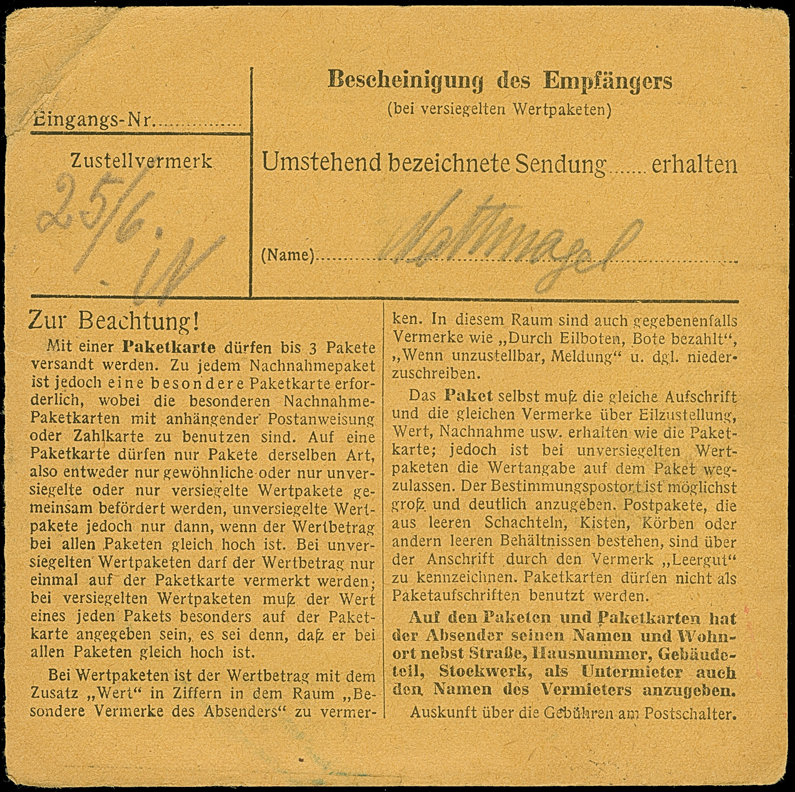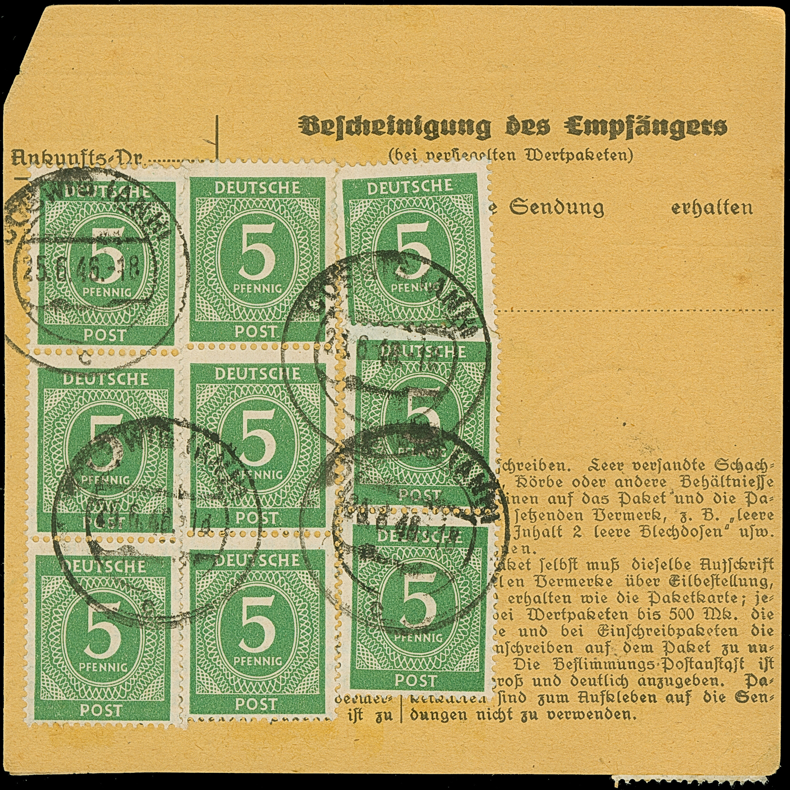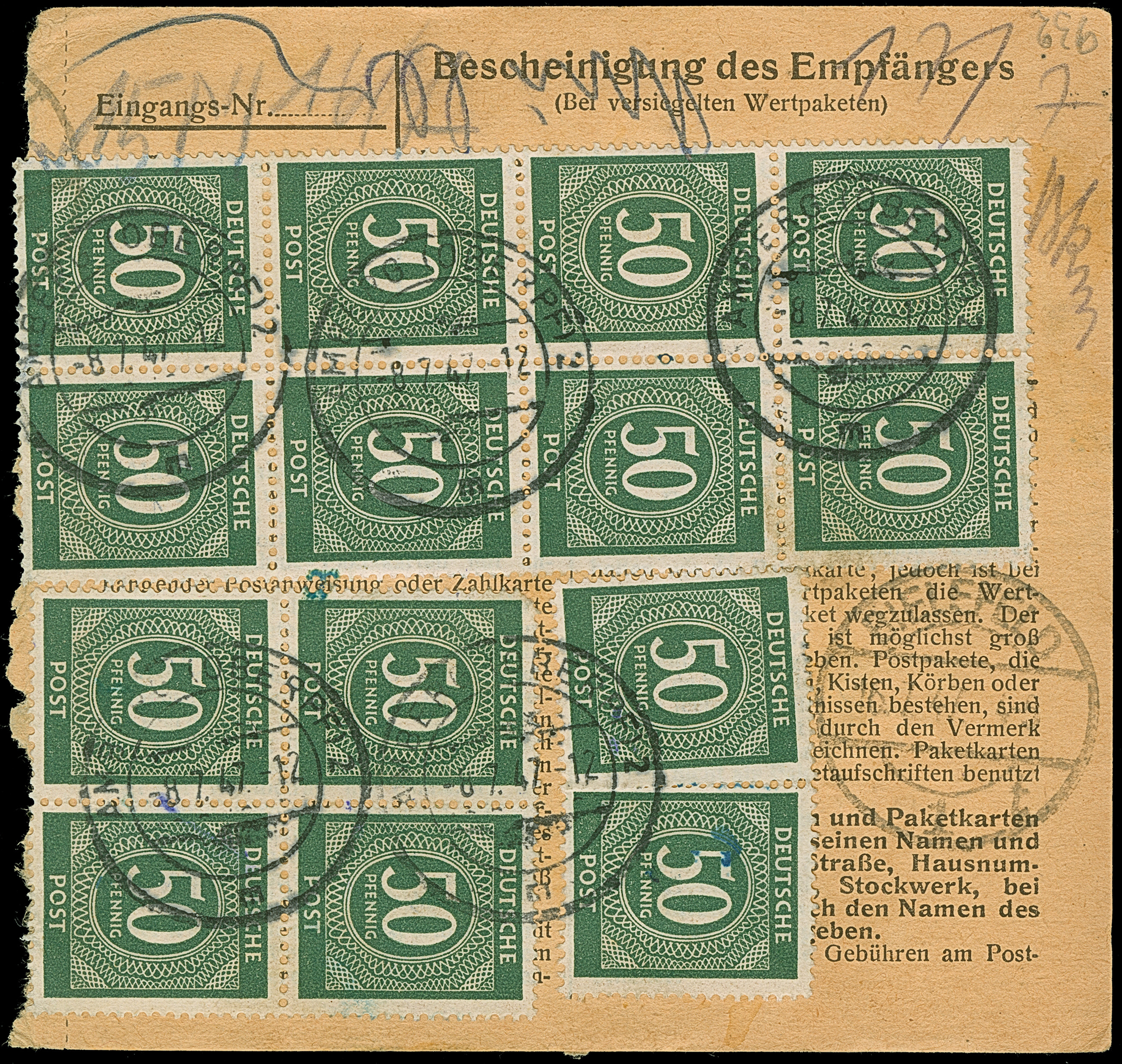 Ziffer 50 Pfg. im senkrechten 8er-Block, Viererblock mit Eckzahnfehler und drei Einzelmarken je mit Stempel “AMBERG 8.7.47” als Mehrfachfrankatur vorder- und rückseitig auf Paketkarte nach Bielefeld mit Ankunftsstempel. Vier Werte mit leichter Randklebung, in guter Gesamterhaltung