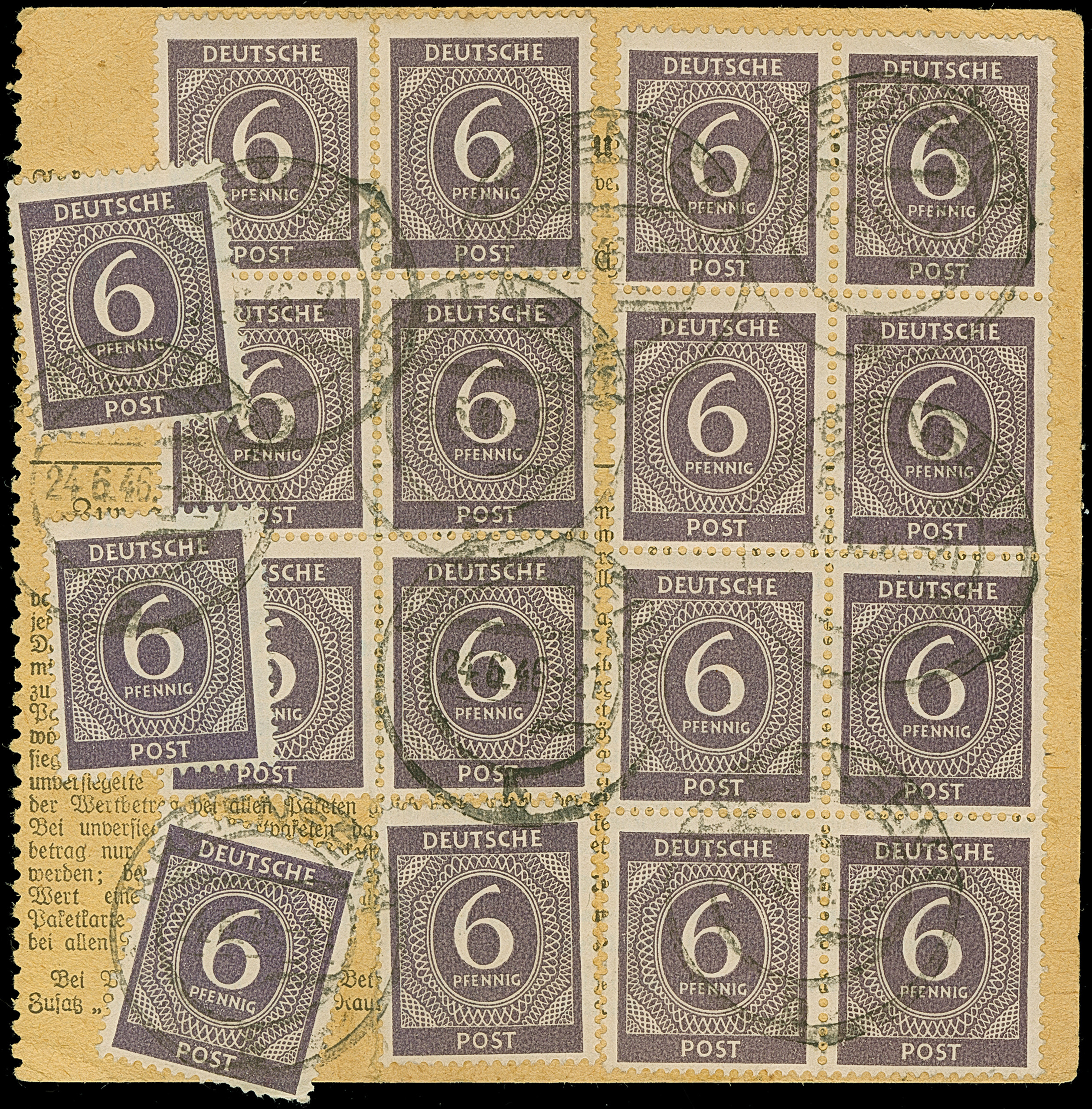 Ziffer 6 Pfg., 20 Werte mit Stempel “KREIENSEN 24.6.46” als Mehrfachfrankatur vorder- und rückseitig auf Paketkarte mit Poststellen II-Stempel “Eilensen über Kreiensen” als Paketzettel in ein Interniertenlager in Klausheide mit Nachsendung. Die Paketkarte mit senkrechter Faltung und Einriss oben, dieser geht durch die senkrechte Zähnung einer Einheit auf der Rückseite und zwei Marken mit kleinen Eckzahnfehlern, ansonsten in guter Erhaltung. Eine nicht häufige Mehrfachfrankatur