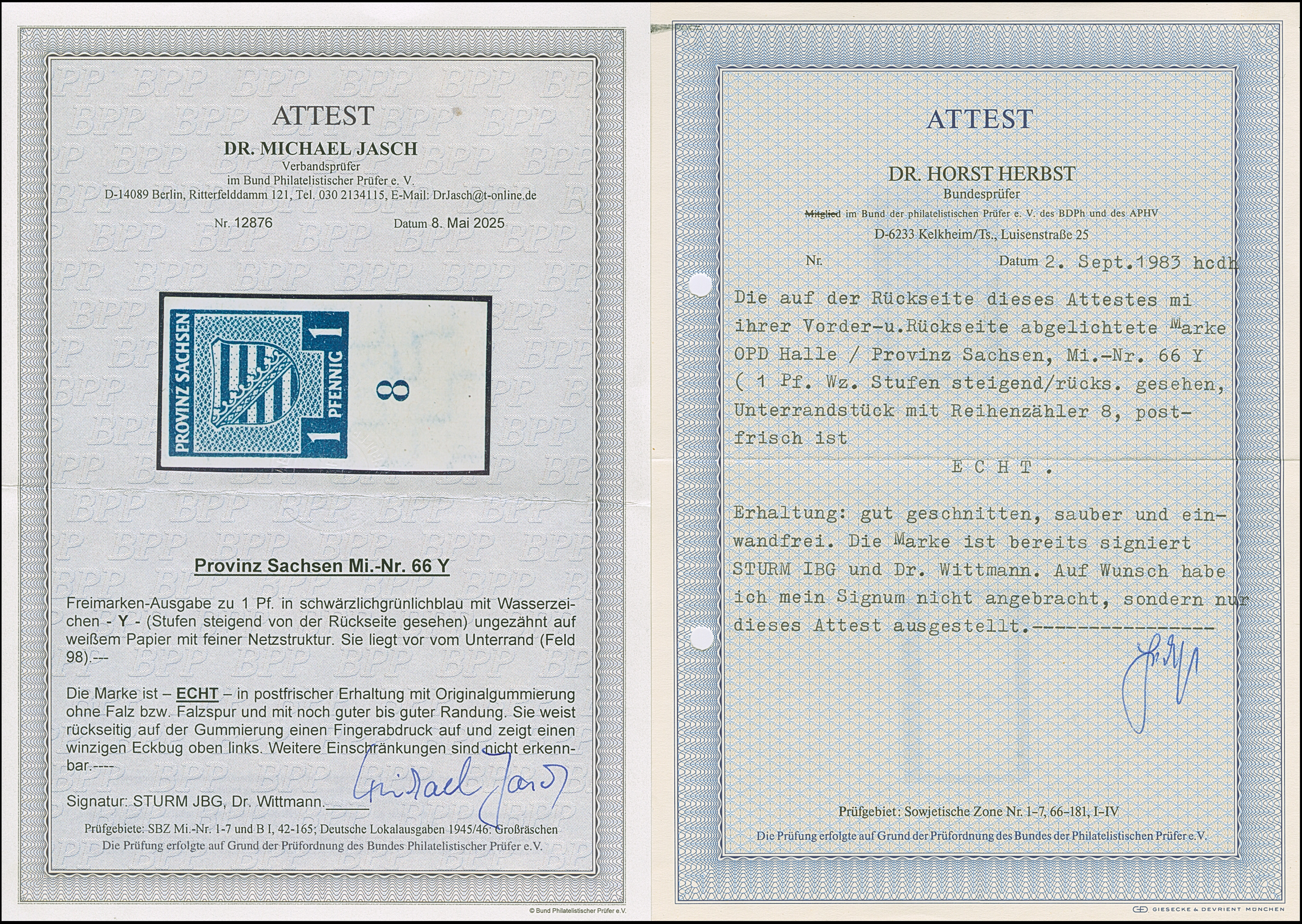 1945, Wappen mit Wasserzeichen “Stufen steigend”, 1 Pfg. , allseits breitrandiges Unterrandstück, postfrisch. Zarte Fingerspur und winziger, minimaler Eckbug außerhalb des Markenbildes, sonst tadellos . Eine der großen Seltenheiten der SBZ. sign. Sturm und Dr. Wittmann, Fotoatteste Dr. Herbst BPP (1983) und Dr. Jasch BPP (2025)