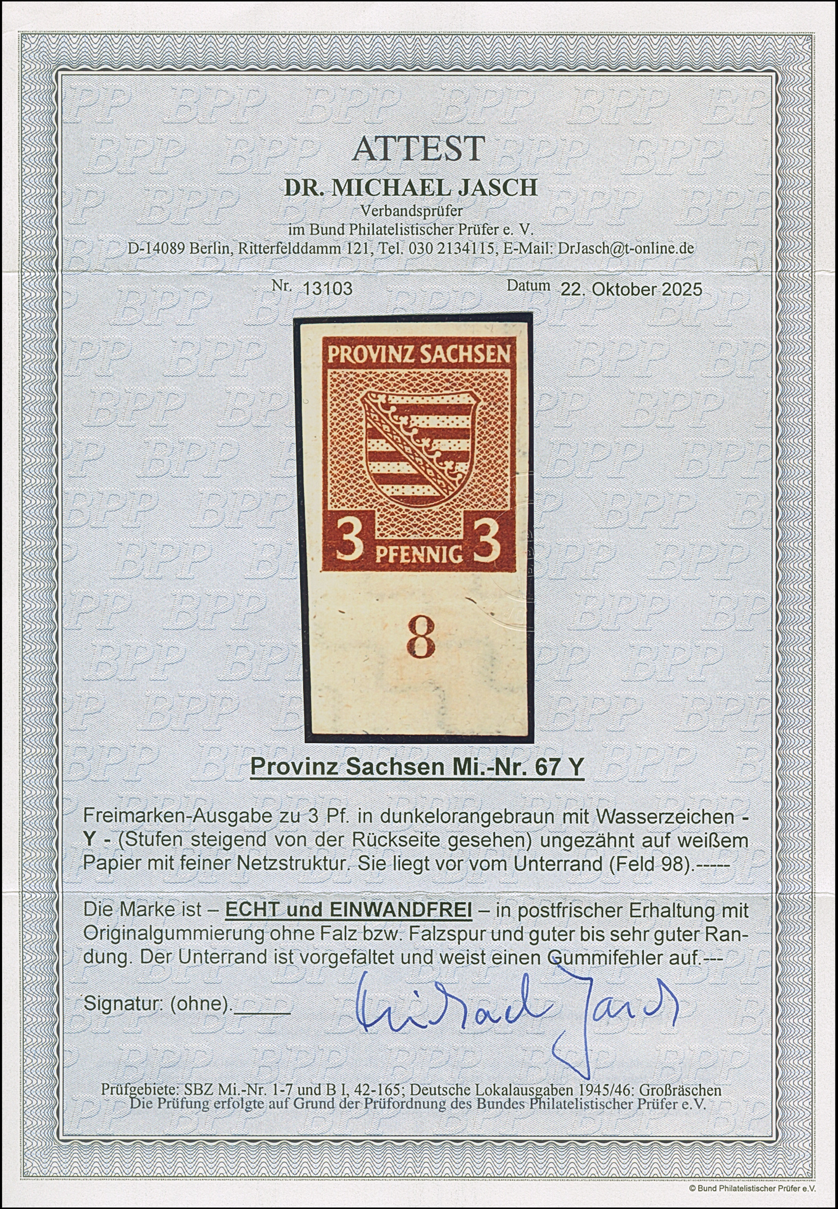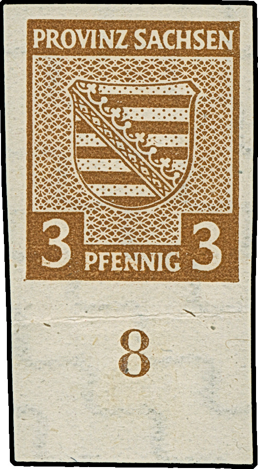1945, Wappen 3 Pfg. mit Wasserzeichen “Stufen steigend”, Unterrandstück, allseits breitrandig und postfrisch. Marke tadellos, der Unterrand ist vorgefaltet mit kleinem Gummifehler. Eine der großen Seltenheiten der SBZ. Sign. Busch sowie Fotoattest Dr. Jasch BPP (2025)