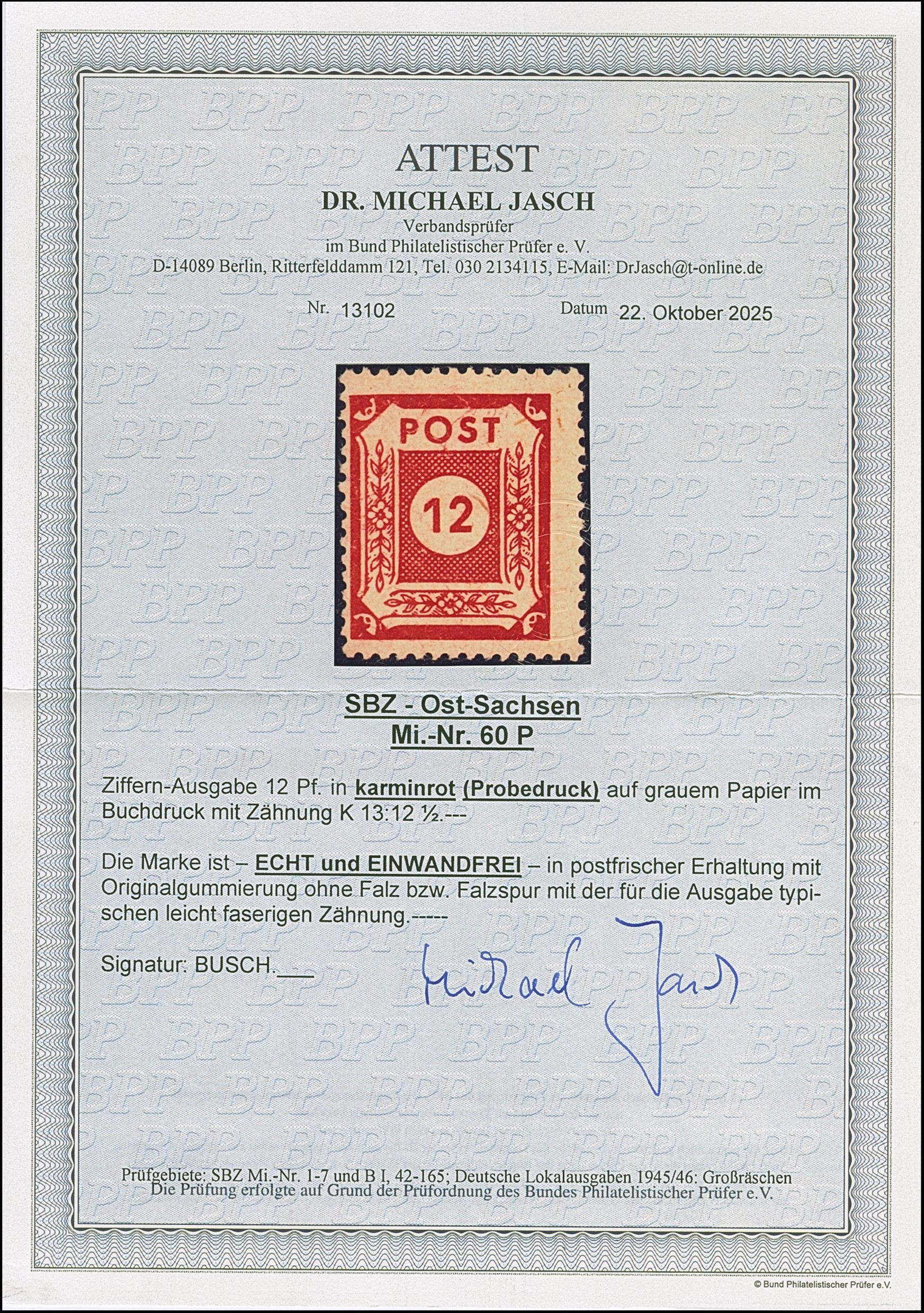 1945, Ziffern 12 Pfg. karminrot, Probedruck auf grauem Papier mit typischer faseriger Zähnung K 13:12 ½, postfrisch und tadellos, sign. Busch sowie Fotoattest Dr. Jasch BPP (2025)