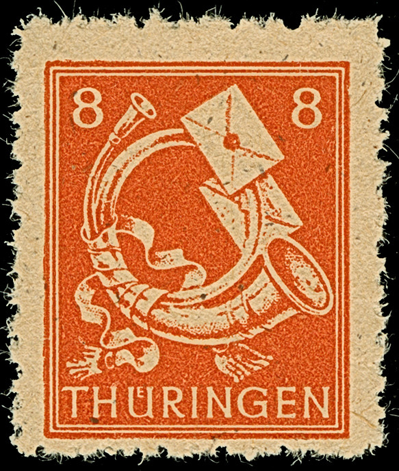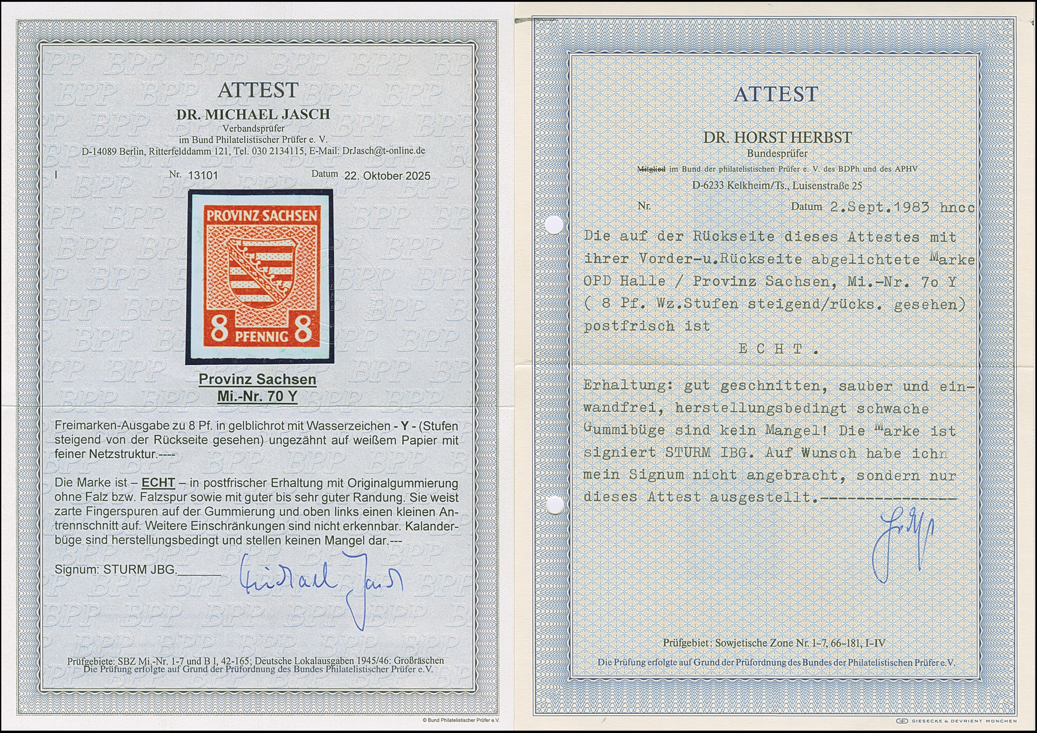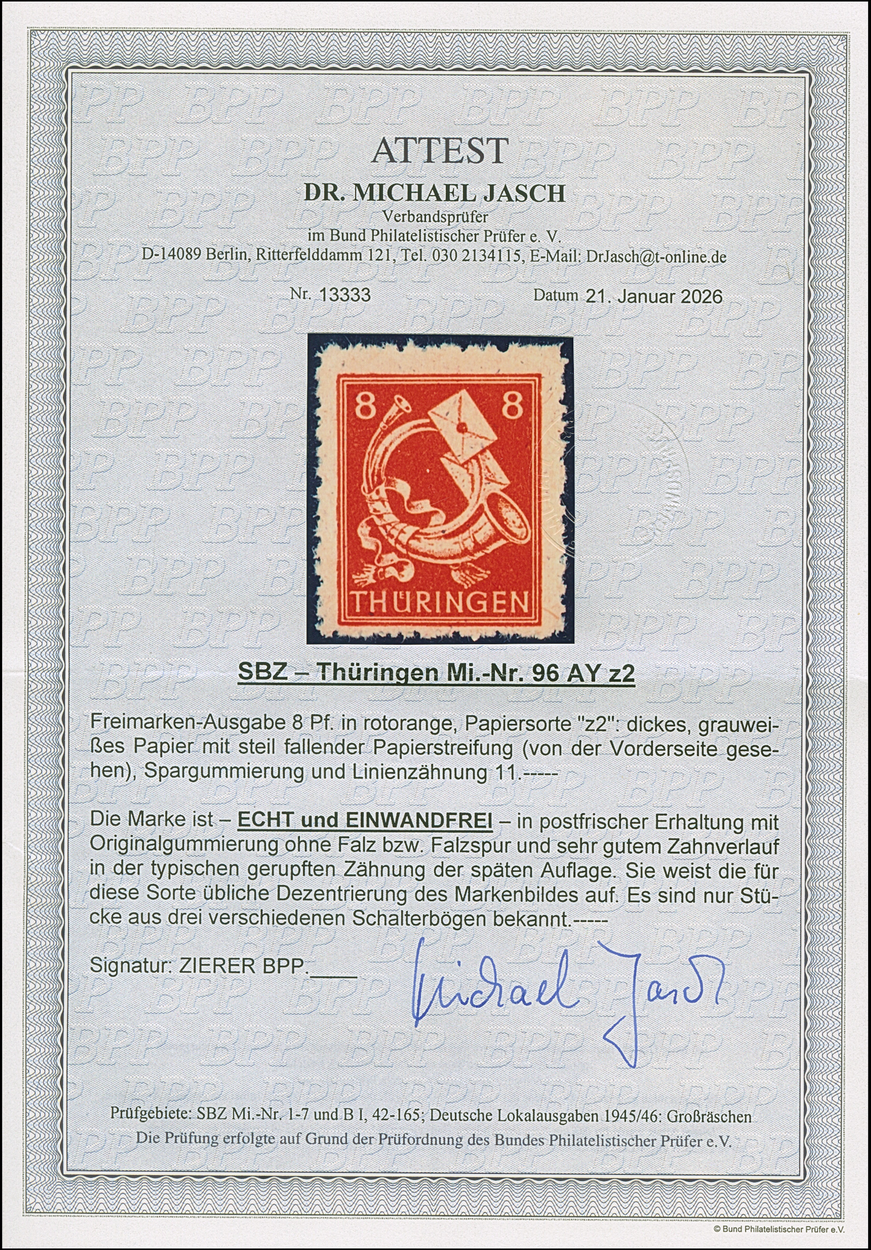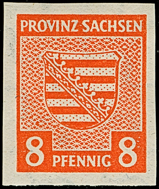 1945, Wappen 8 Pfg. mit Wasserzeichen “Stufen steigend”, allseits breitrandig, postfrisch mit einer winzigen Fingerspur und herstellungsbedingten Kalanderbügen, sowie links oben ein kaum sichtbarer Vortrennschnitt, sonst tadellos. Eine der großen Seltenheiten der SBZ. Sign. sowie Fotoatteste Herbst BPP (1983) und Dr. Jasch (2025)