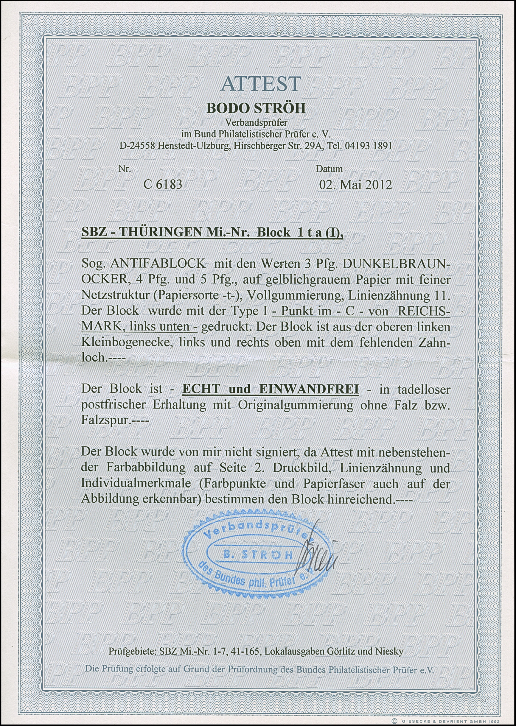 Antifa-Block auf gelblichgrauem Papier, Blocktype 1 aus der linken oberen Kleinbogen-Ecke, postfrisch, in tadelloser Erhaltung, unsigniert mit Fotoattest Ströh BPP (2012)