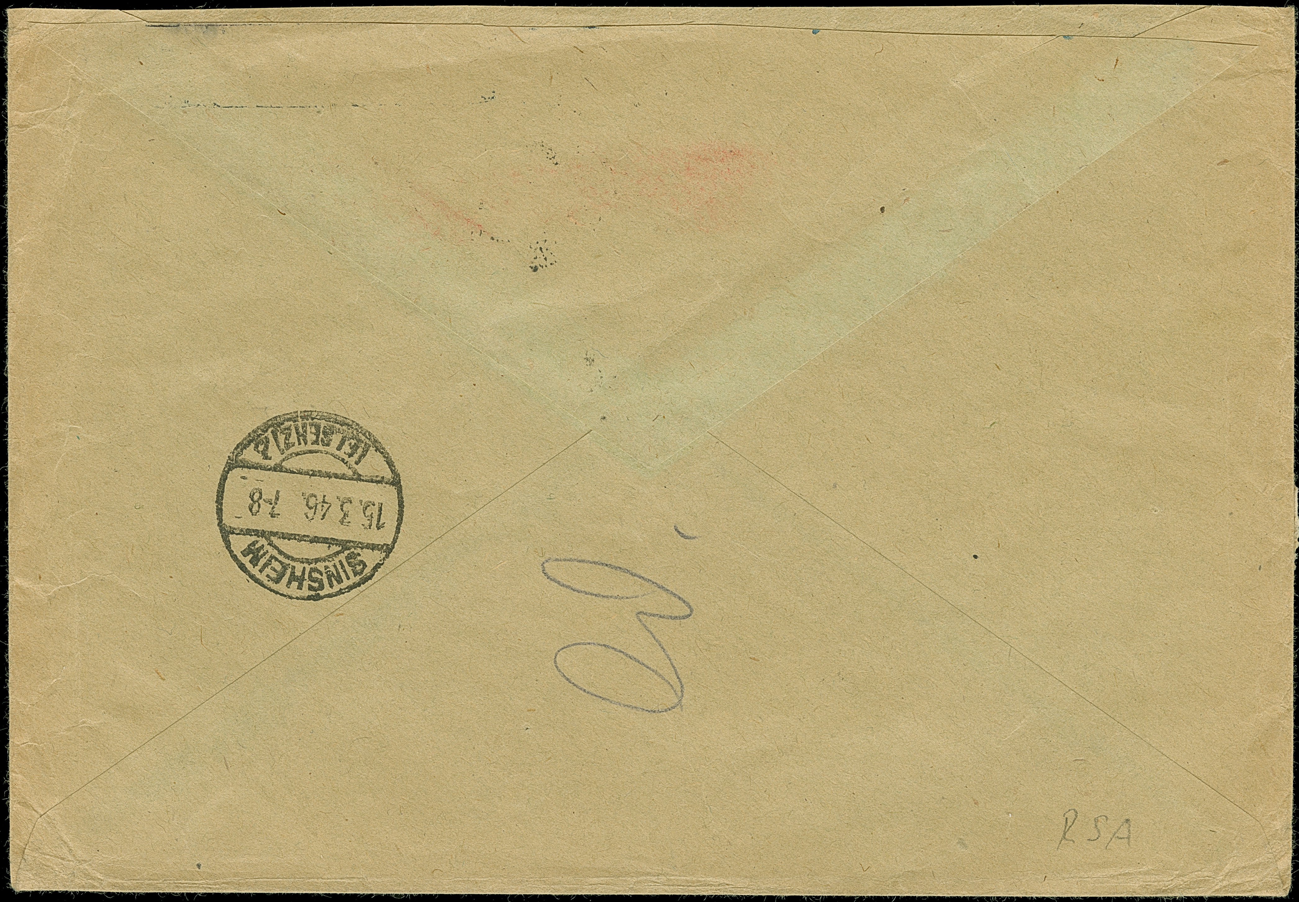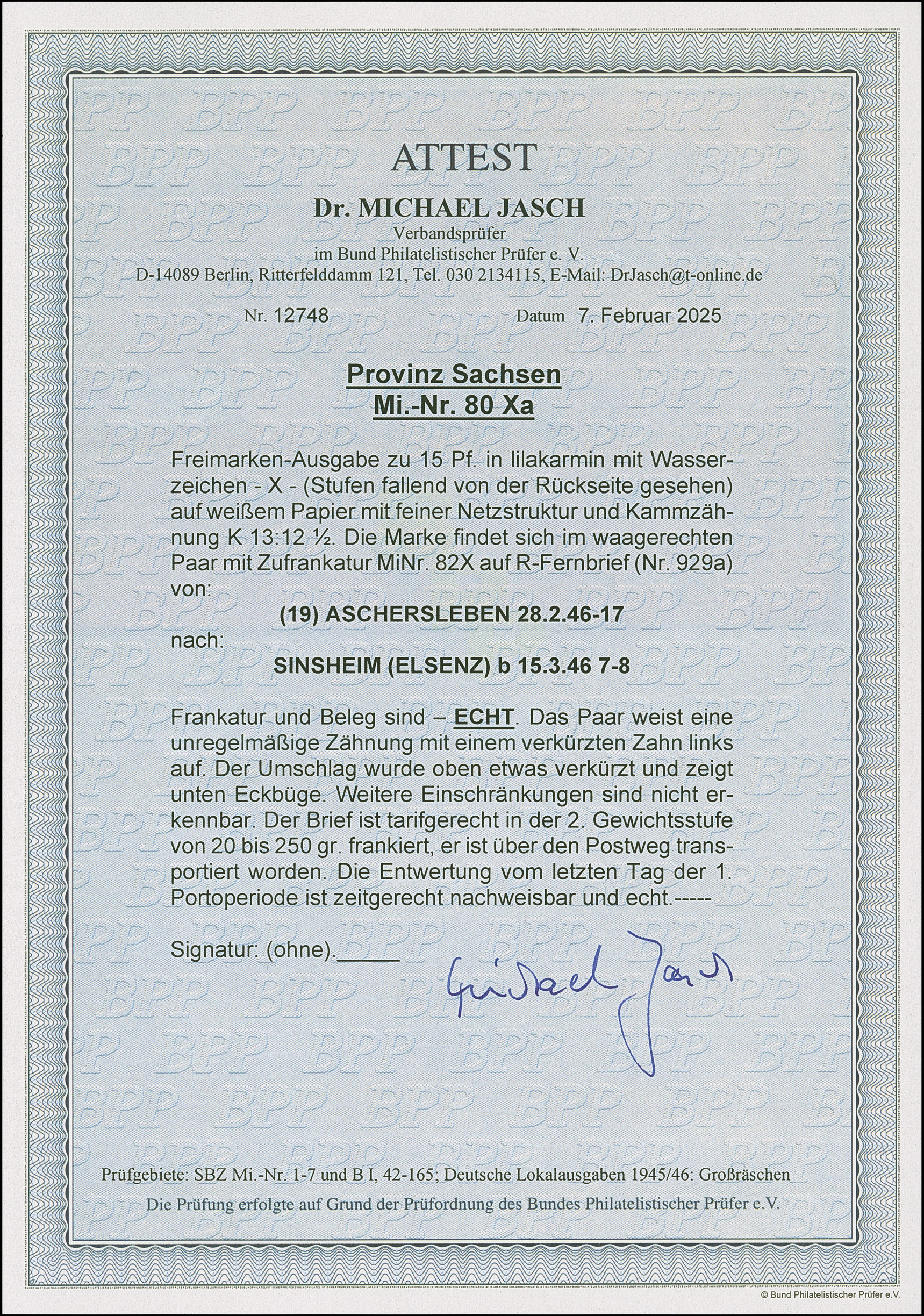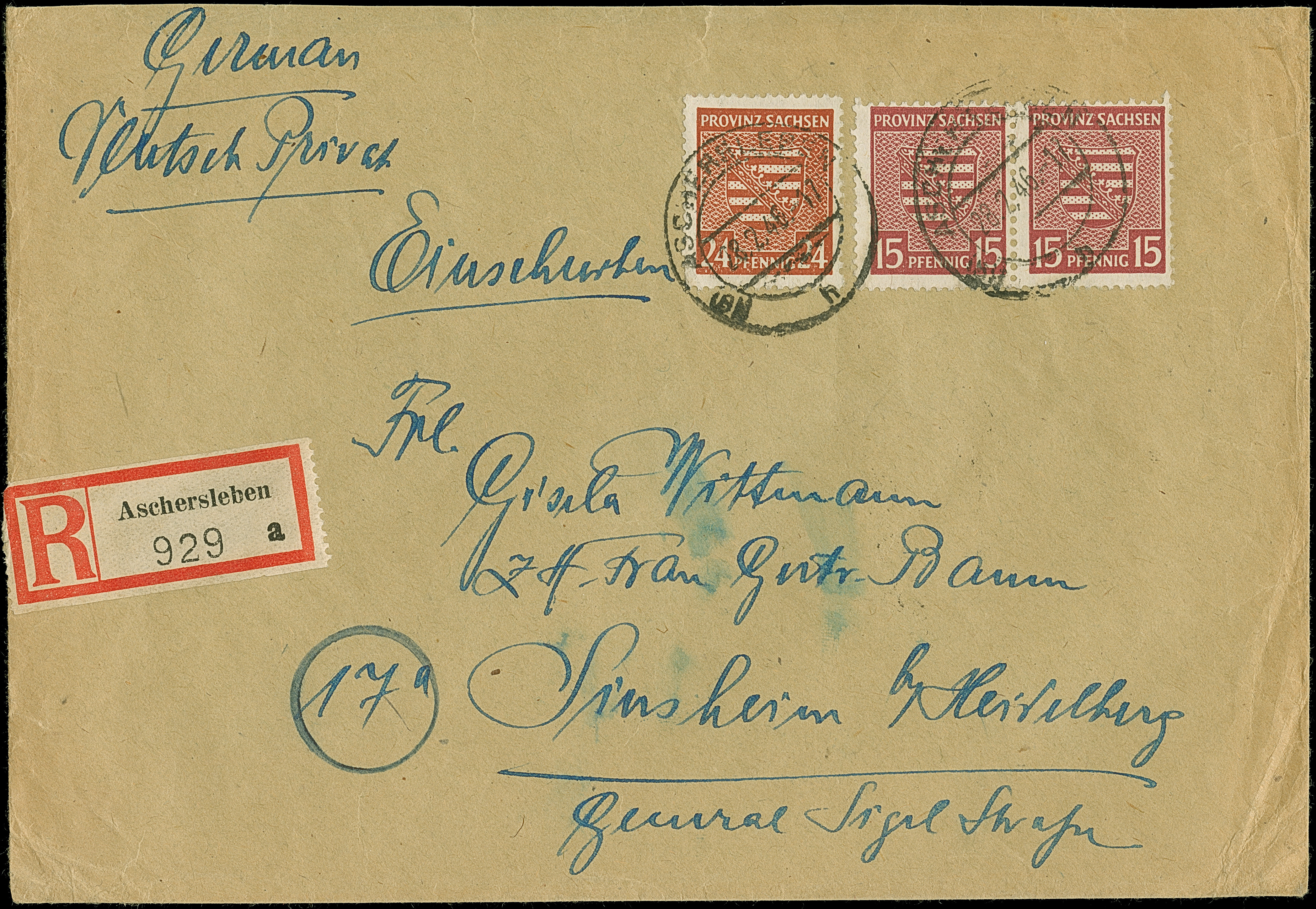 1945, Wappen 15 Pfg. mit Wasserzeichen 1 X im waagerechten Paar, mit Zufrankatur Wappen 24 Pfg., auf portogerechtem R-Fernbrief der 2. Gewichtsstufe von “(19) ASCHERSLEBEN 28.2.46” nach Sinsheim mit Ankunftsstempel, das Paar unregelmäßig gezähnt und die linke Marke mit leicht verkürztem Zahn, sonst einwandfrei, Umschlag oben leicht verkürzt mit üblichen Beförderungsspuren, sehr selten, Fotoattest Dr. Jasch BPP (2025)