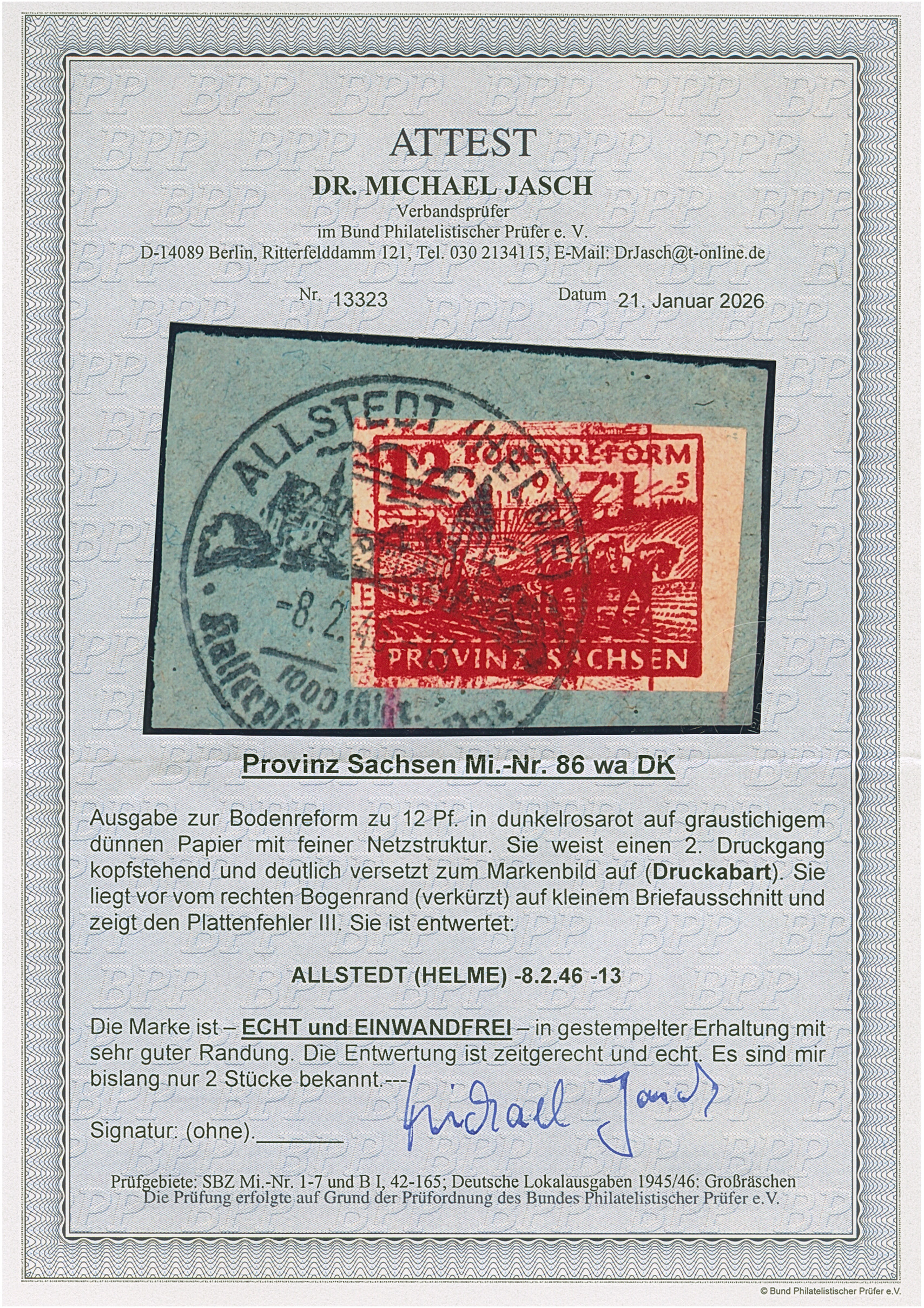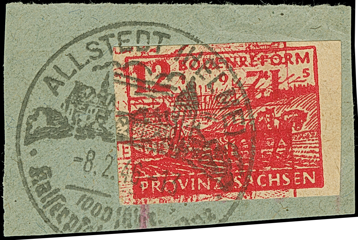 Bodenreform 12 Pfg. mit Doppeldruck, davon einer kopfstehend, allseits breitrandig mit sauber aufgesetztem Werbestempel “ALLSTEDT(HELME) 1000 Jahre Kaiserpfalz 8.2.46” auf Briefstück. Tadlos. Eine große SBZ-Seltenheit; es ist bisher nur ein weiteres Stück dieser markanten Abart registriert. Fotoattest Dr. Jasch PPP (2026)
