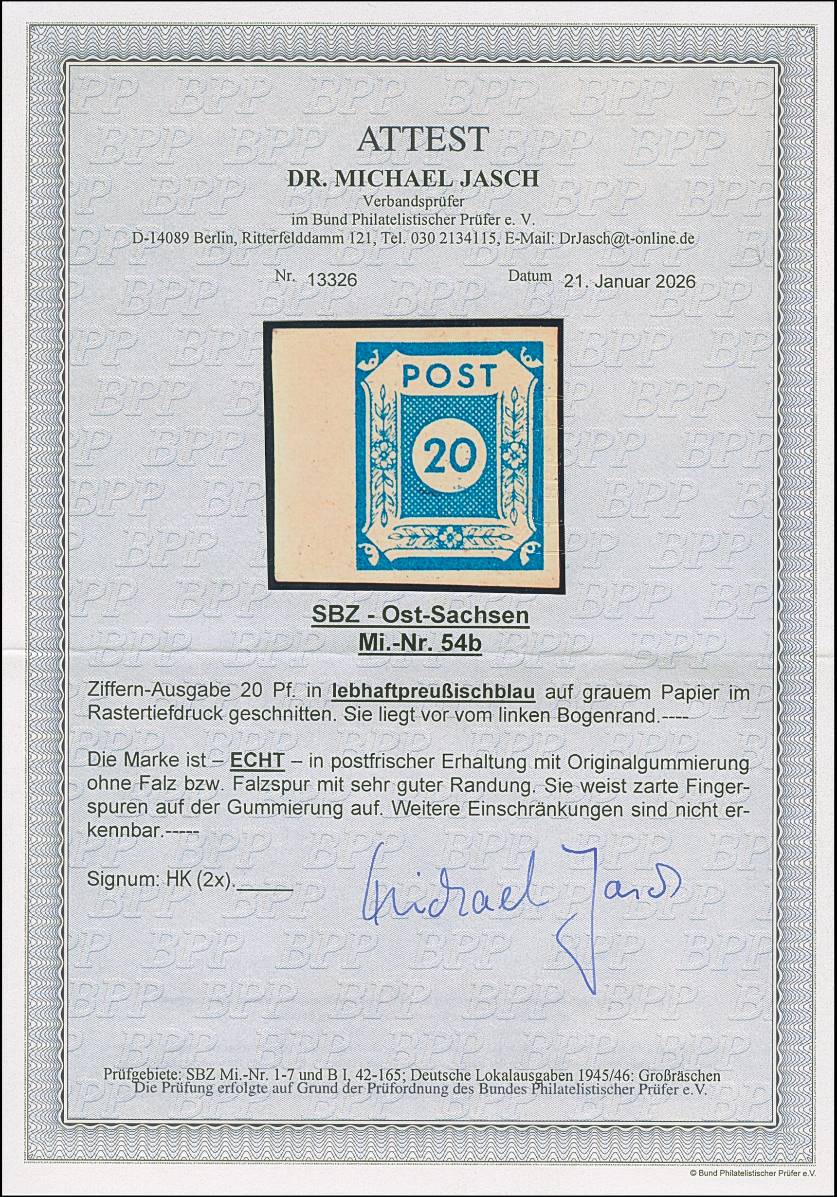 1945, Ziffer 20 Pfg. lebhaftpreußischblau, postfrisch, zarte Fingerspuren, sonst tadellos. Unsigniert, Fotoattest Dr. Jasch BPP (2026)