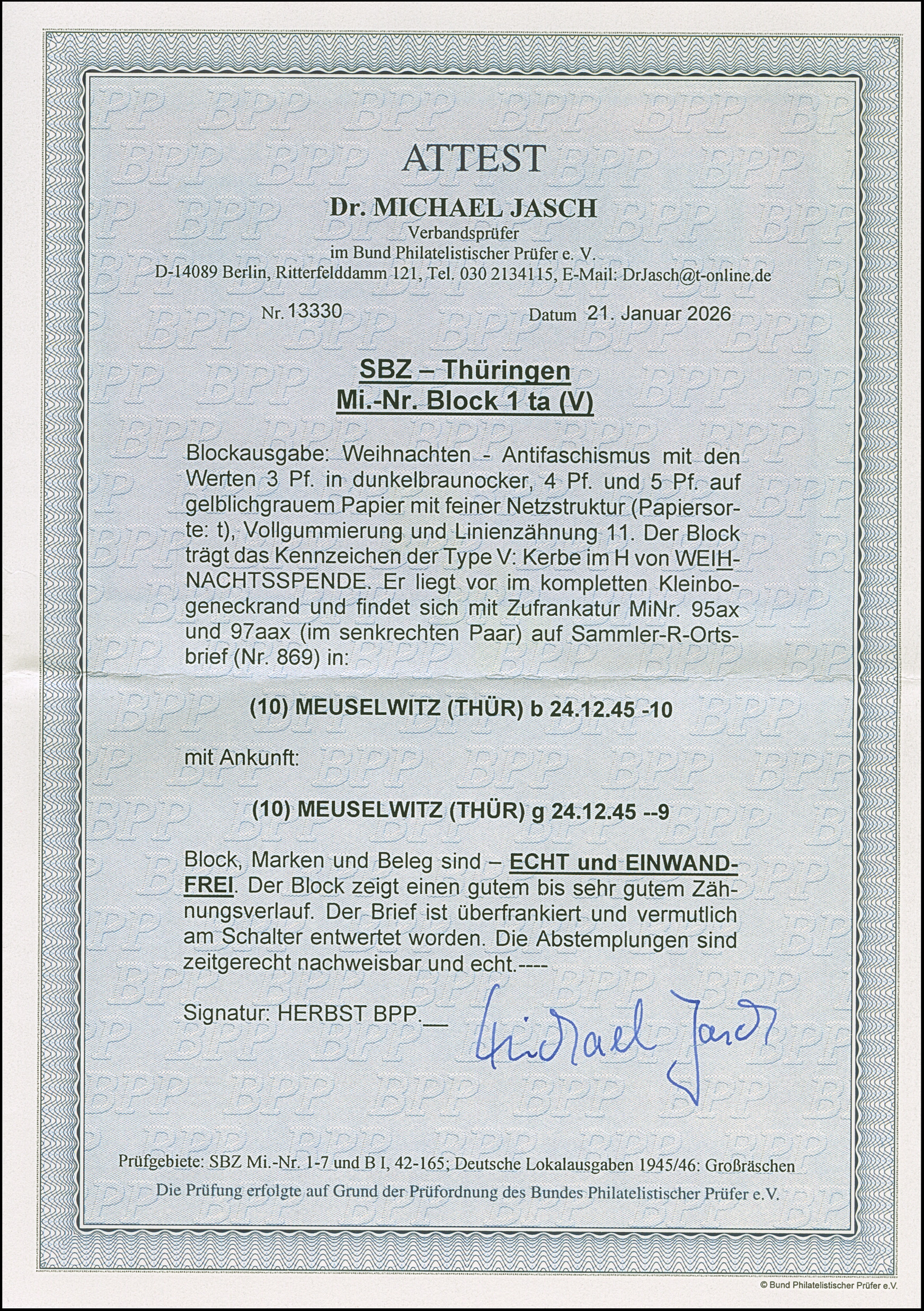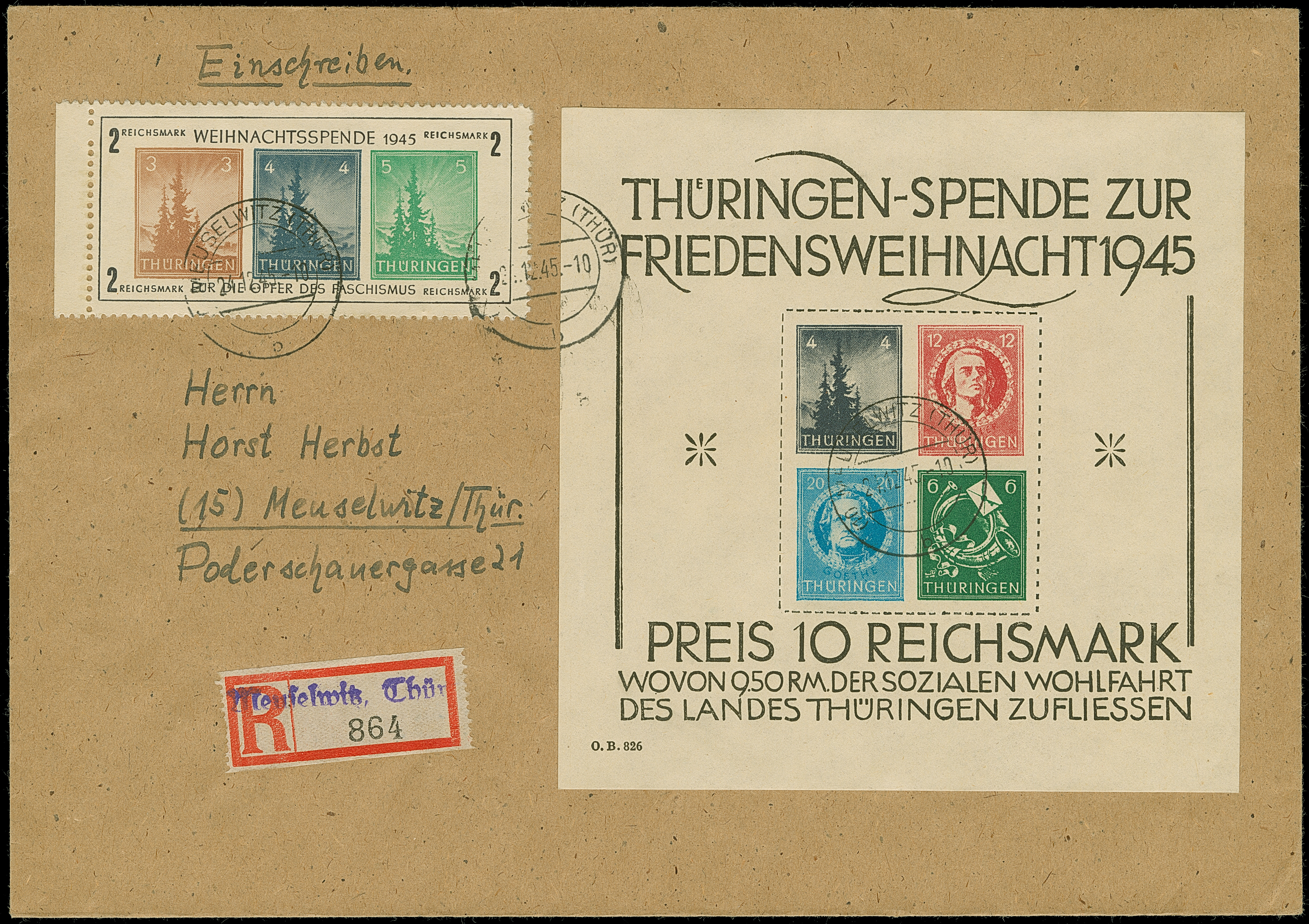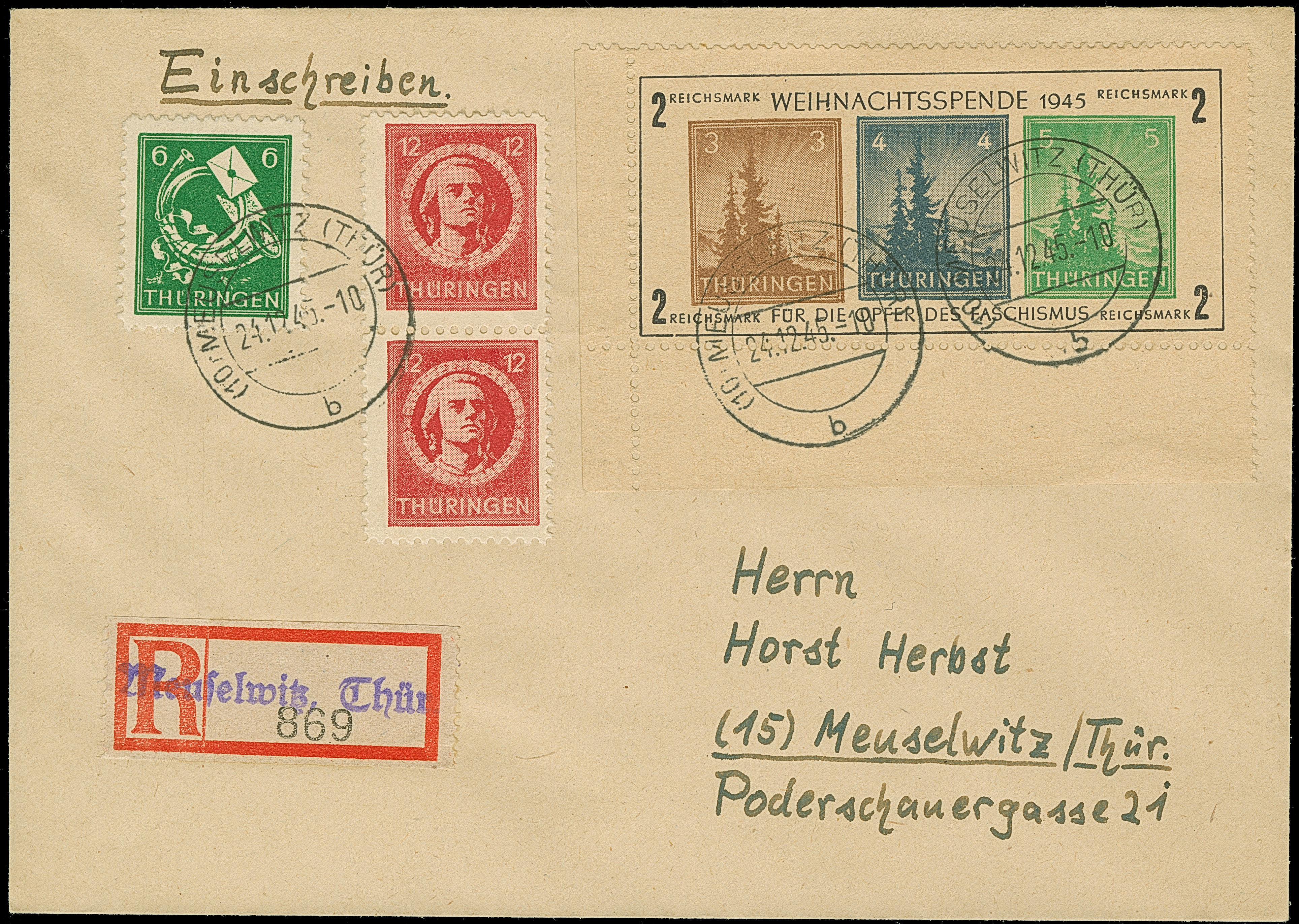 Antifa- und Weihnachtsblock auf weissem Papier, mit Stempel "MEUSELWITZ (THÜR) 24.12.45" auf philatelistischem Orts-R-Brief, mit Ankunftsstempel. Bl.1 überklebt kleinen Fremdkörper, sonst tadellos. Signiert Herbst BPP